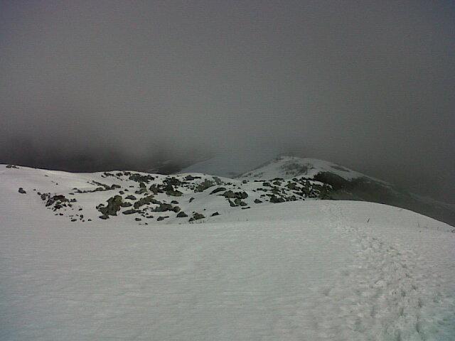 Salito fino al colle, nessuna traccia di neve. Qualche scorcio sulla Ovest del Viso, innevata dai 3000 in su, per il resto nebbie vaganti. Pochisima…