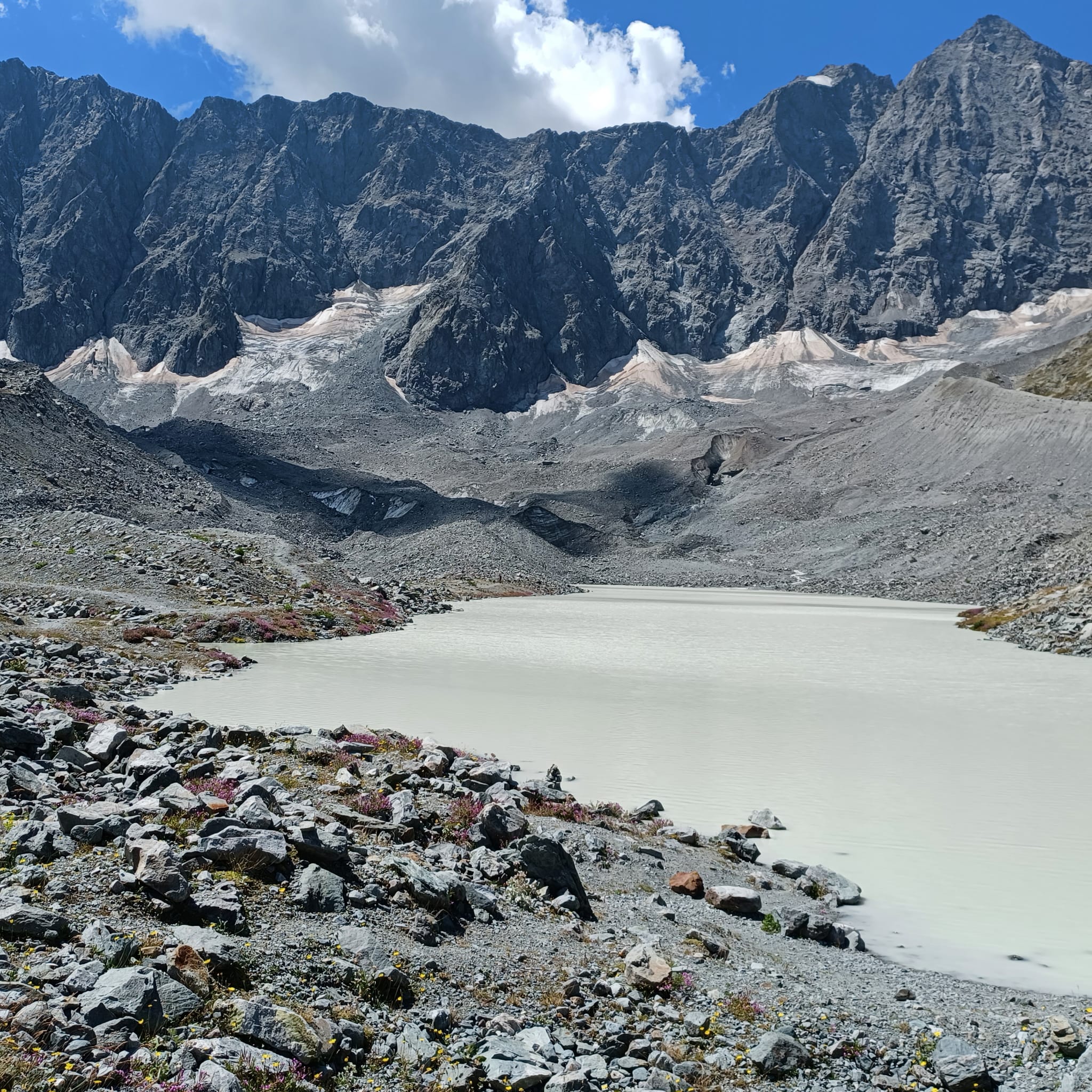 Sentier des crevasses in condizioni perfette. Saliti fino al lago. Il ghiacciaio non arriva più al lago ma è ben arretrato.