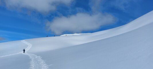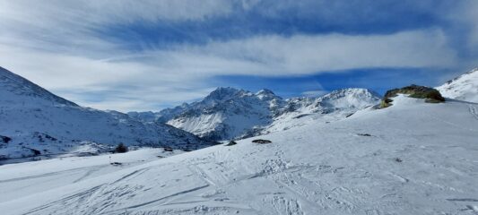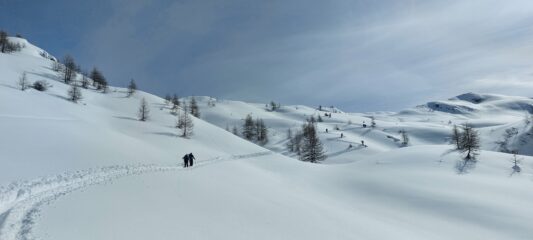 Nelle attuali condizioni le ciaspole non sono indispensabili, meglio ramponcini. Traccia ottima. Sceso al piano q 2470 e risalito al Tochuhorn.