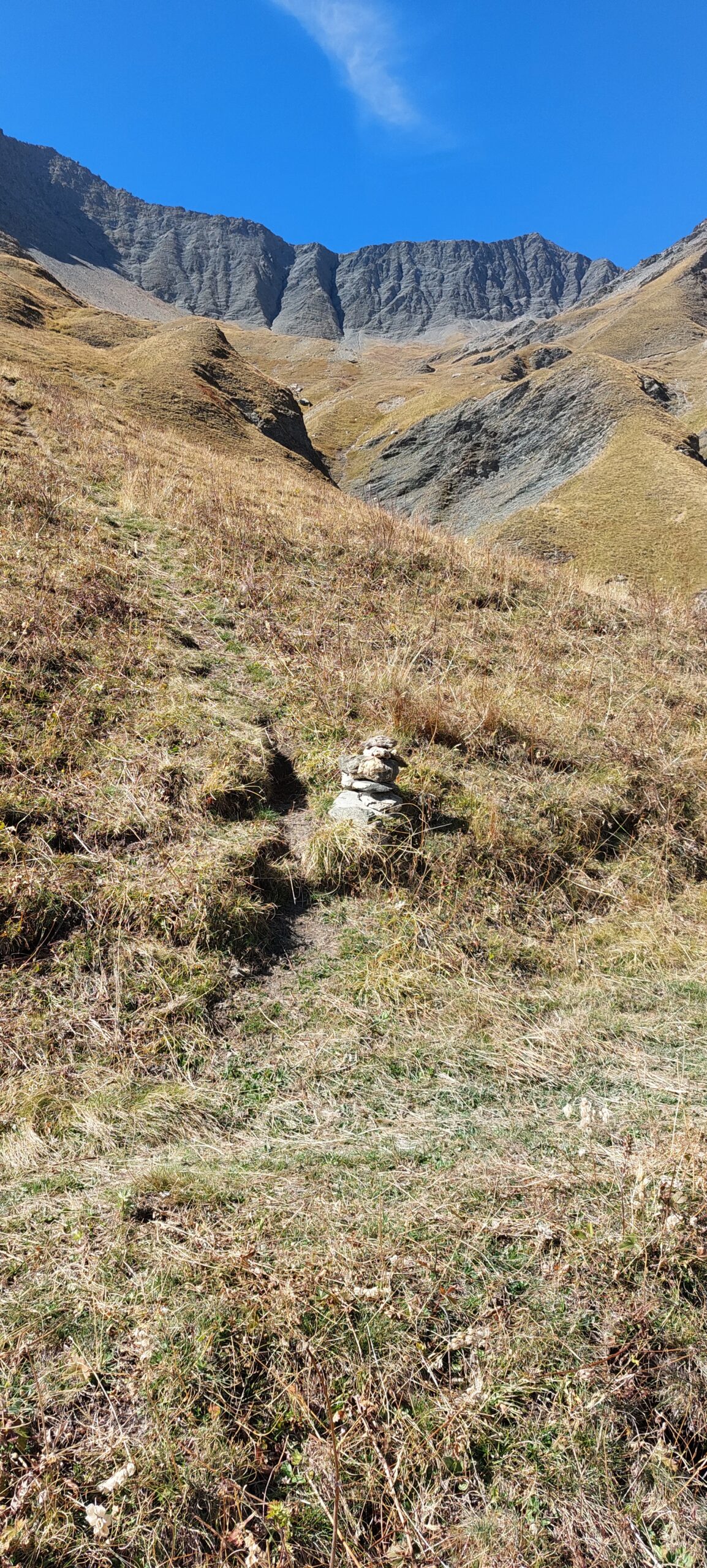 Sentiero e poi traccia ben individuabile. Inserisco la foto del primo bivio segnalato con ometto (prendere a sx) e del secondo bivio, poco sopra, anche…