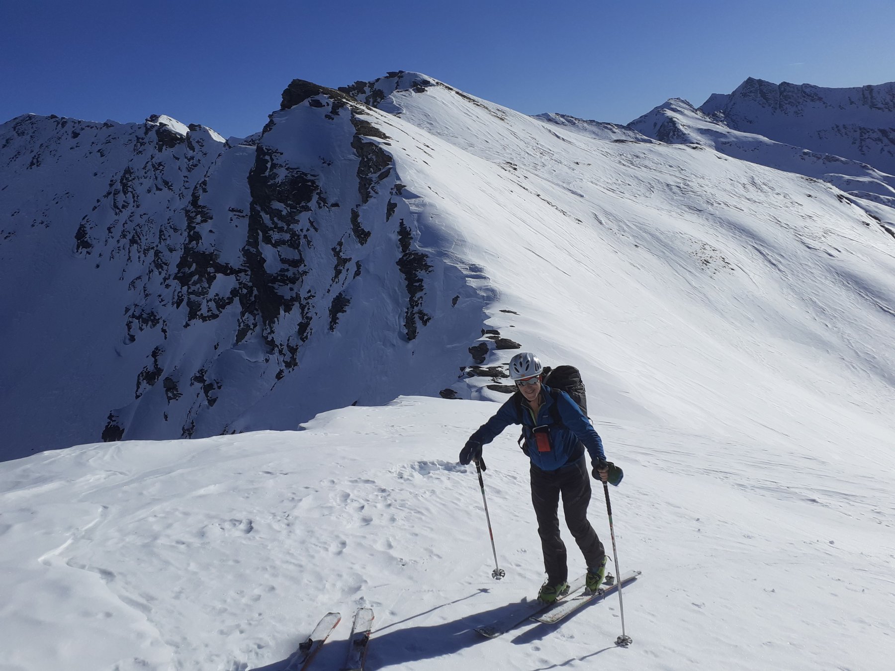 Portage di 15 minuti su stradina fino al colletto, poi neve sempre presente. Trasformata e ammorbidita dalle temperature miti di oggi. Molto godibile