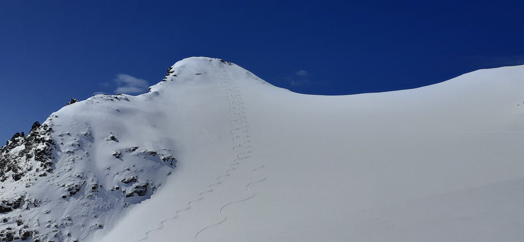 Dalla vetta neve pressata e dura sulla via normale, ma trasformata cremosa se si scia nella conca che guarda ad Ovest Sud Ovest, poi nel…