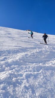La copertura nuvolosa notturna ha impedito il rigelo. Svanite le nubi temperatura mite e venticello fresco solo in punta. Neve farinosa pesante, divertente in alto,…