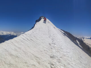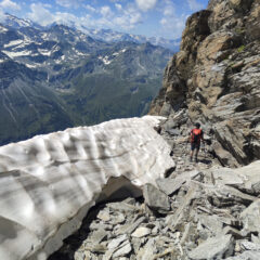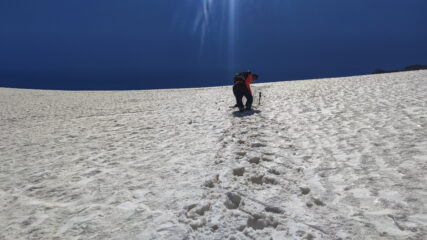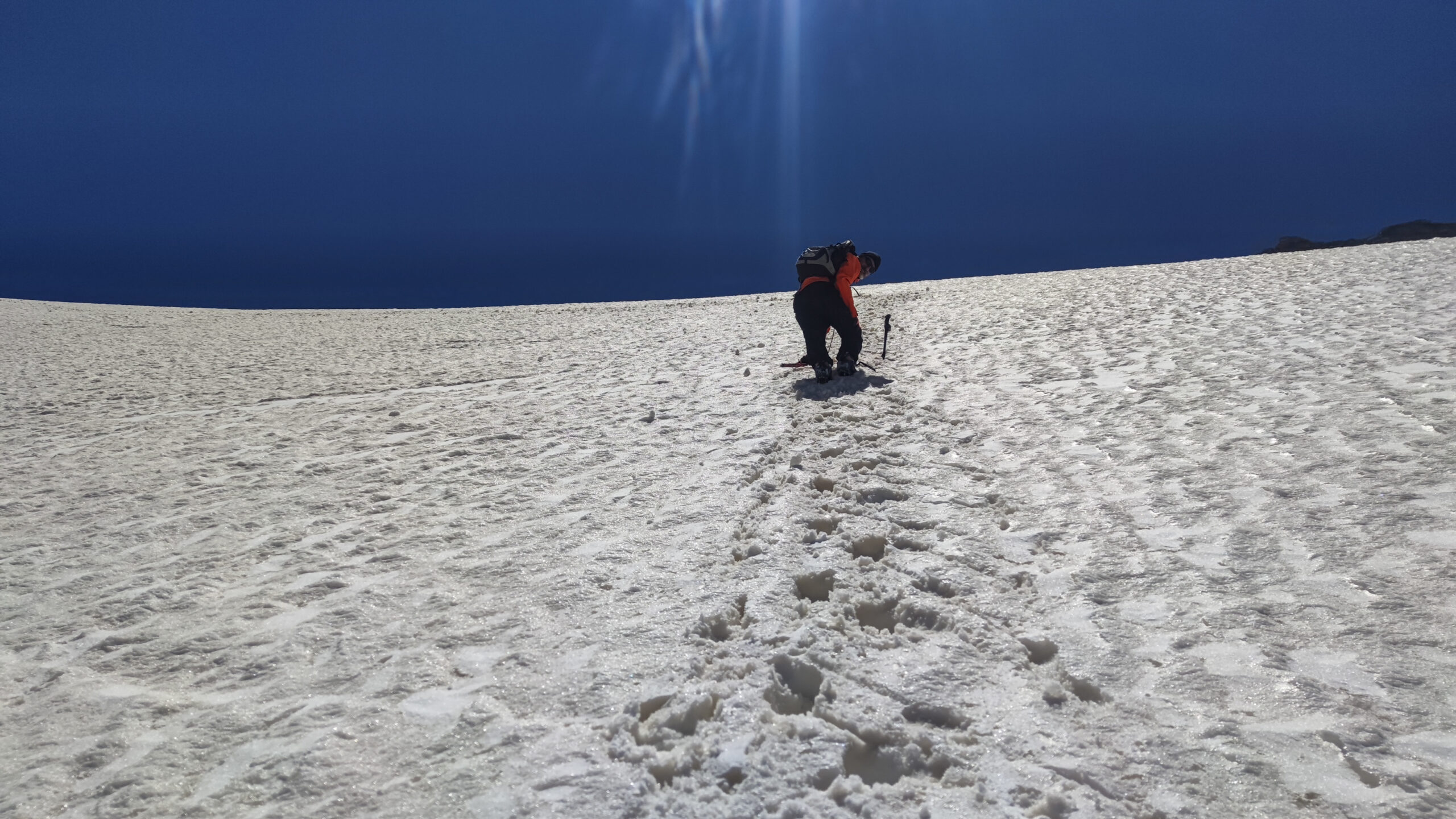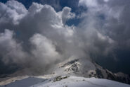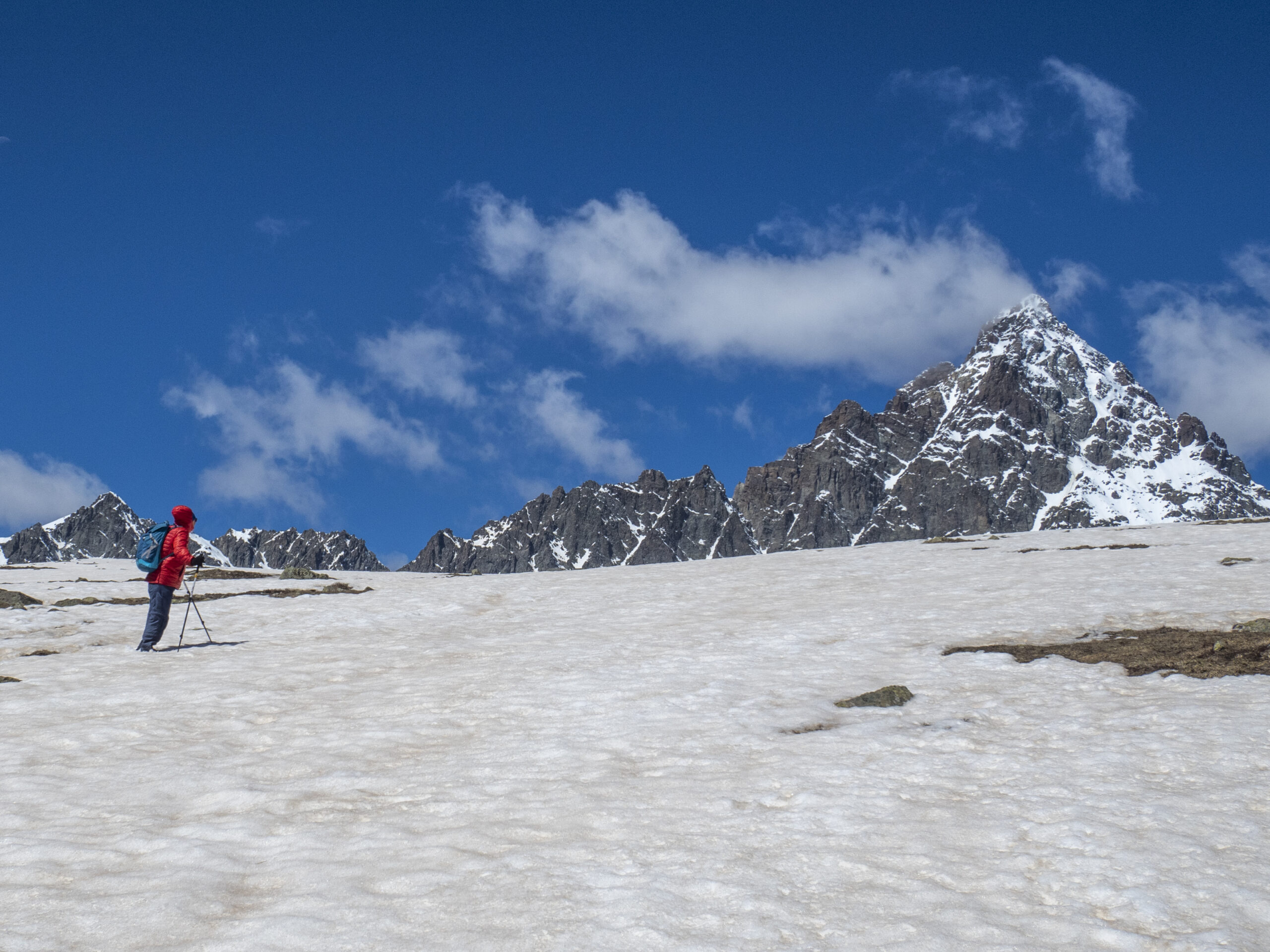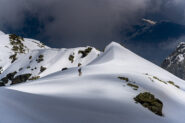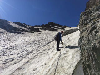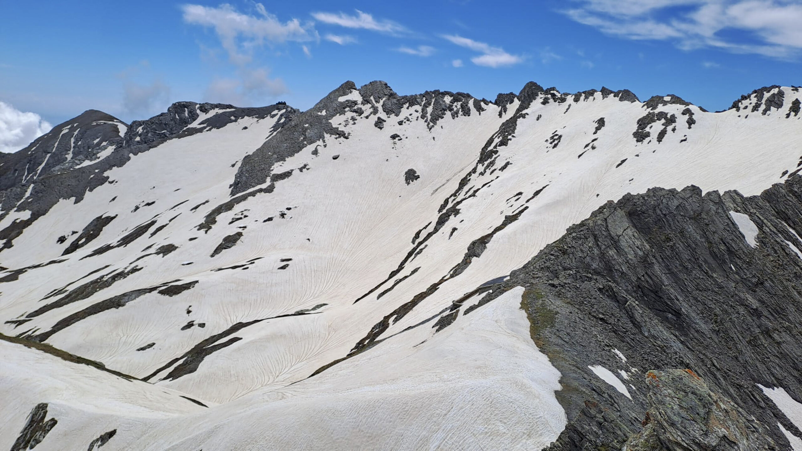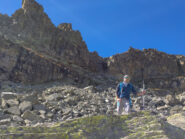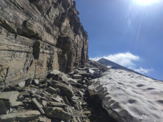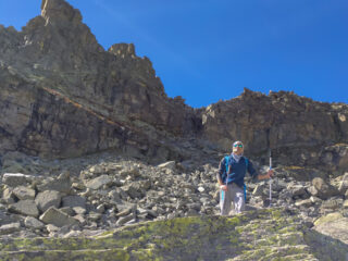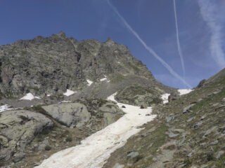 Salti bene sulla faticosa pietraia, ancora un nevaio verso la cima (evitabile)
