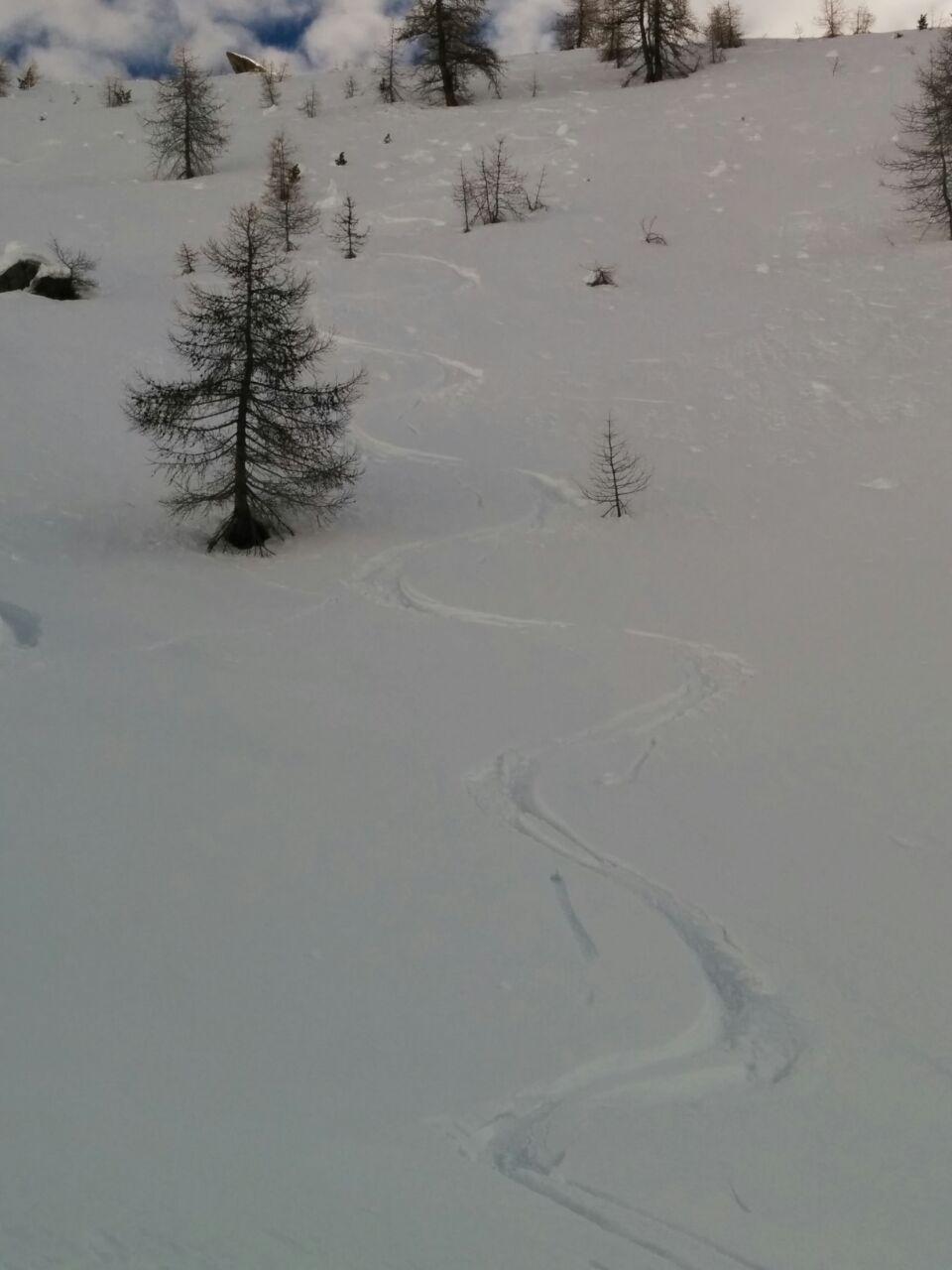 Parcheggio pattemouche gratis.salita seggiovia 7€ fino a quota 2100.parte alta crosta portante.parte bassa farina asciutta nel vallone della volpe.ripellato per arrivare al refugium