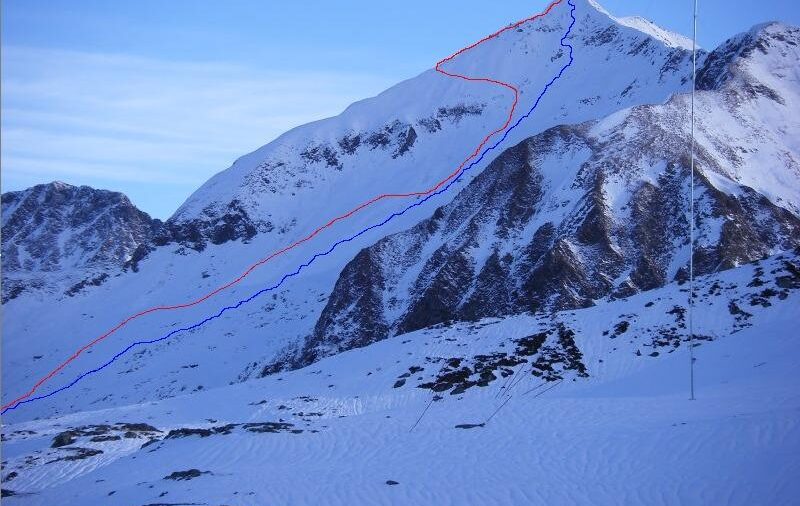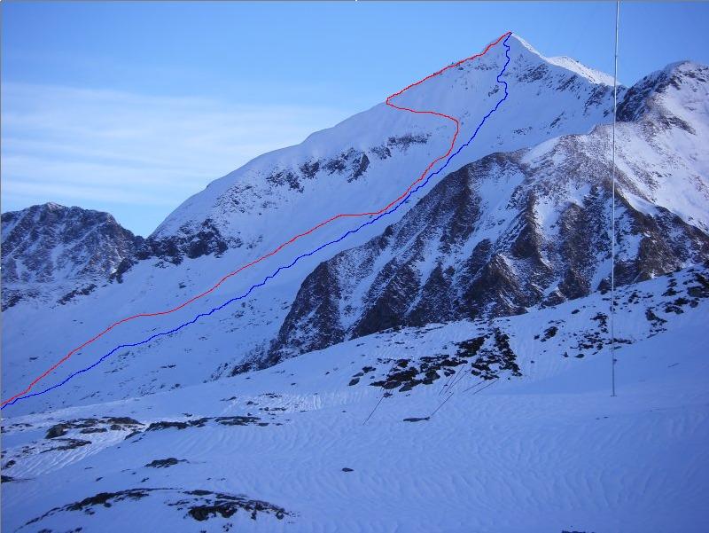 | skiador | Zoom sulla parte alta della parete Ovest | skiador | Itinerario di salita (rosso) e discesa (blu) | skiador | La piccola croce in cima sommersa dalla neve