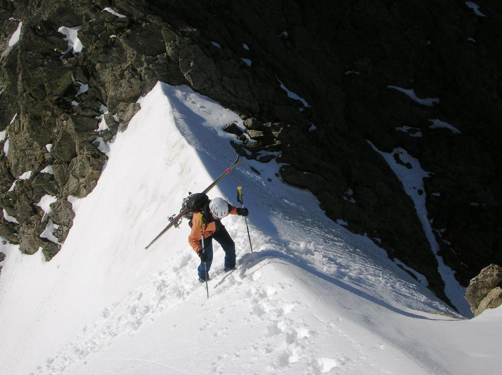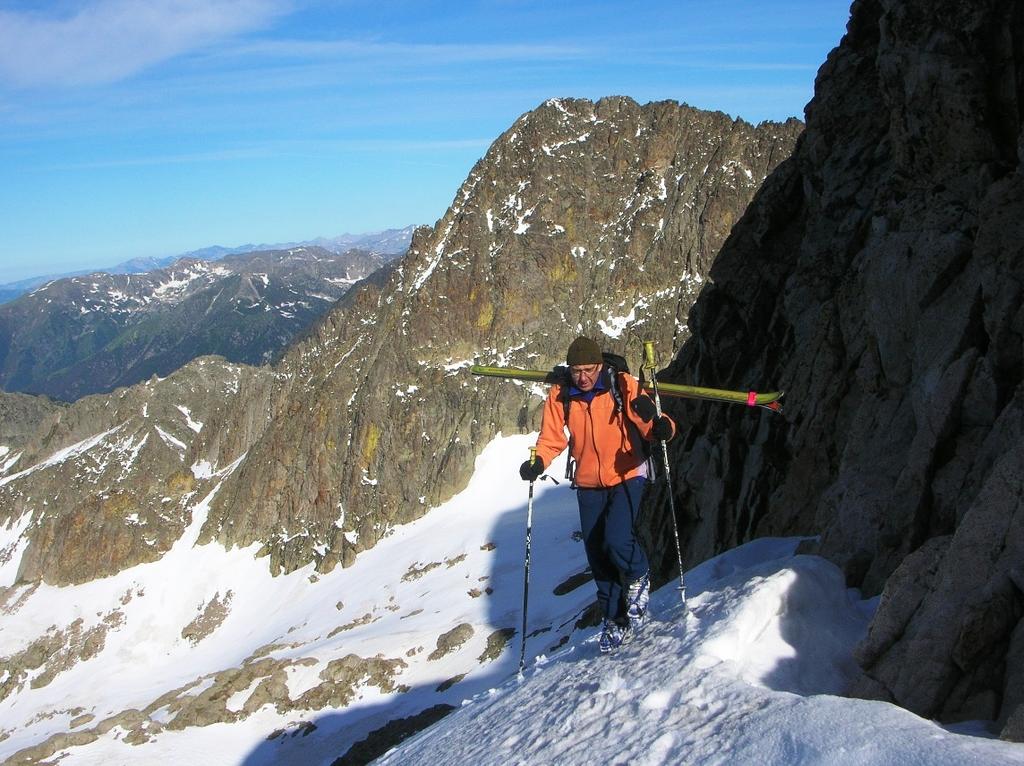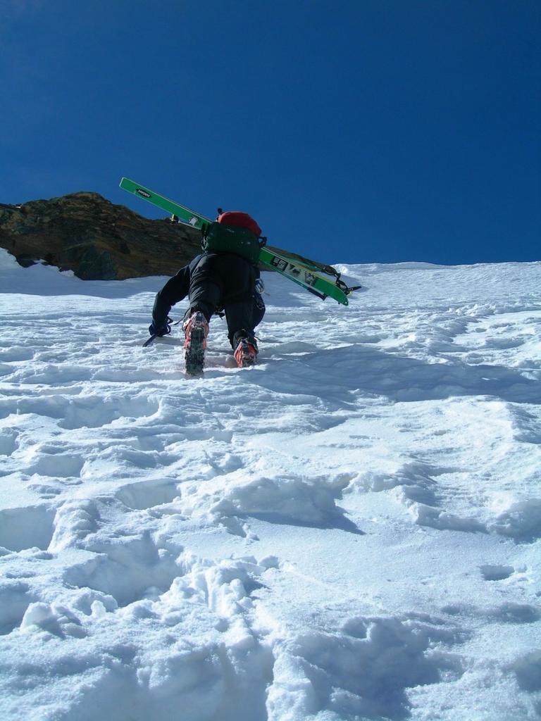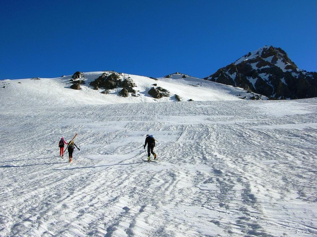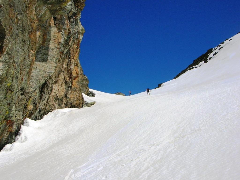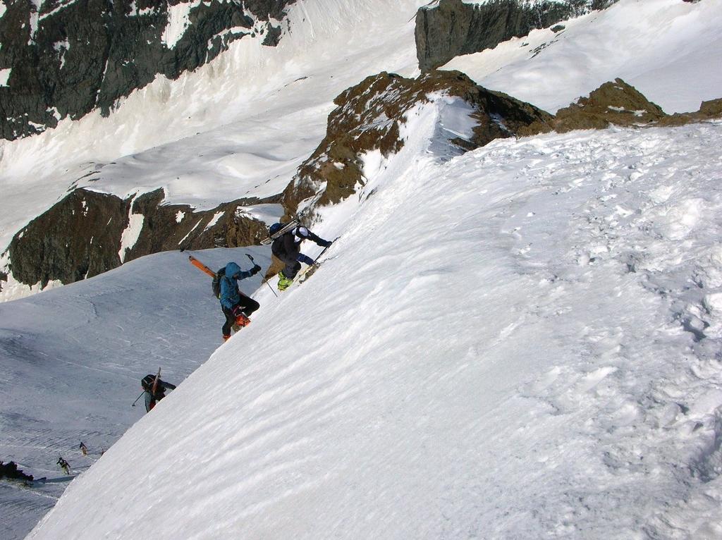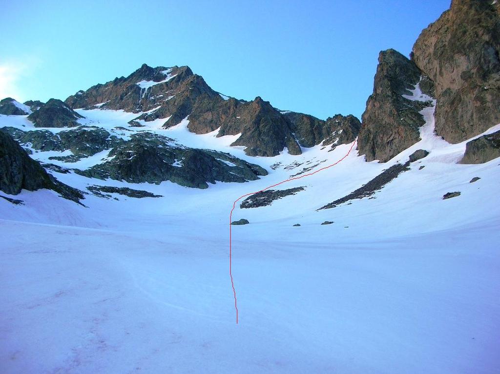 | smarchio | Poco sopra le Grange Forciaz l'innevamento si fa continuo | smarchio | Calzati i ramponi si rimonta la parete Nord | smarchio | Nella parte alta la pendeza si fa significativa... | smarchio | ... come si intuisce dalla vista di lato | smarchio | ma finalmente si giunge al colle e manca poco alla vetta | smarchio | Punta sciistica. Si vede la vetta (3607 m) e la cresta per raggiungerla, ma non il gendarme da scavalcare | smarchio | In rosso la via di salita e in blu quella di discesa