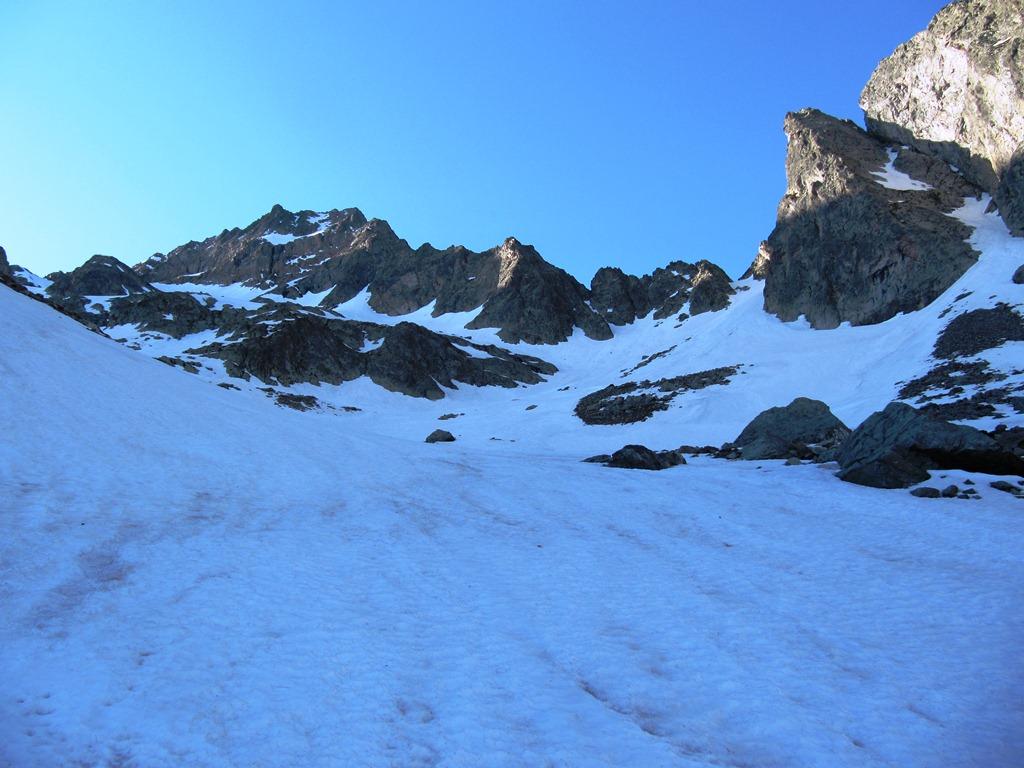 | smarchio | vista del canalone di discesa mentre salgo verso il Blais | smarchio | bivacco Blais sommerso | smarchio | lo spettacolo continua; scendendo nel vallone d'Ambin | smarchio | in vista del Sommeiller | smarchio | il canale di salita visto dalla cresta. Si vede anche il percorso nello spendito pianorosottostante la vetta | smarchio | finalmente in vetta....