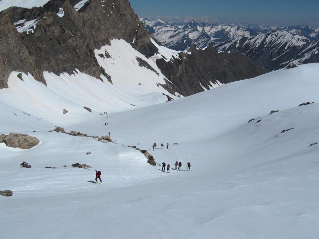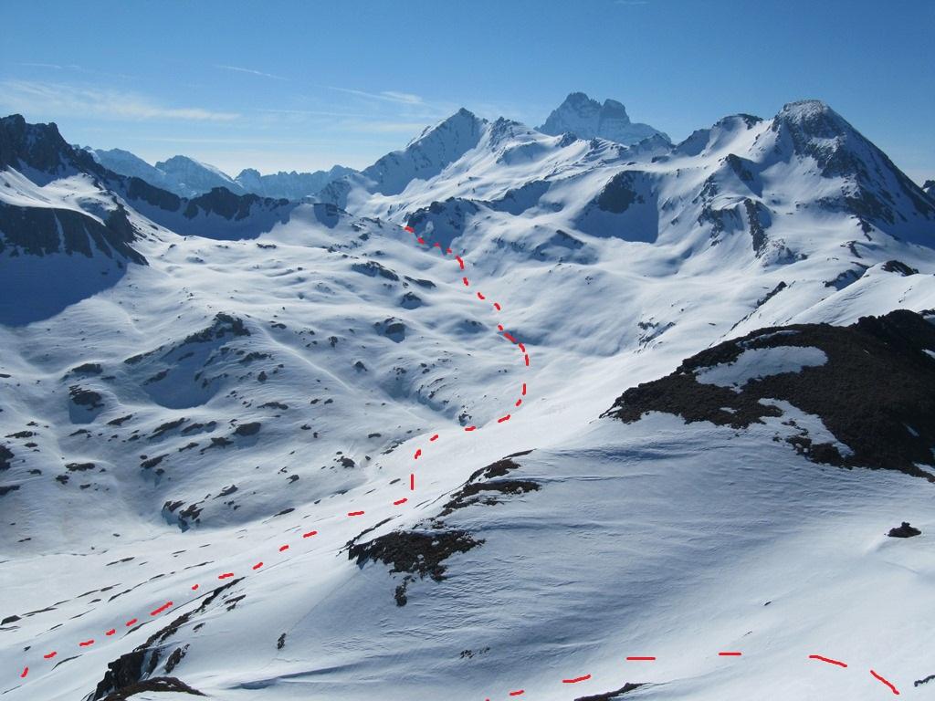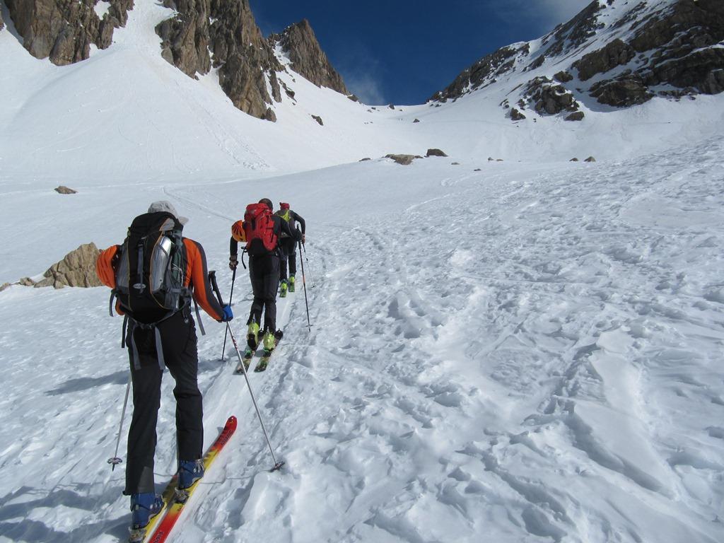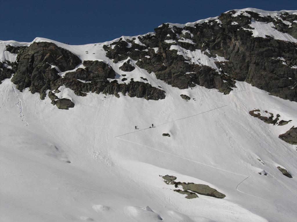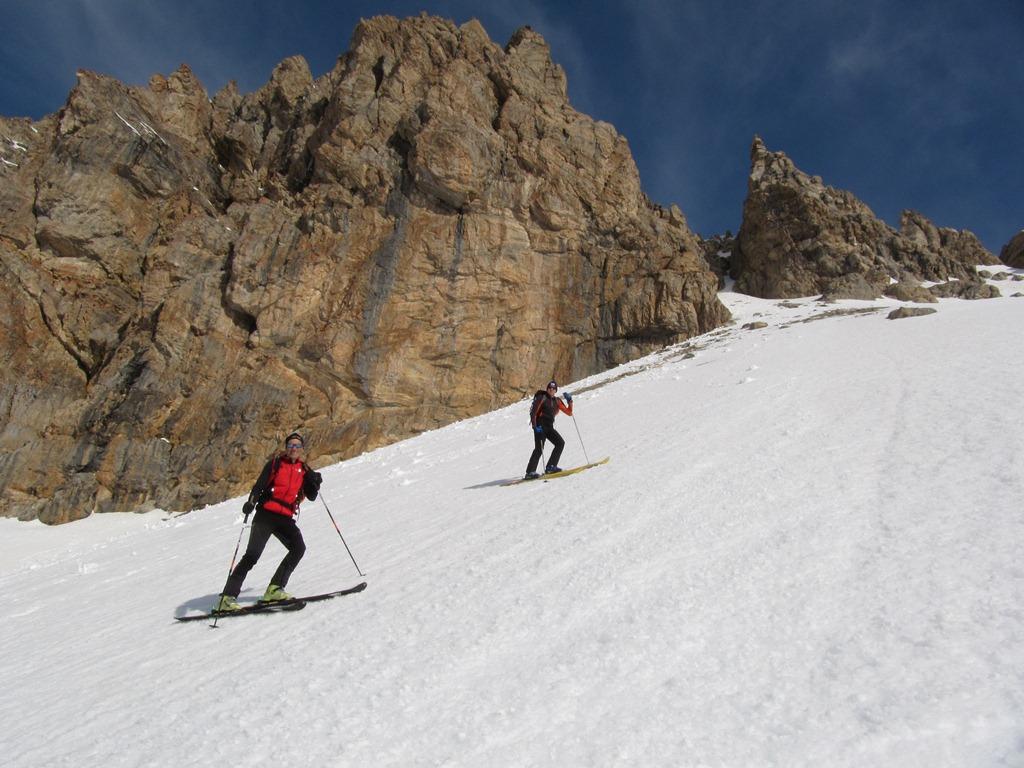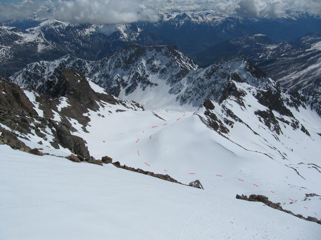 | smarchio | da q. 2700, imboccando il ripidi pendii del vallone Clapouse, veduta sull'alto Vallone del Celse Niere | smarchio | ... e del tratto appena percorso | smarchio | quasi al termine del primo tratto ripido del Vallone Clapouse | smarchio | Verso quota 2600. Fra poco svolteremo a destra per affrontare altri pendii sostenuti ed esposti a SE | smarchio | La neve è già cotta dal sole, ma terrà bene anche più tardi mentre scenderemo | smarchio | siamo quasi a q. 3000 m e guardiamo il percorso appena effettuato | smarchio | in vista della vetta. Il tratto ripido è quello proprio sotto di essa | smarchio | finalmente in vetta - sono le 12:00 | smarchio | e ci godiamo tutti il piacere della cima | smarchio | anche se dobbiamo poi ripartire.... inizia la discesa | smarchio | uno sguardo al percorso di discesa | smarchio | ed uno sguardo indietro al Vallone di Clapouse appena disceso. Ci aspettano ora i ripidi pendii che ci porteranno nel Vallone del Celse Niere | smarchio | ... che affrontiamo godendoci il firn...
