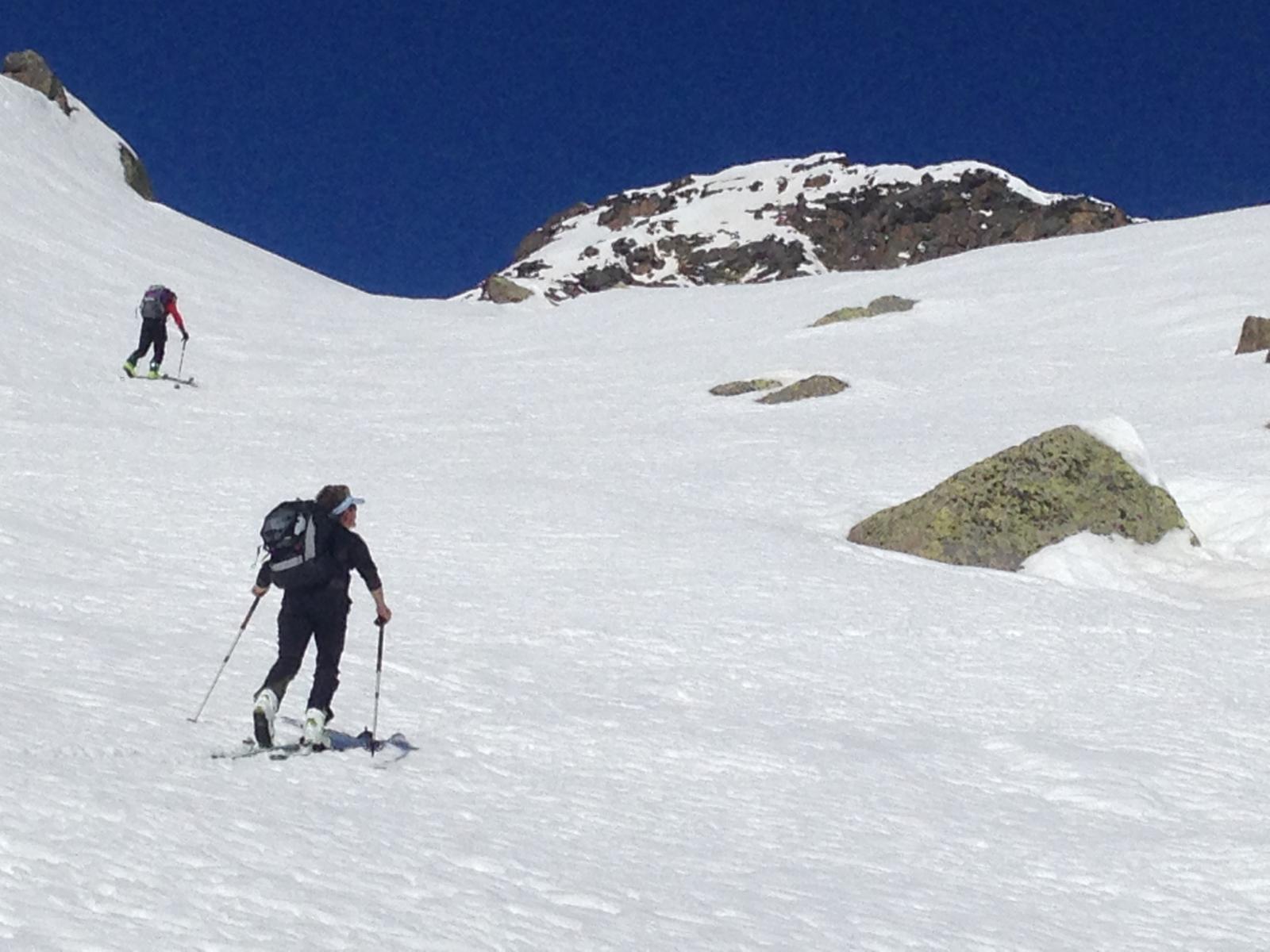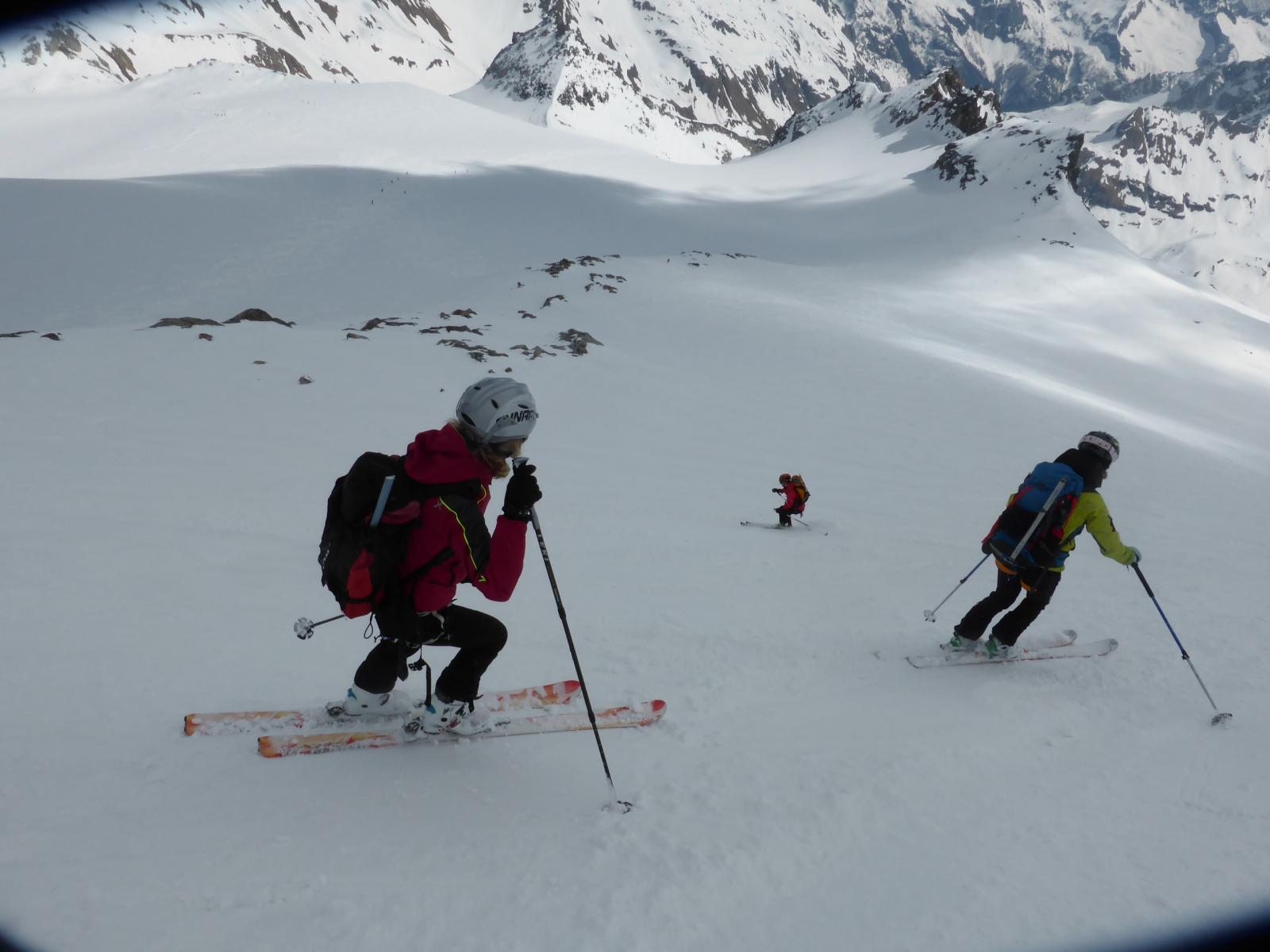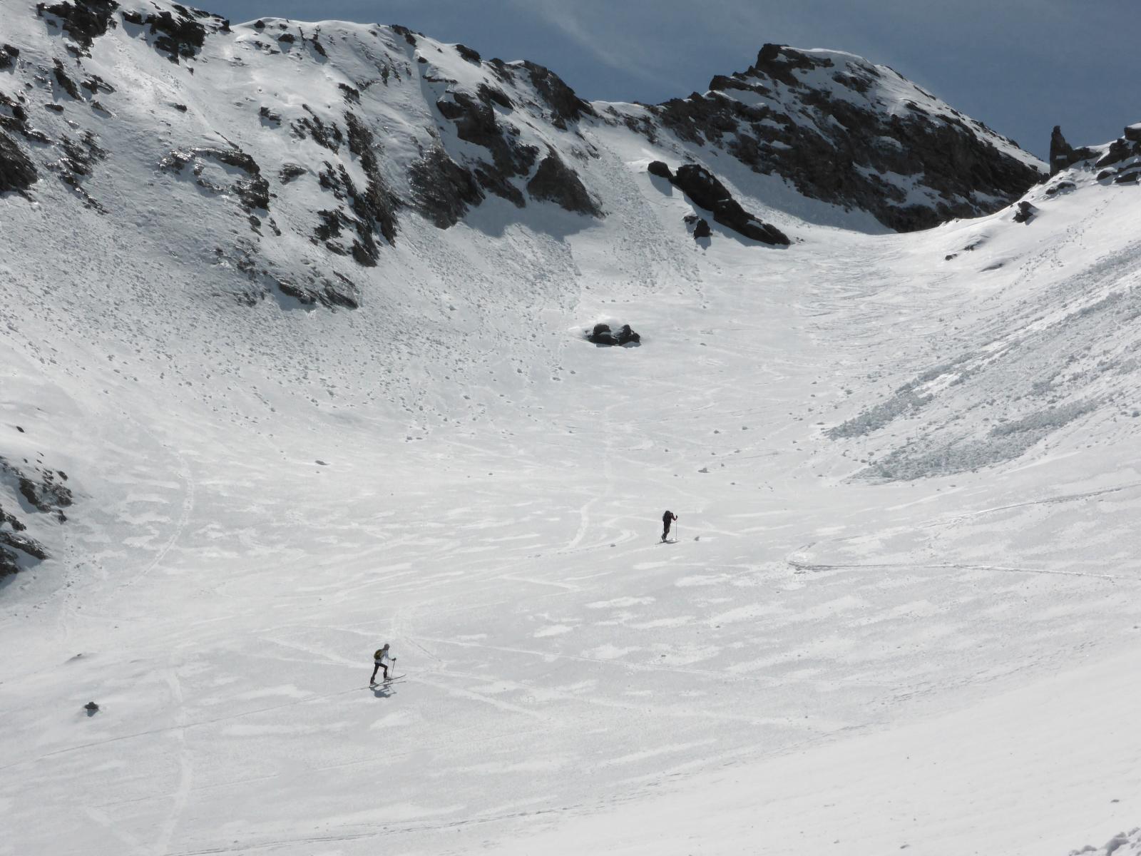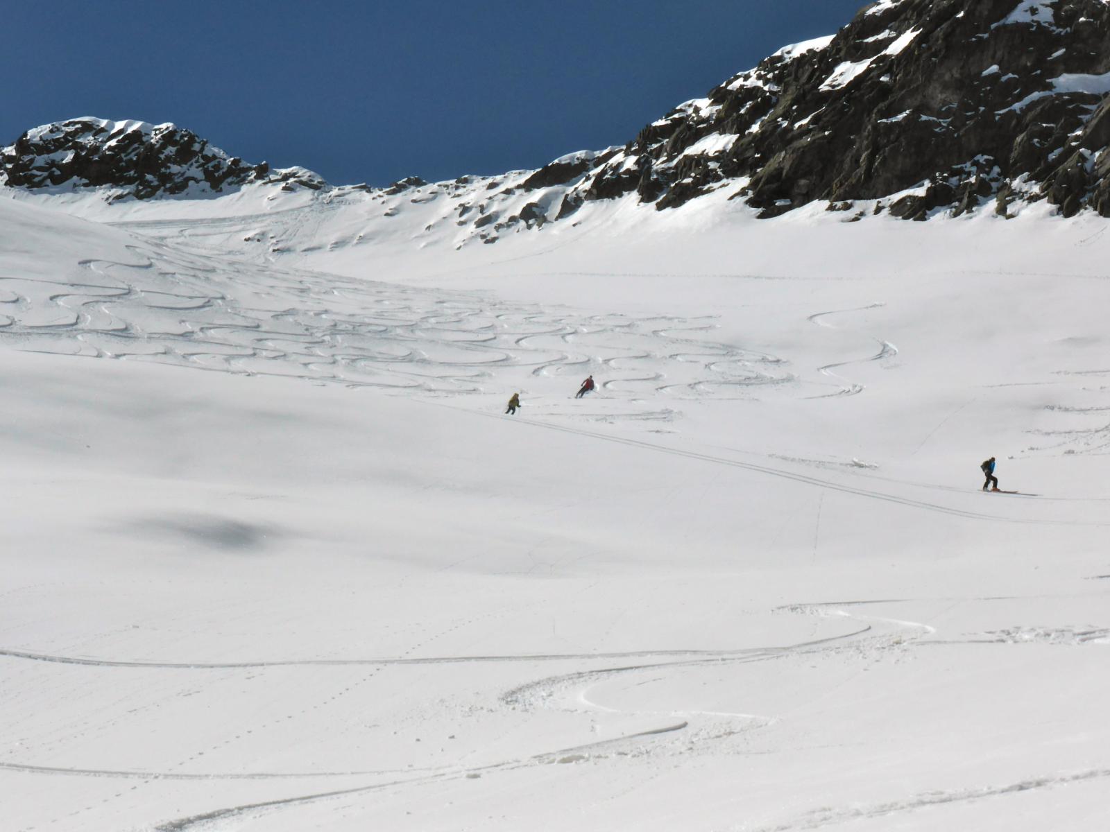 scesi dalla punta sulla spalla di sinistra , altri canale centrale , 500 -600 mt favolosi su fondo duro , pendio ampio dove si concatenano…