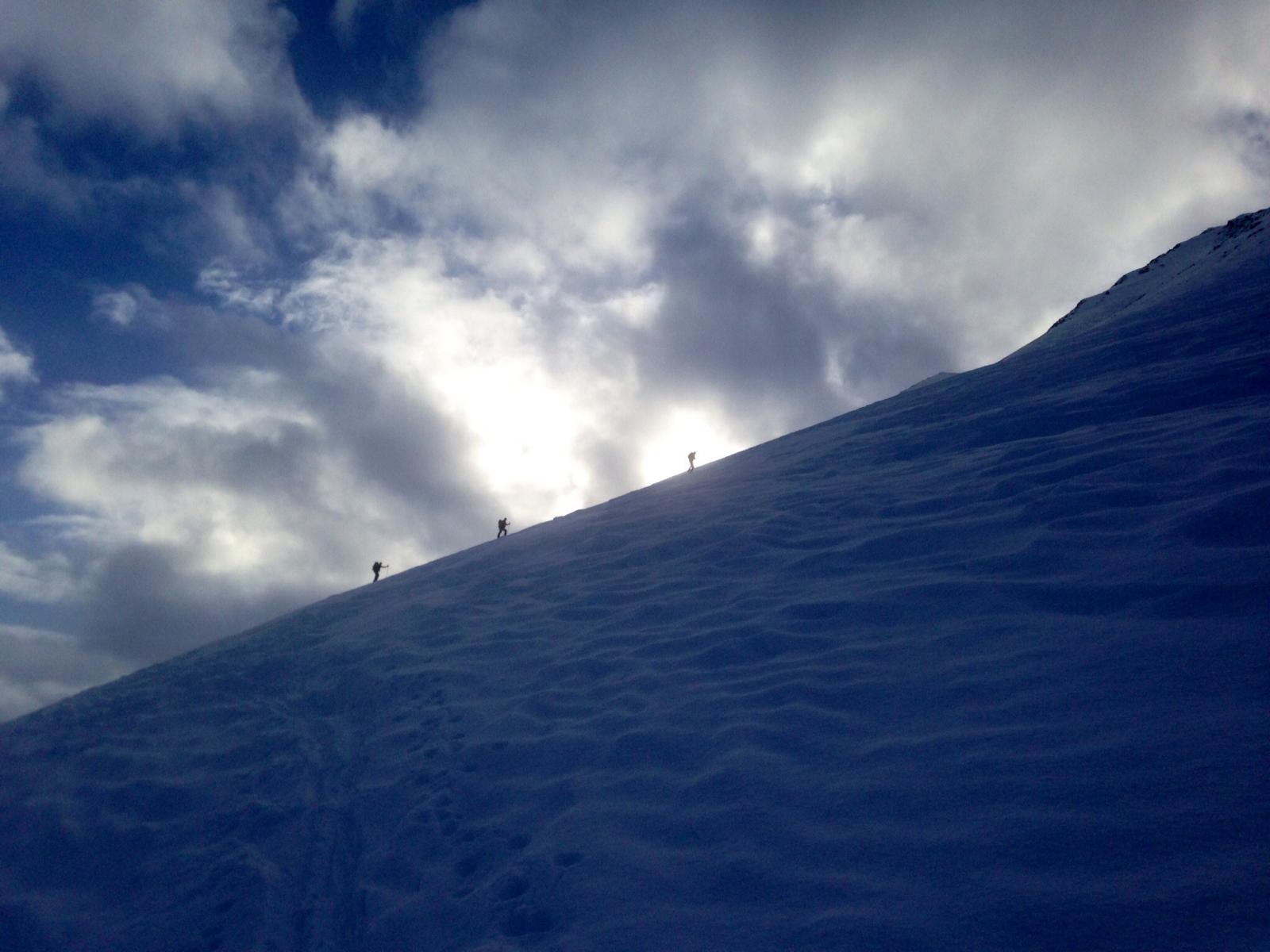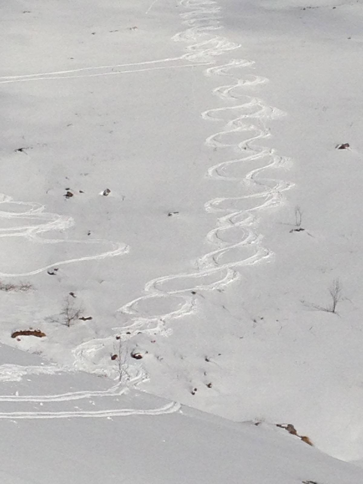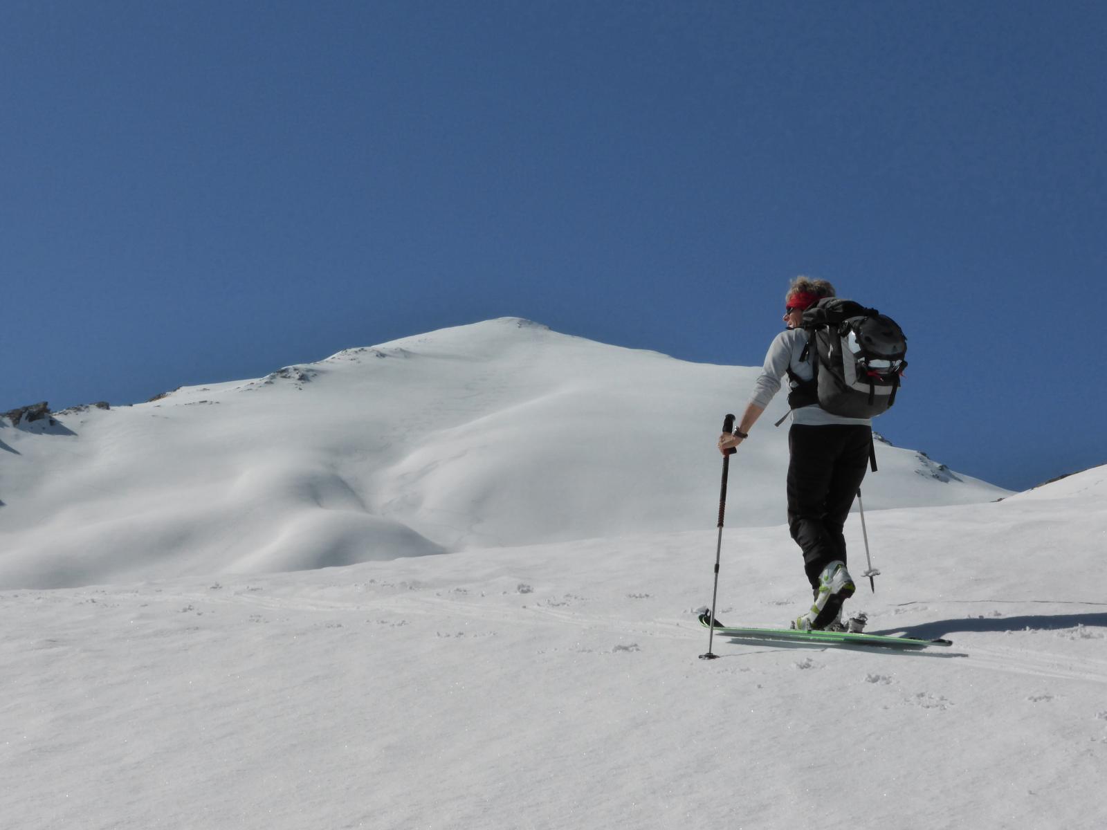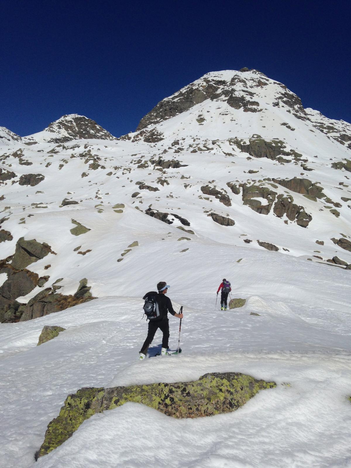 scesi dalla punta sulla spalla di sinistra , altri canale centrale , 500 -600 mt favolosi su fondo duro , pendio ampio dove si concatenano…
