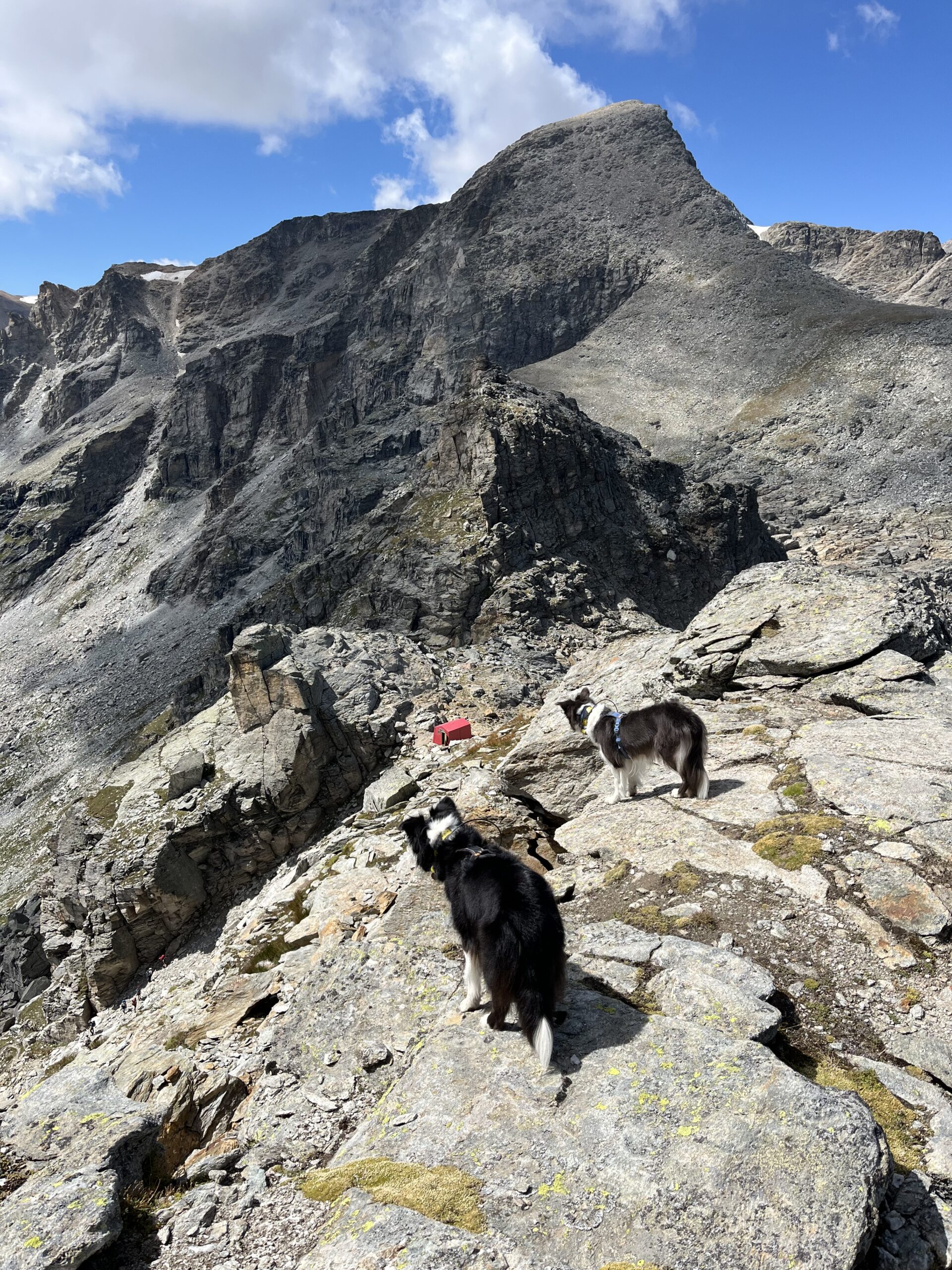 Poco dopo la salita dal bivacco Blais, la via si mantiene leggermente sulla sinistra della cresta. È indicata dagli ometti, ma non è facilissimo individuarla…