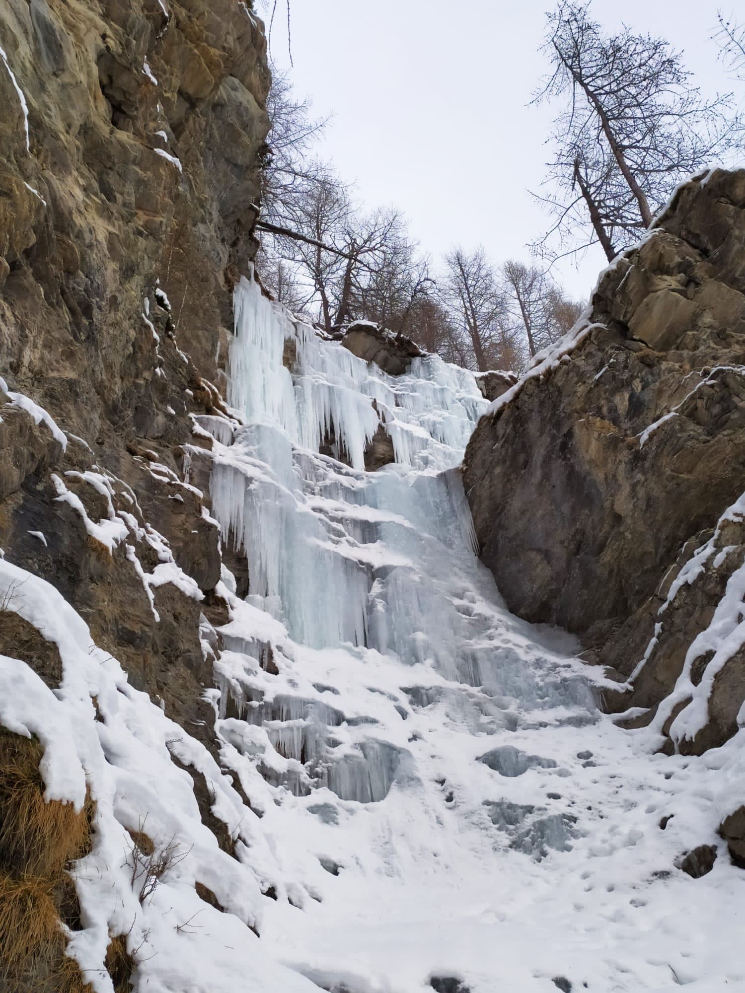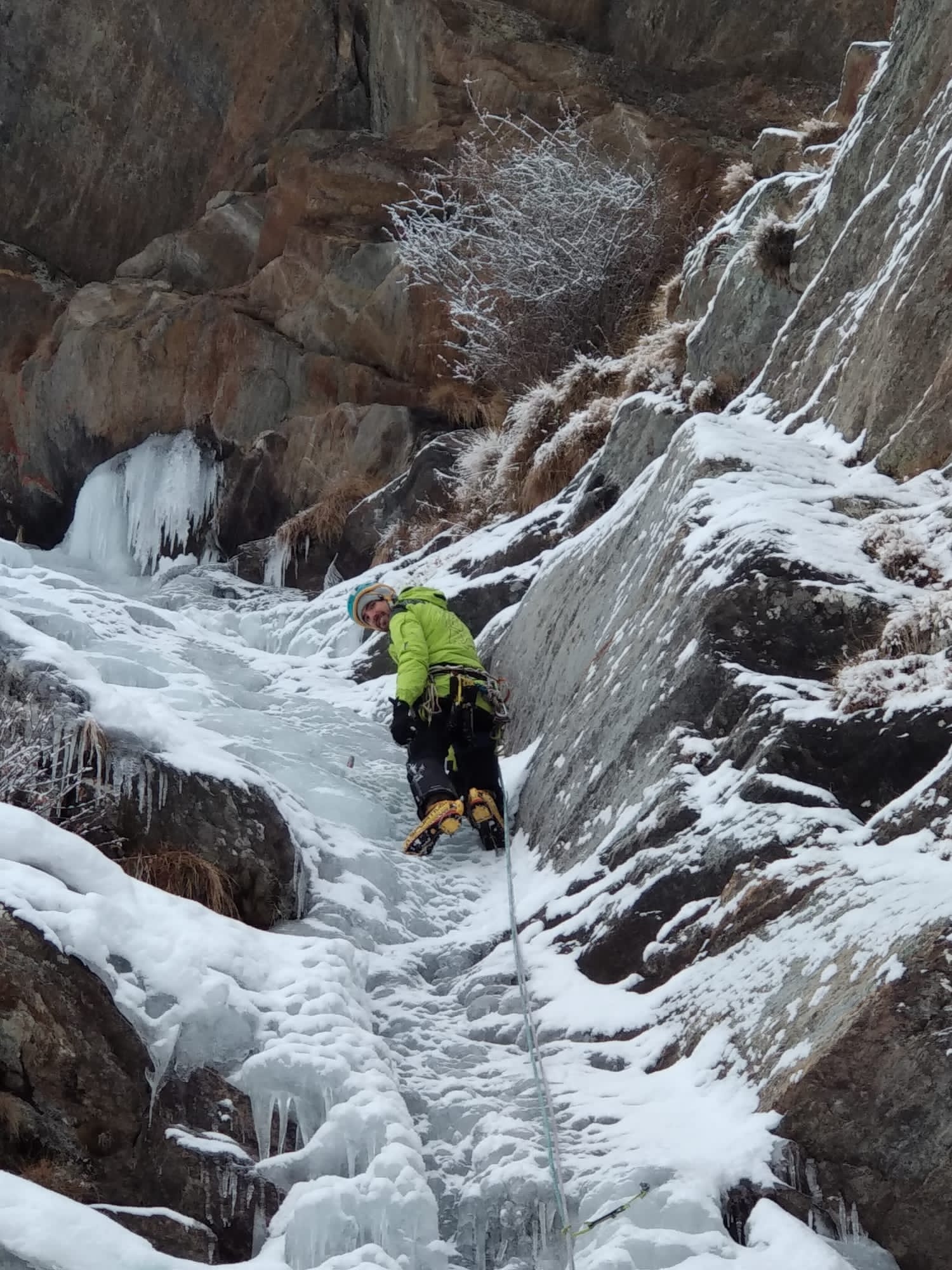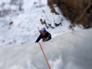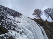 Sempre una piacevole cascata. Il primo tiro su ghiaccio bagnato poi sosta a spit sulla dx. Secondo salto magretto e più tosto del solito, verticale…