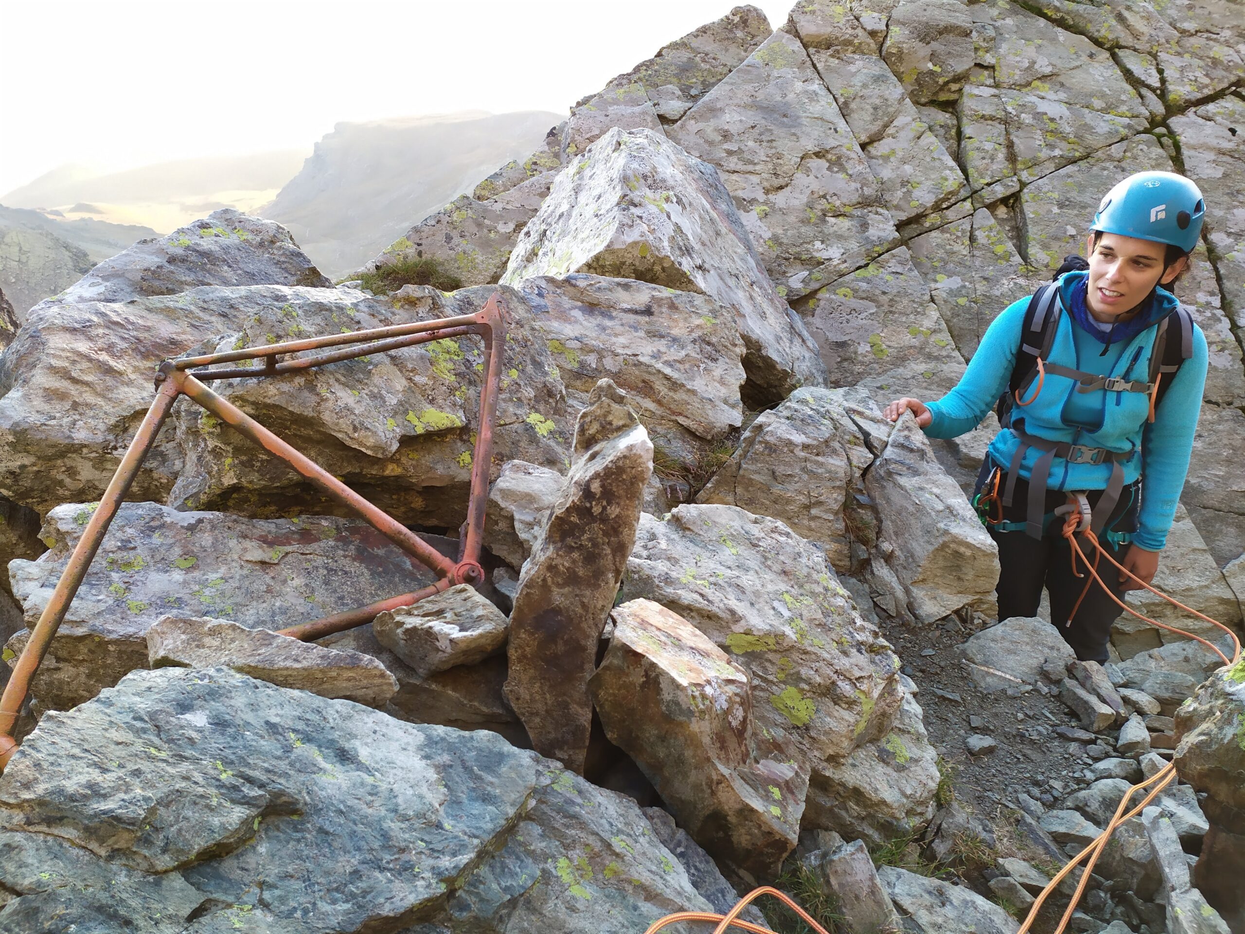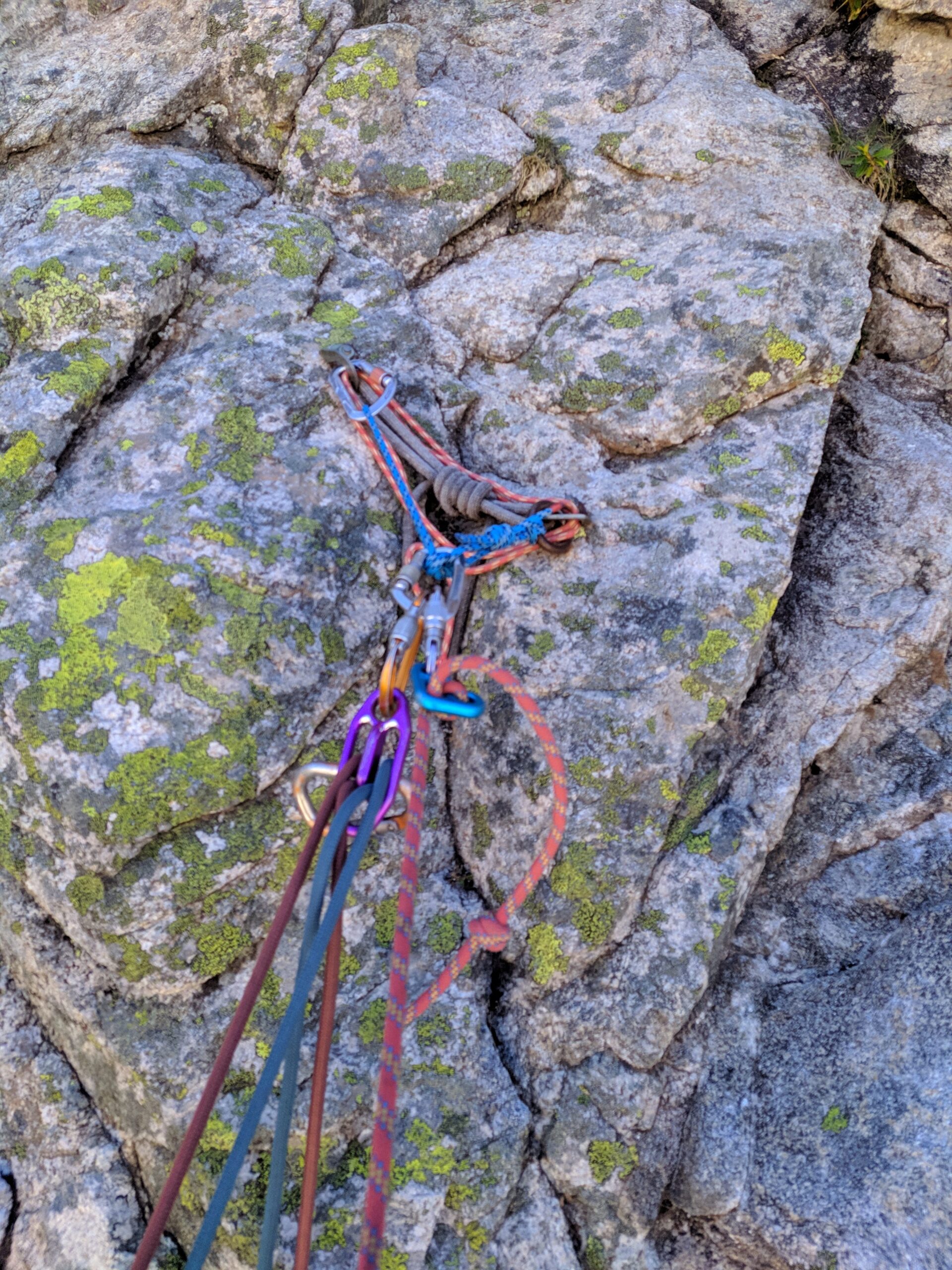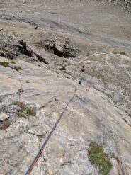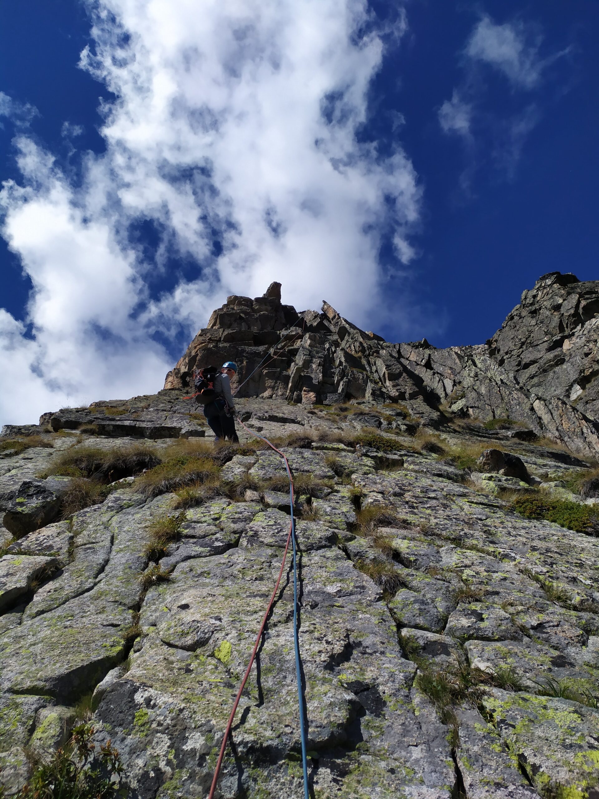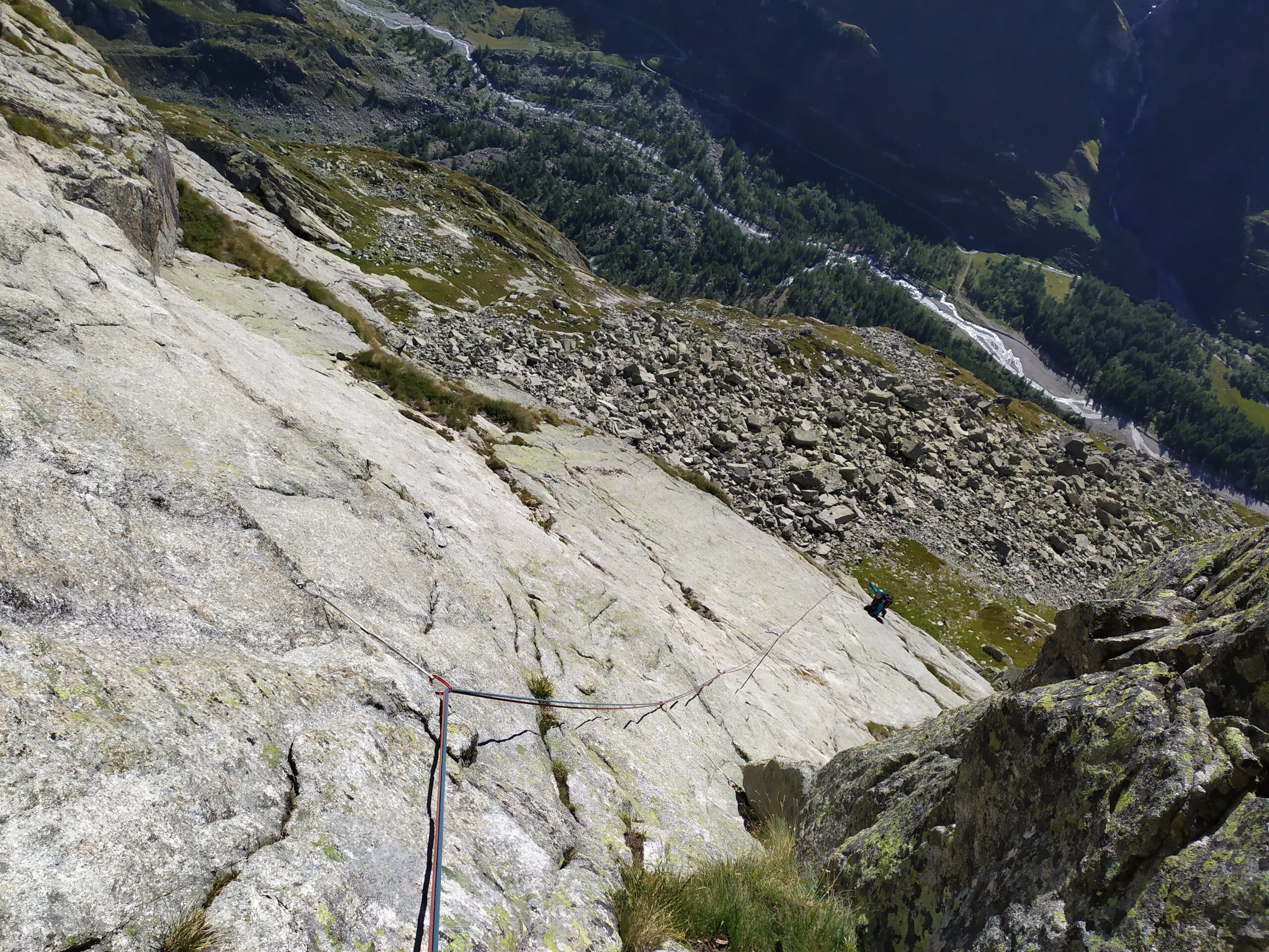 Una delle vie che mi sono piaciute di più in Ailefroide! Bellissimi i tiri dopo il traverso. Doppie veloci nel canalone (collegate con cordino rosso ben visibile),…