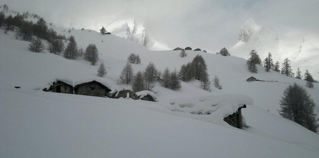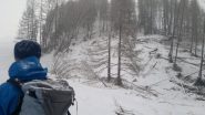 Partiti dal primo tornante dopo la chiesa. Siamo saliti fino all'ultima baita, con forte nevicata in corso, su traccia ancora visibile. In discesa neve da…