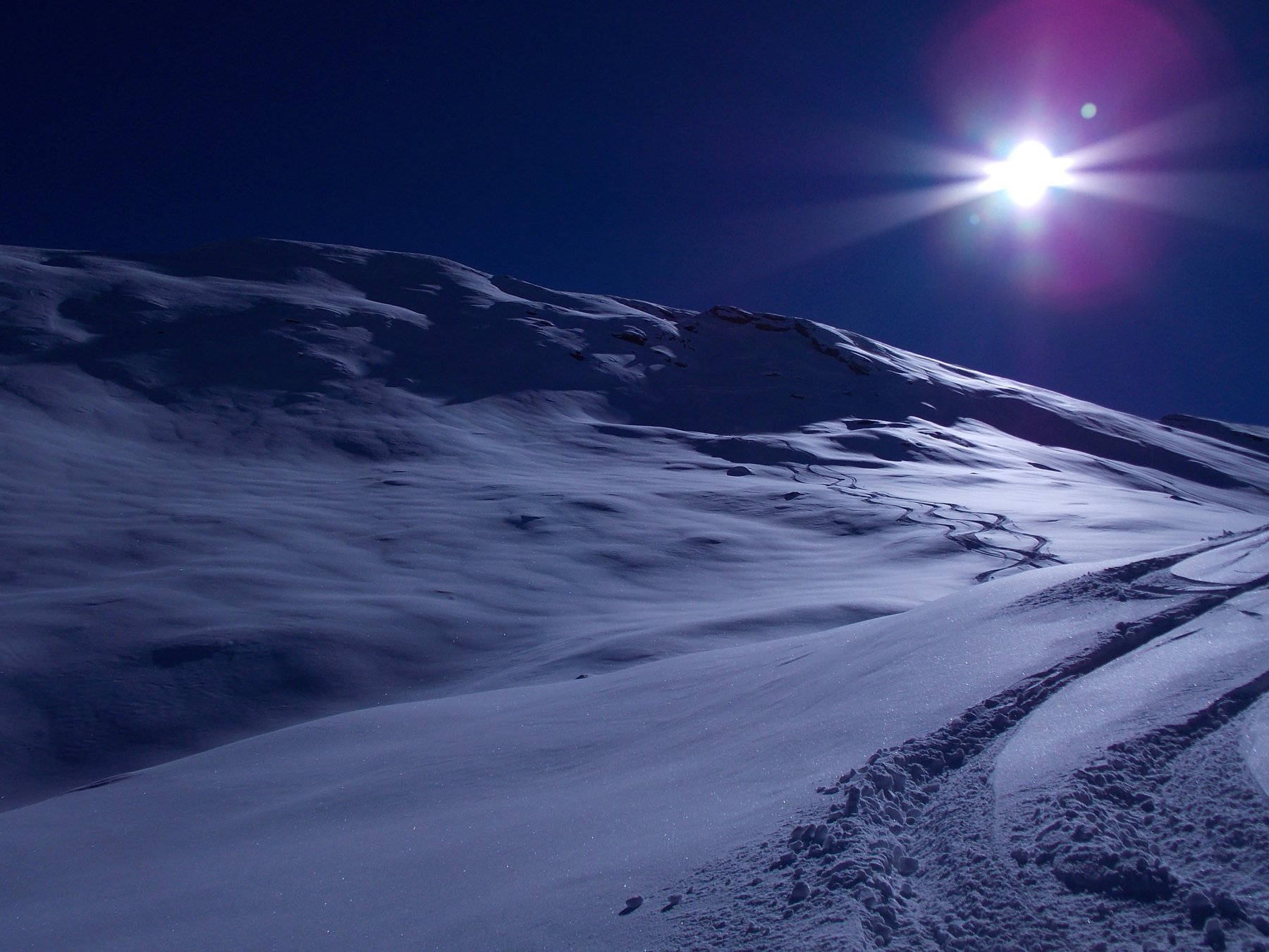 Giornata con bel tempo e senza vento. Salita su traccia esistente. Discesa diretta su Pian Gelassa su farina, da qui in giù e praticamente impossibile…