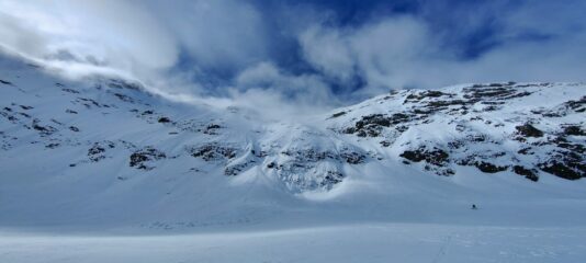 Avvicinmaento al bivacco piuttosto lungo complice lo zaino con gli sci appresso e lo sviluppo non proprio trascurabile. Una volta arrivati all'uscita dell'ultima barra rocciosa…