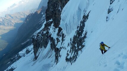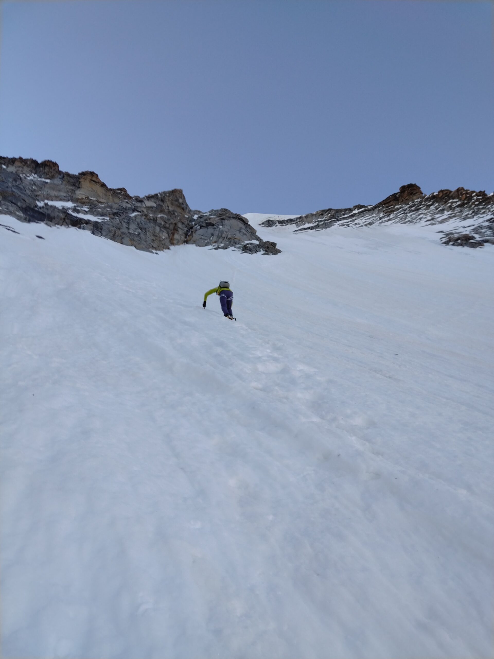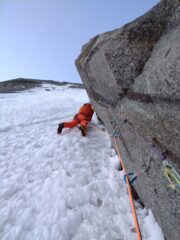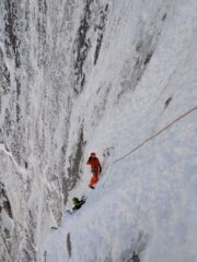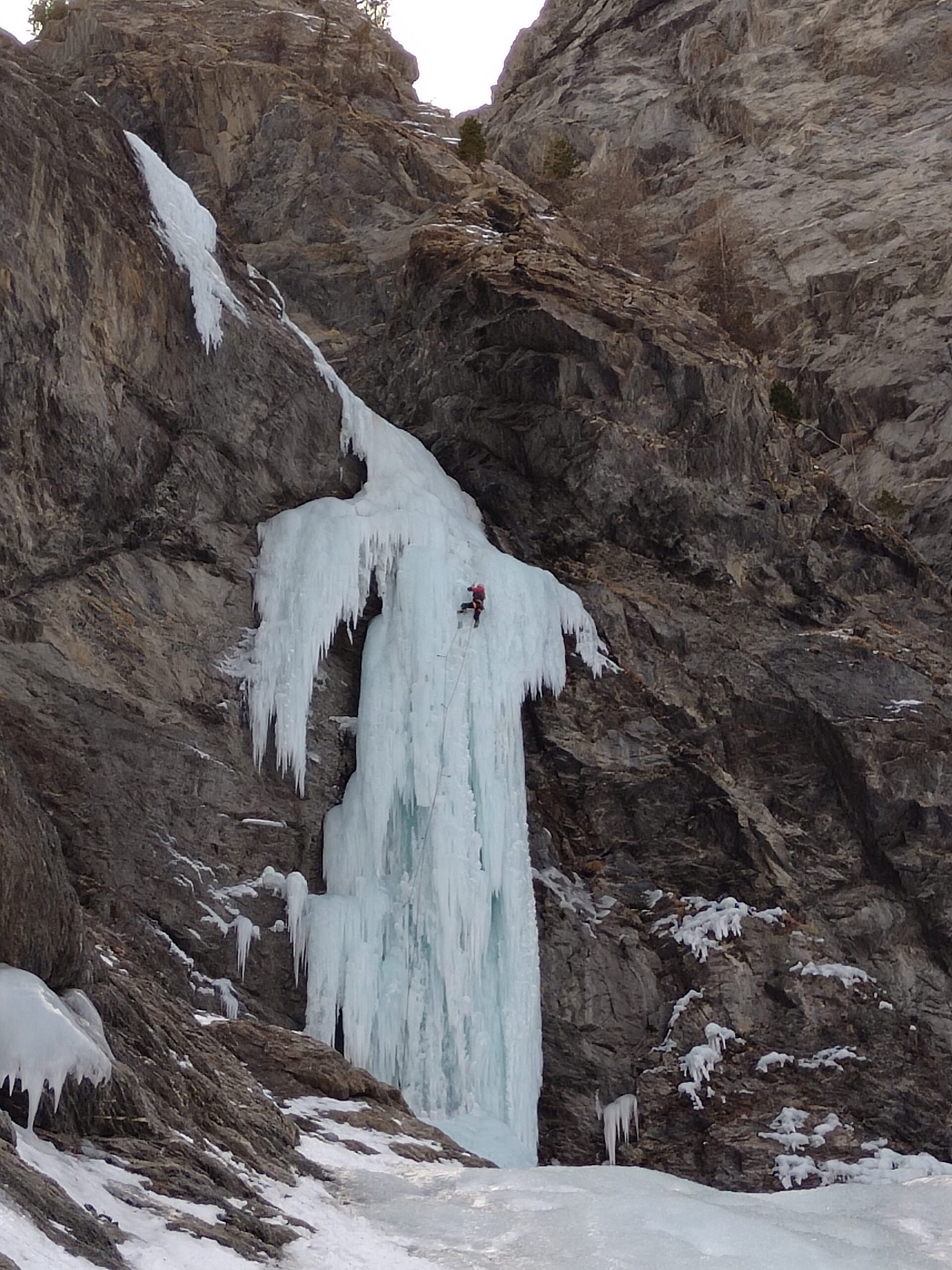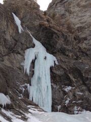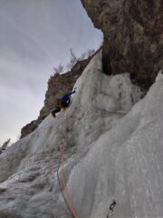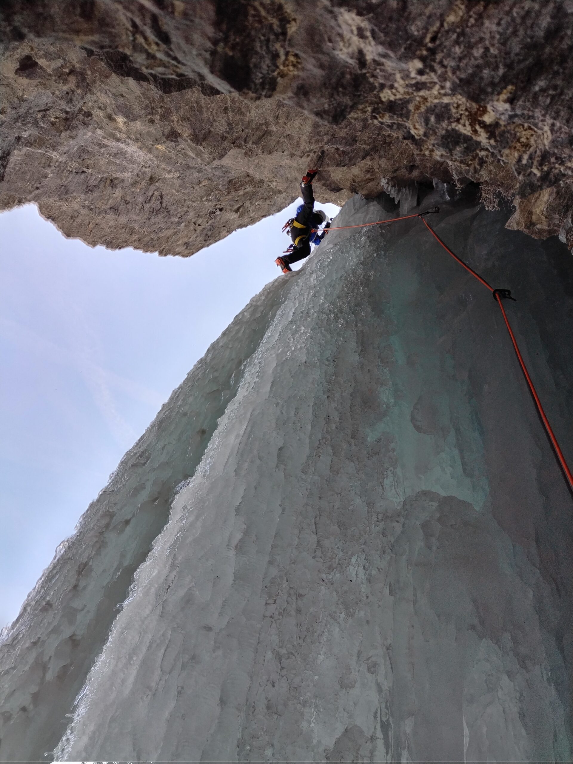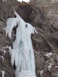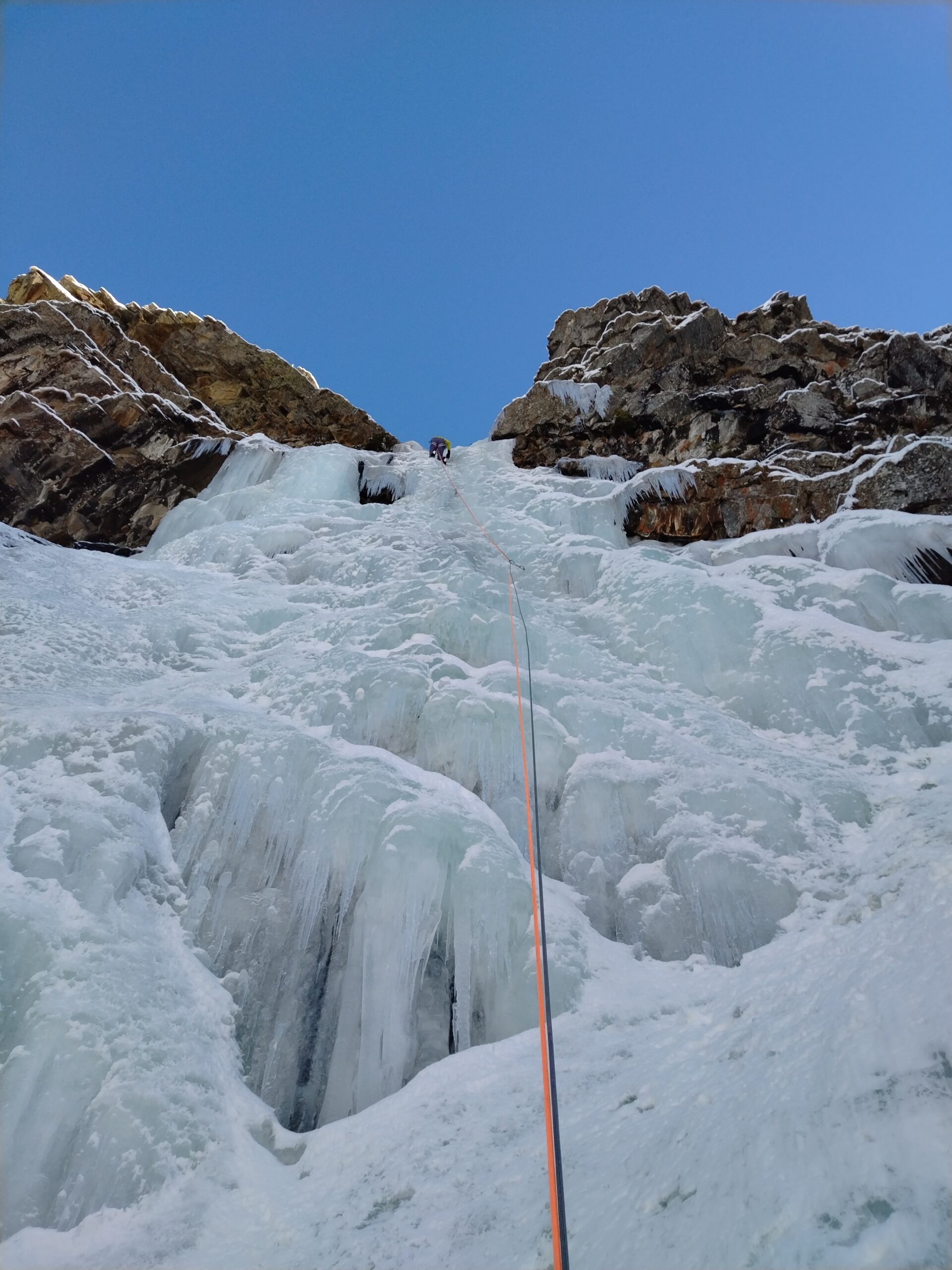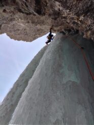 Buona traccia per l'attacco. Tiro unico preso da un buco per il passaggio sul lato sinistro, più solido del destro che era bagnato. Bel ghiaccio…