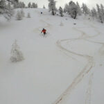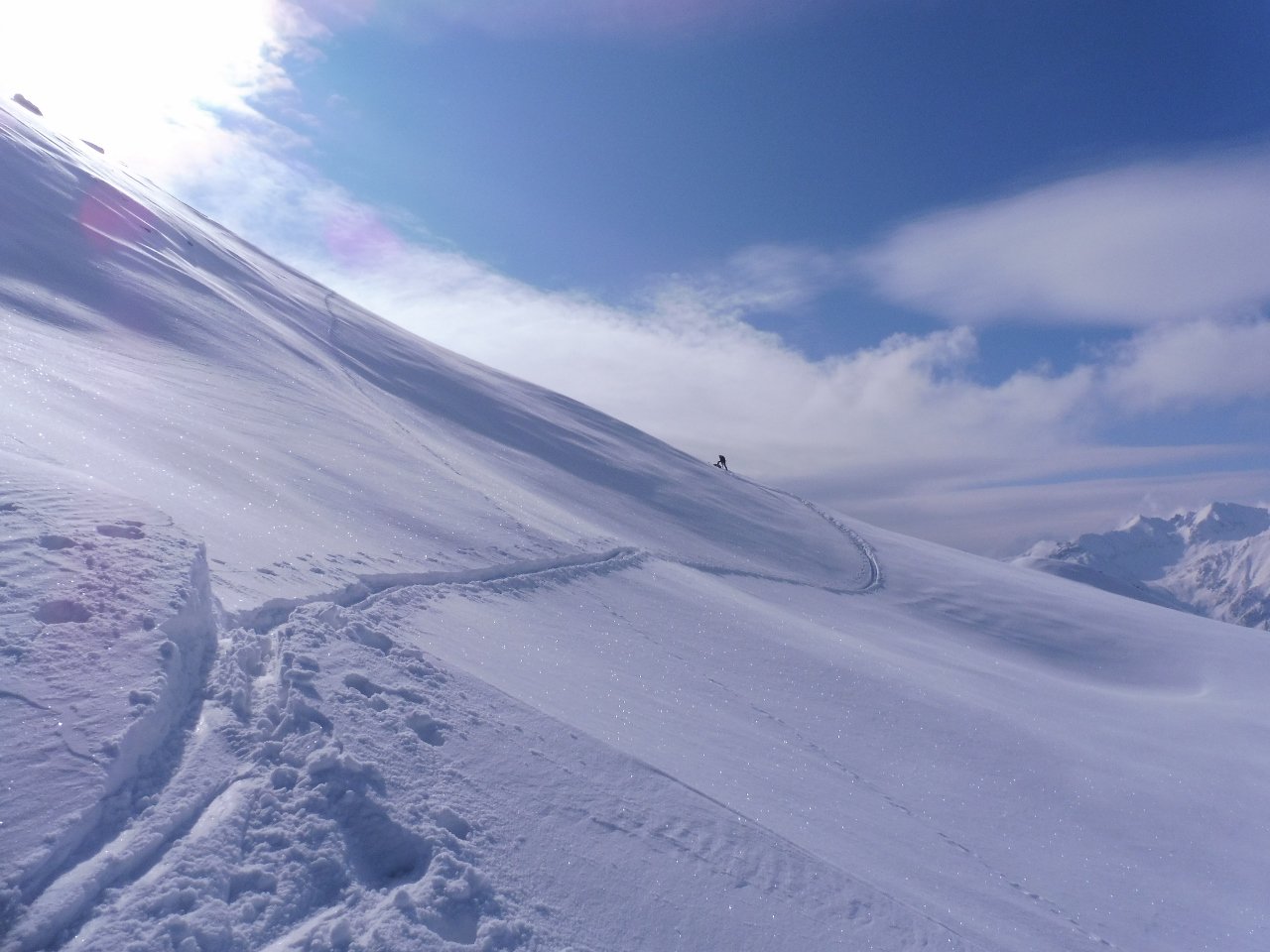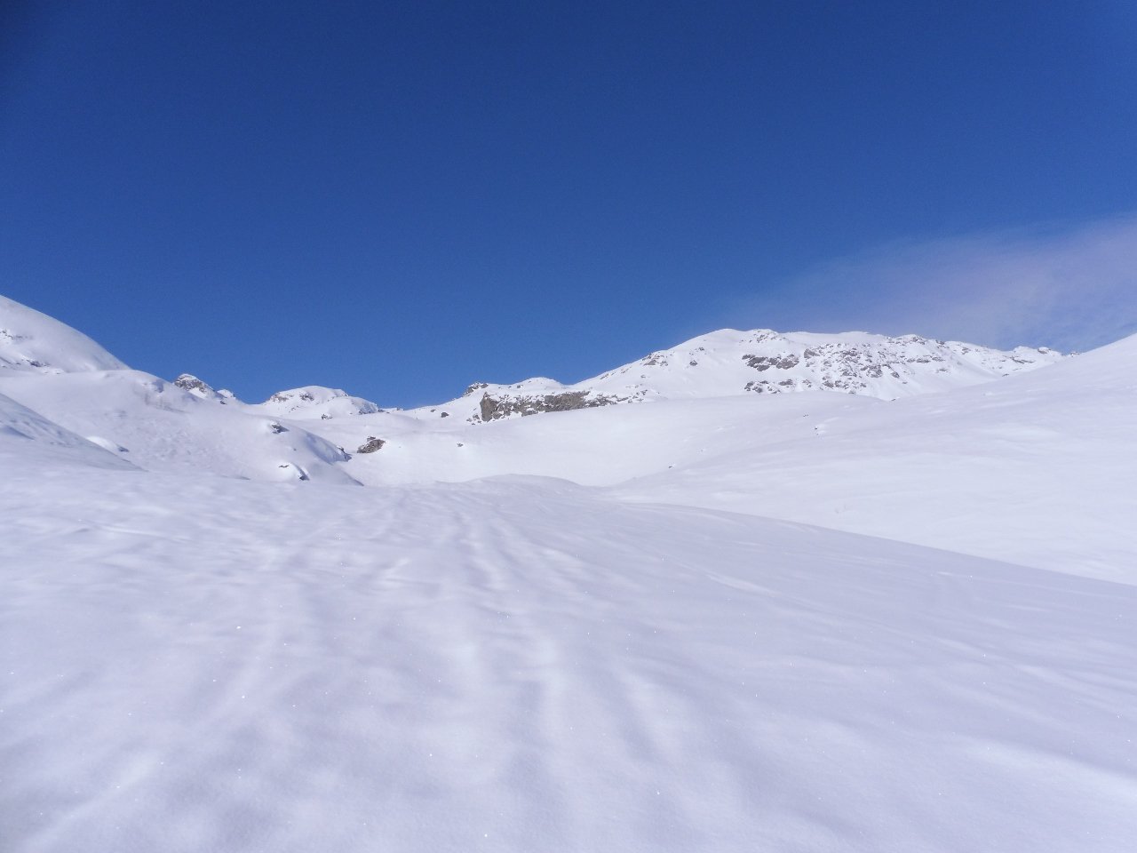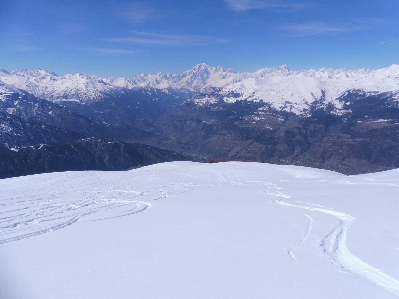 | tini | 01 - il pendio finale in farina, zona cresta N | tini | 02 - praterie zona Rond Perrin. Crosta e tracce rigelate | tini | 03 - giornata dal panorama sensazionale, Monte Bianco davanti. Gli spazi vergini si trovano ancora