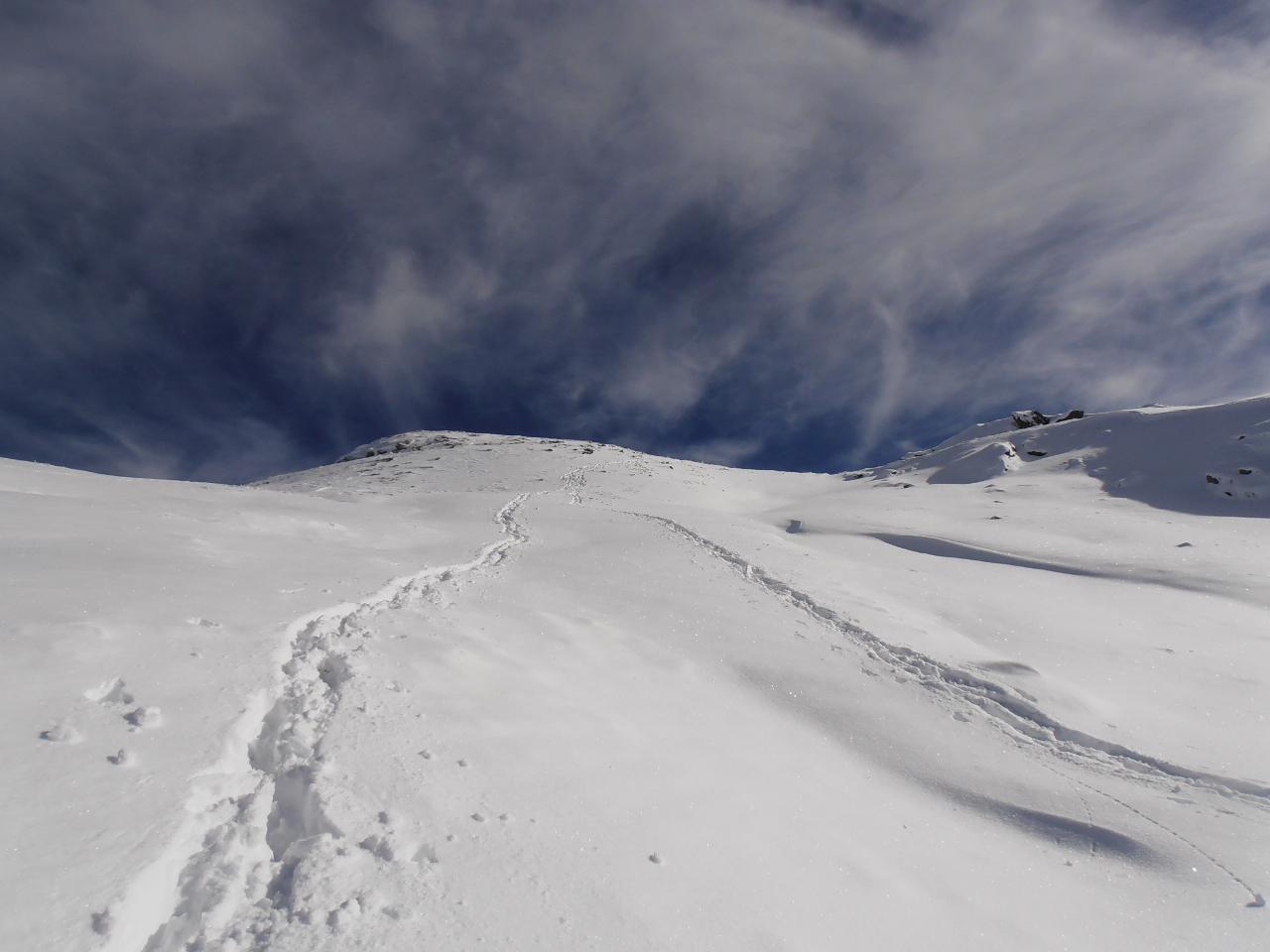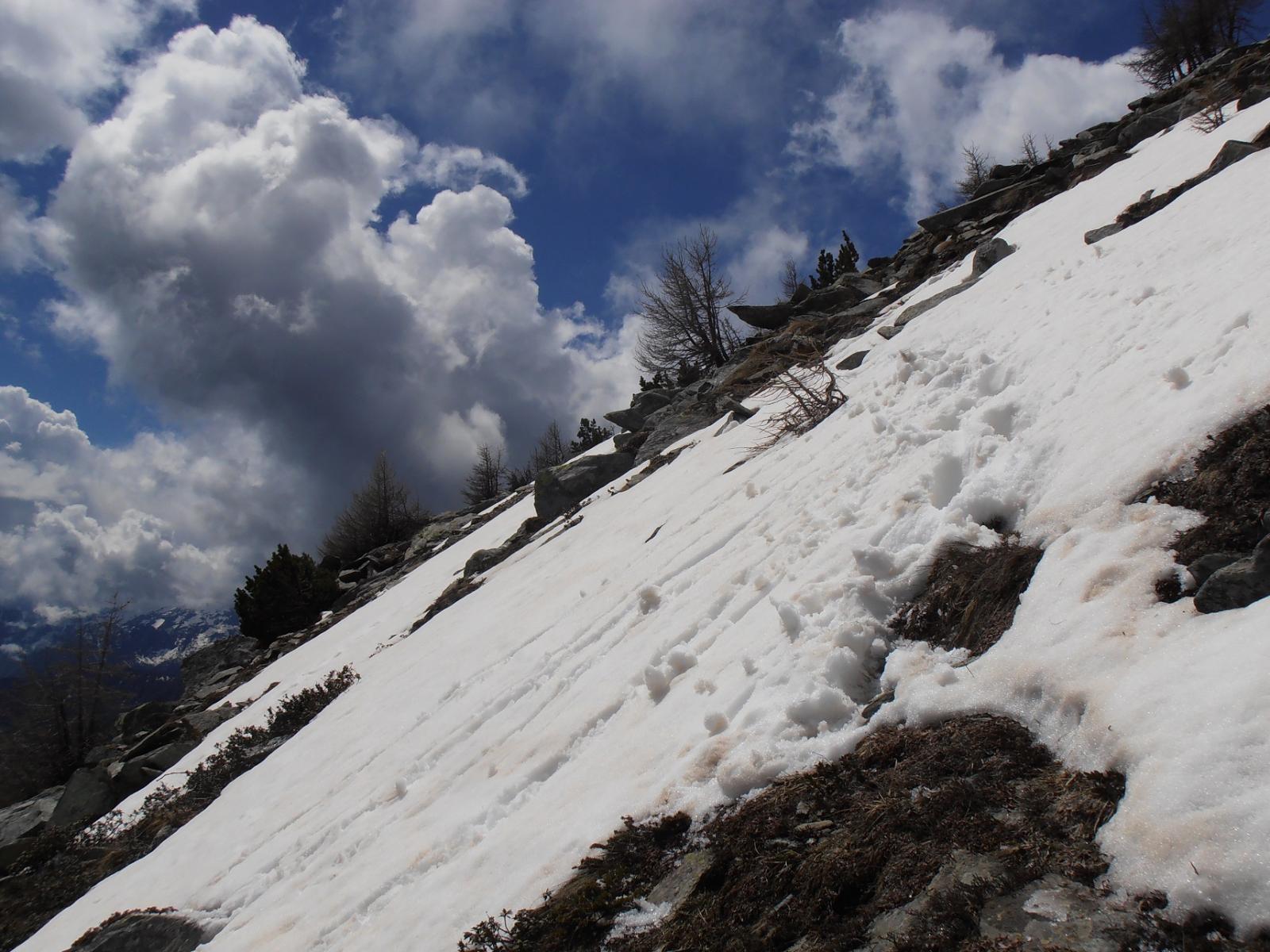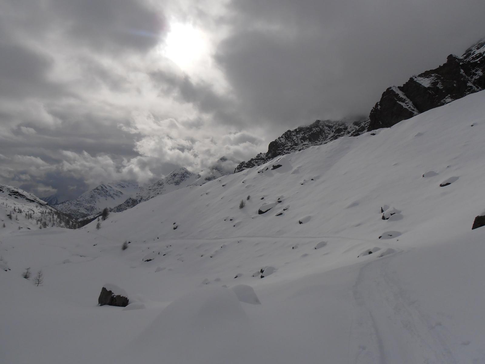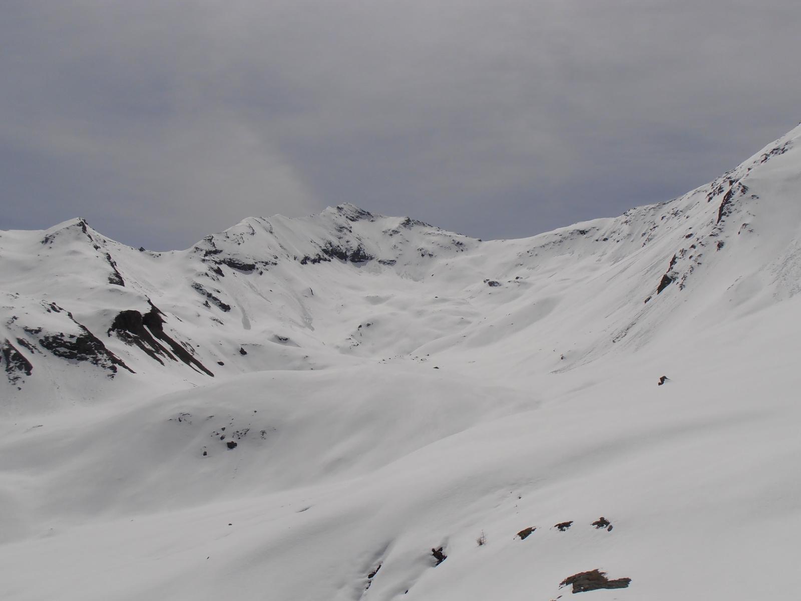 | tini | 11 - inizio discesa, arriva il maltempo da ovest | tini | 01 - Gran Chaux e Grande e Piccolo Avert sullo sfondo | tini | 02 - Punta Tessonet | tini | 03 - Punta di Leppe (a sx innevata) e C.di Leppe salita dal Vallone di S.Marcel | tini | 04 - Ingresso nel vallone di S.Marcel sotto l'imponente sella innevata del Col di Salé | tini | 05 - immettendosi nel vallone si intuisce la meta, ancora molto lontana | tini | 06 - il Vallone si allarga dopo i ripidi pendii nella zona delle miniere di Rame | tini | 07 - si calzano le ciaspole a partire da Mulac, dopo 1,5h di cammino | tini | 08 - i pendii ripidi hanno scaricato di recente, molto vicino a dove bisogna passare | tini | 09 - scorcio sul Grand Combin salendo | tini | 10 - in questa zona si inizia a salire un pò | tini | 11 - valanghe recenti proprio sul percorso, nessuna traccia di passaggio | tini | 12 - sulla valanga | tini | 13 - Lago Layet, non seguire la strada, a dx, ma risalire a sx se la neve è sicura (Roccette da aggirare) | tini | 14 - se si segue la strada bisogna tagliare questo pendio innevato...
