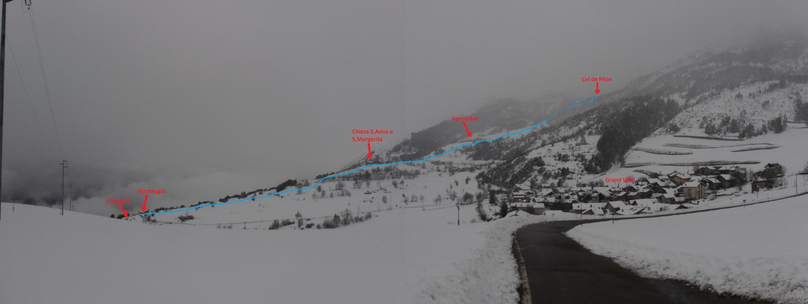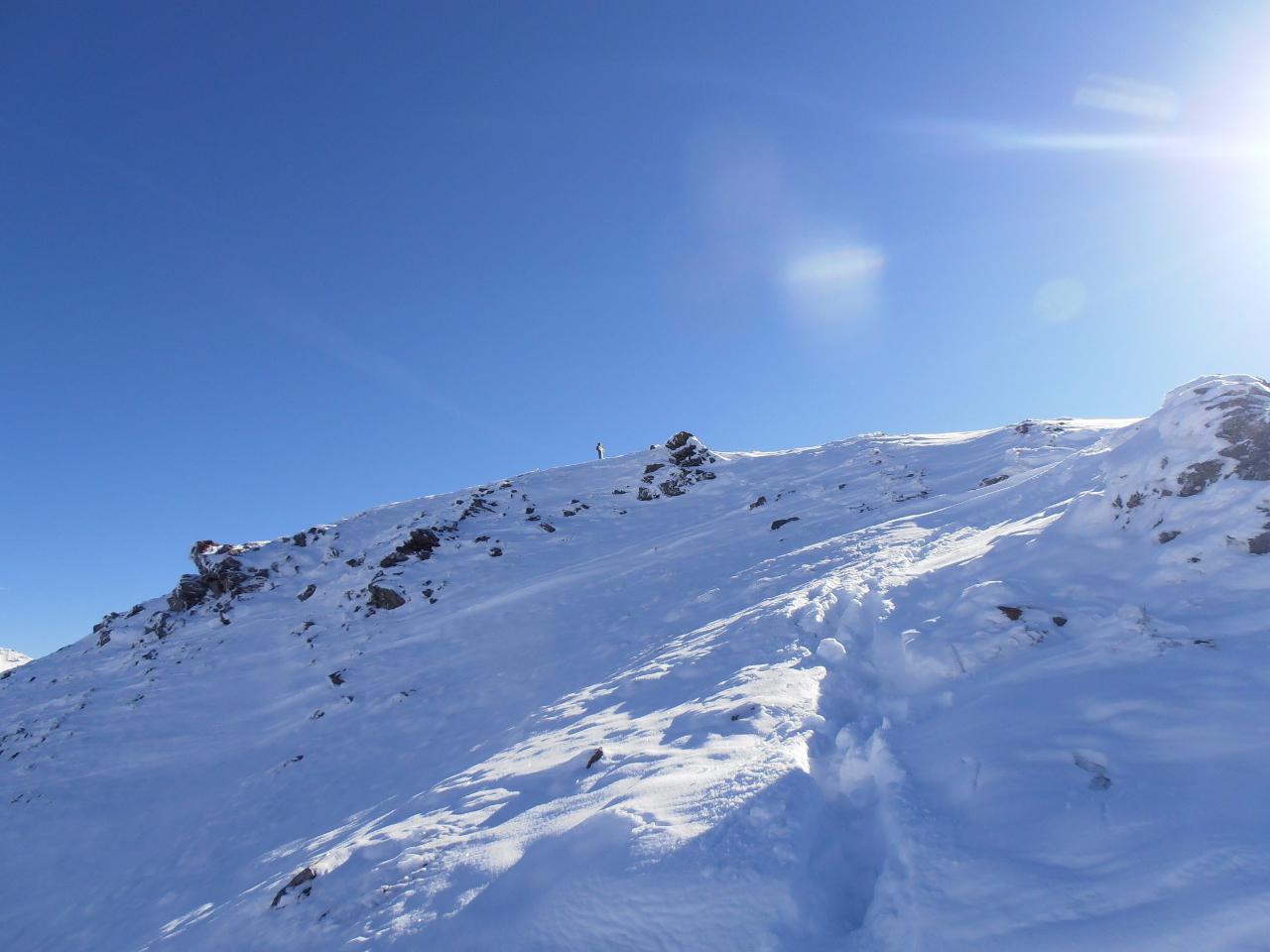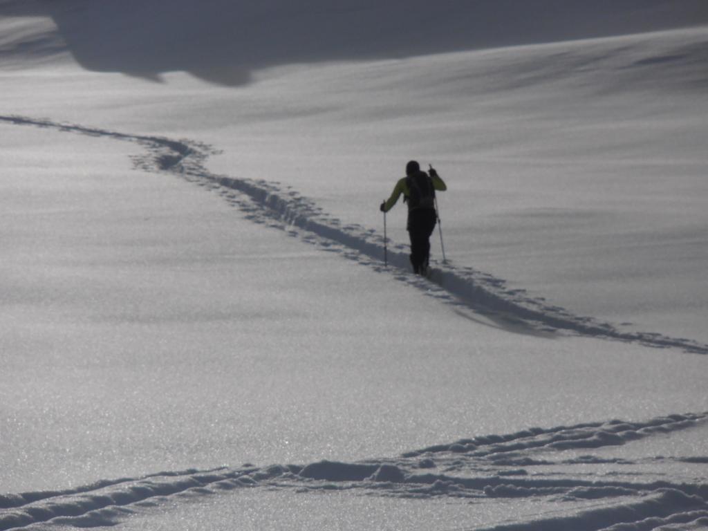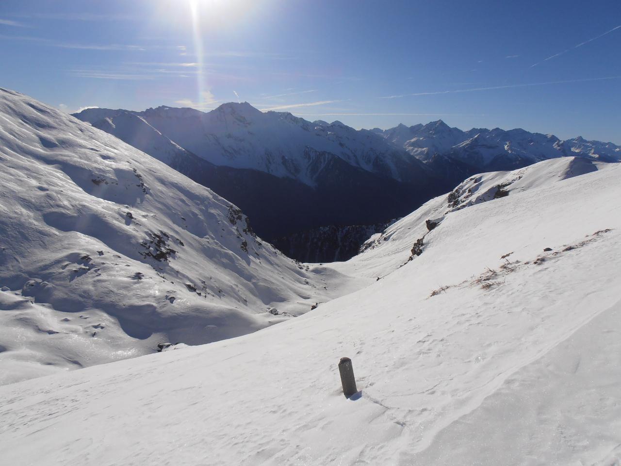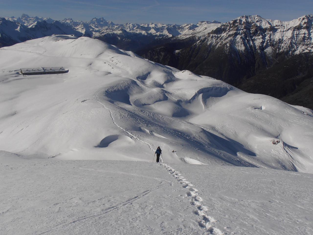 | tini | 11 - inizio discesa, arriva il maltempo da ovest | tini | 01 - Gran Chaux e Grande e Piccolo Avert sullo sfondo | tini | 02 - Punta Tessonet | tini | 03 - Punta di Leppe (a sx innevata) e C.di Leppe salita dal Vallone di S.Marcel | tini | 04 - Ingresso nel vallone di S.Marcel sotto l'imponente sella innevata del Col di Salé | tini | 05 - immettendosi nel vallone si intuisce la meta, ancora molto lontana | tini | 06 - il Vallone si allarga dopo i ripidi pendii nella zona delle miniere di Rame | tini | 07 - si calzano le ciaspole a partire da Mulac, dopo 1,5h di cammino | tini | 08 - i pendii ripidi hanno scaricato di recente, molto vicino a dove bisogna passare | tini | 09 - scorcio sul Grand Combin salendo | tini | 10 - in questa zona si inizia a salire un pò | tini | 11 - valanghe recenti proprio sul percorso, nessuna traccia di passaggio | tini | 12 - sulla valanga | tini | 13 - Lago Layet, non seguire la strada, a dx, ma risalire a sx se la neve è sicura (Roccette da aggirare) | tini | 14 - se si segue la strada bisogna tagliare questo pendio innevato...