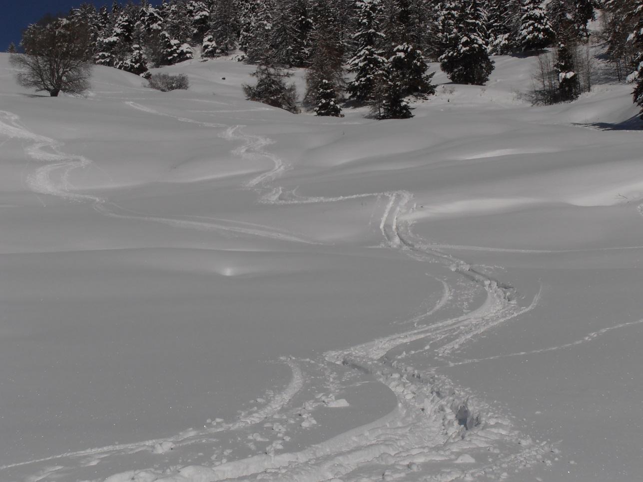 | tini | 01 - belle curve in neve fresca | tini | 02 - le tracce delle due discese | tini | 03 - alla fine della seconda discesa zoccolo di 10cm sotto gli sci | tini | 04 - bello | tini | 05 - bello