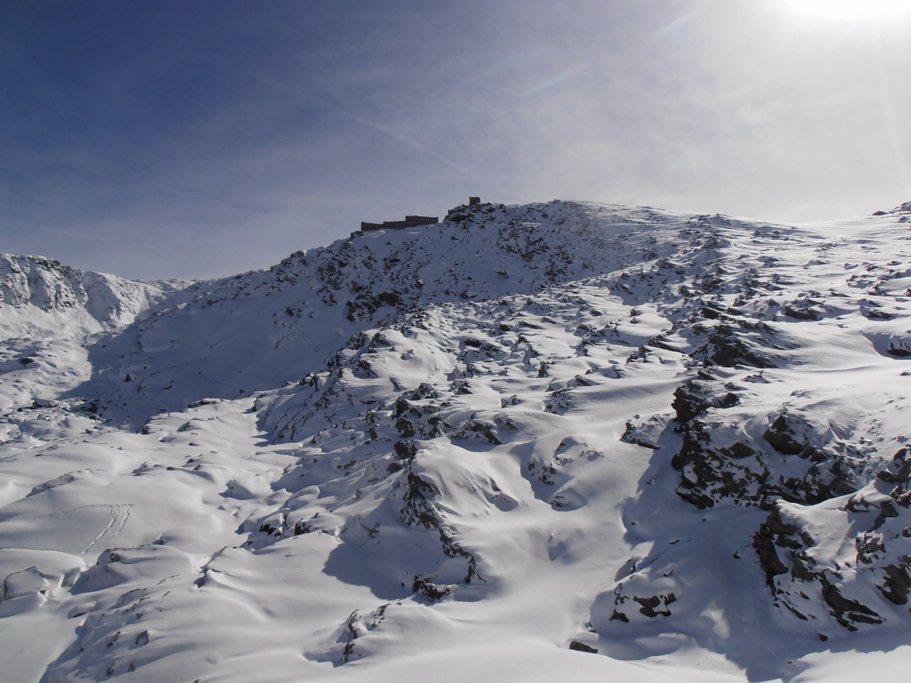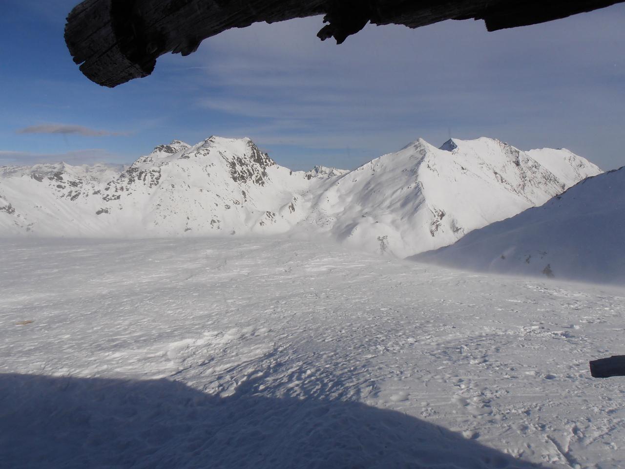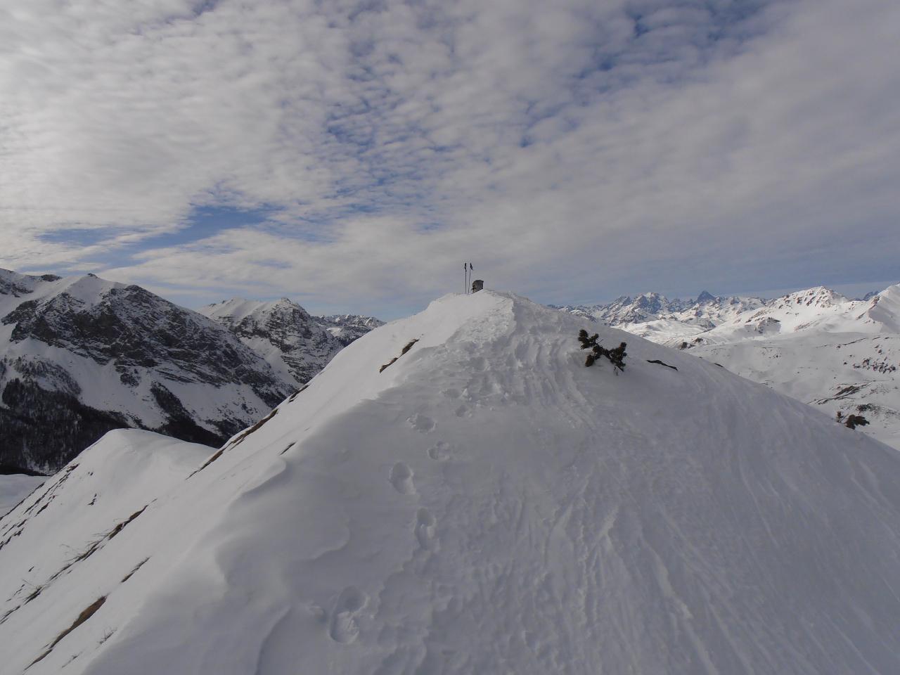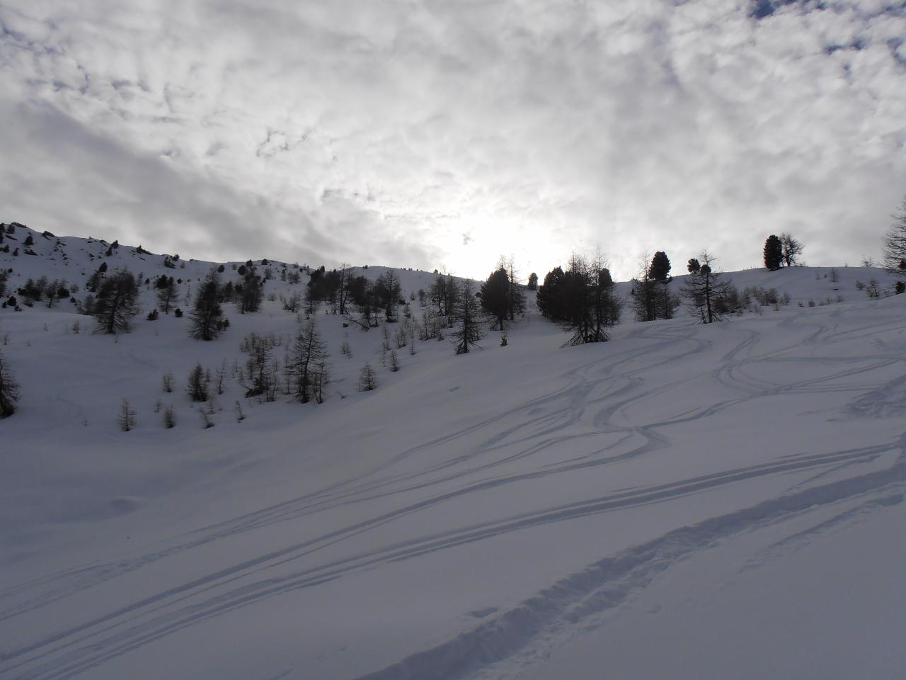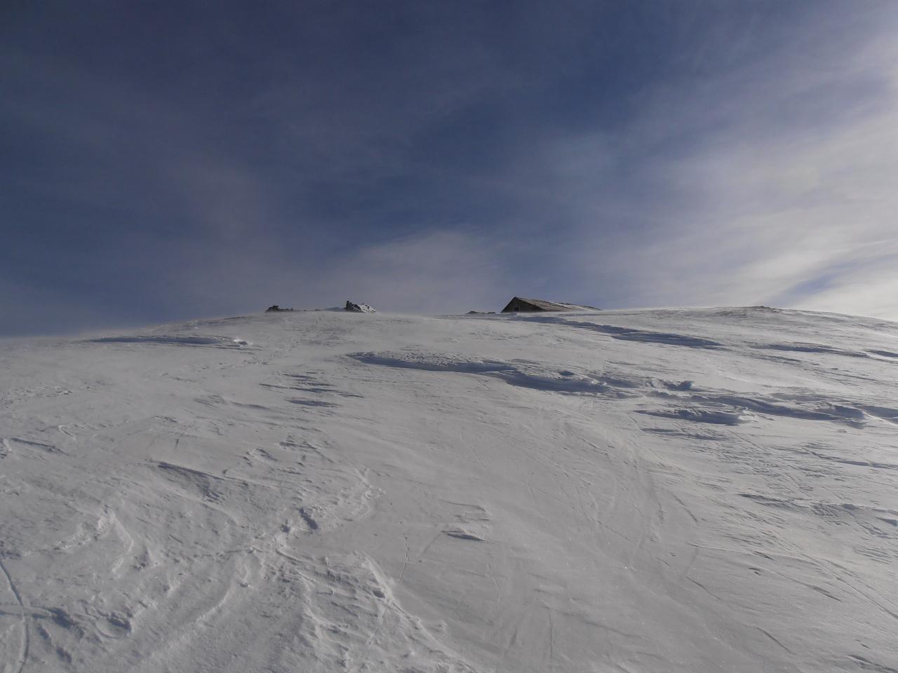 | tini | 01 - scendendo sul pendio ad Ovest della cima | tini | 02 - zona di taglio a dx - Nord per riportarsi nella zona del percorso normale, ma più in basso | tini | 03 - vista sull'Albergian da dentro la caserma diroccata | tini | 04 - dalla cima | tini | 05 - inizio discesa su neve dura lavorata dal vento