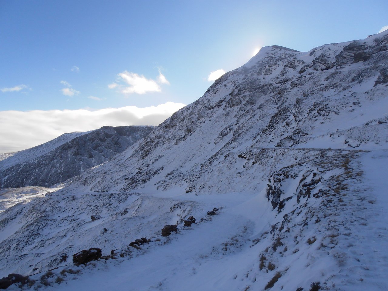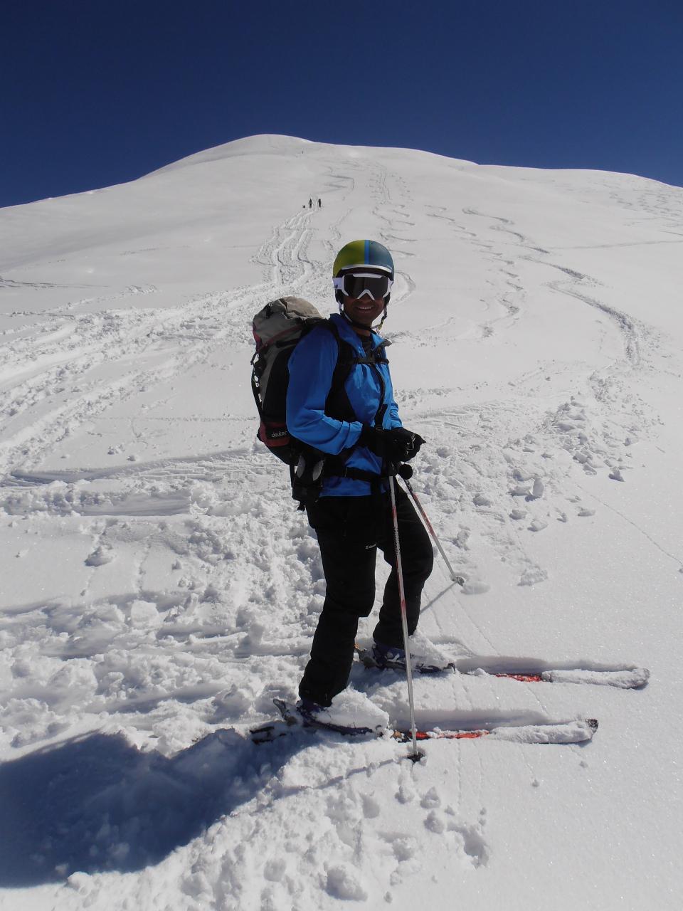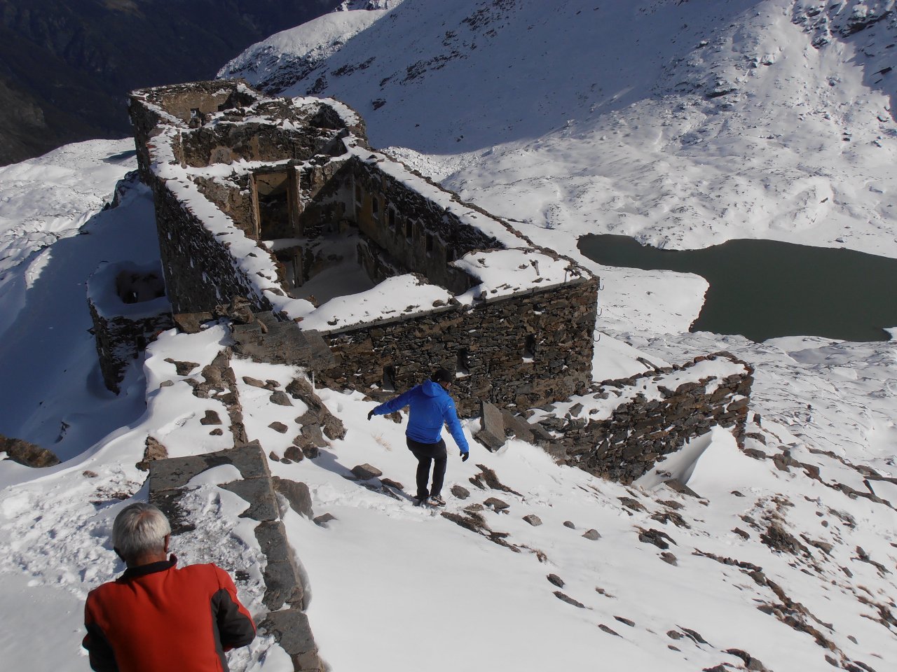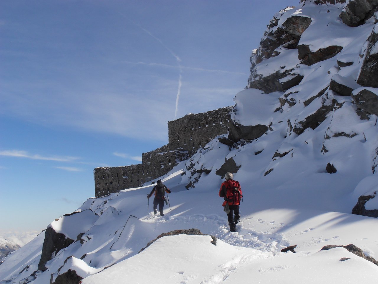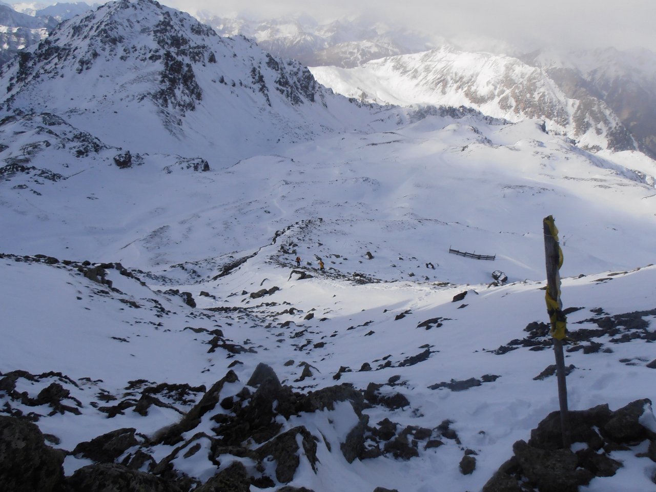 | tini | 01 - scendendo sul pendio ad Ovest della cima | tini | 02 - zona di taglio a dx - Nord per riportarsi nella zona del percorso normale, ma più in basso | tini | 03 - vista sull'Albergian da dentro la caserma diroccata | tini | 04 - dalla cima | tini | 05 - inizio discesa su neve dura lavorata dal vento
