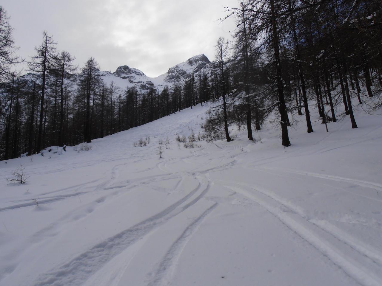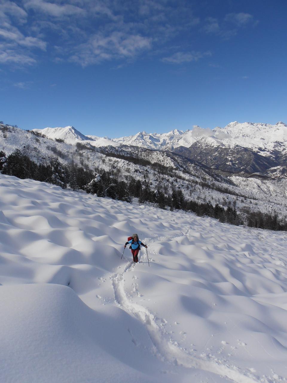| tini | 01 - Sotto i 2000mt c'è neve solo in pista | tini | 02 - l'ultima ripida rampa esposta a N salendo diretti a colle Bercia | tini | 03 - prove di inversione sui 35-40