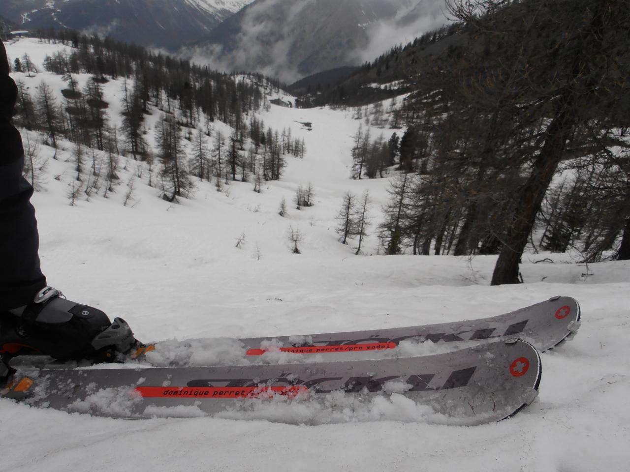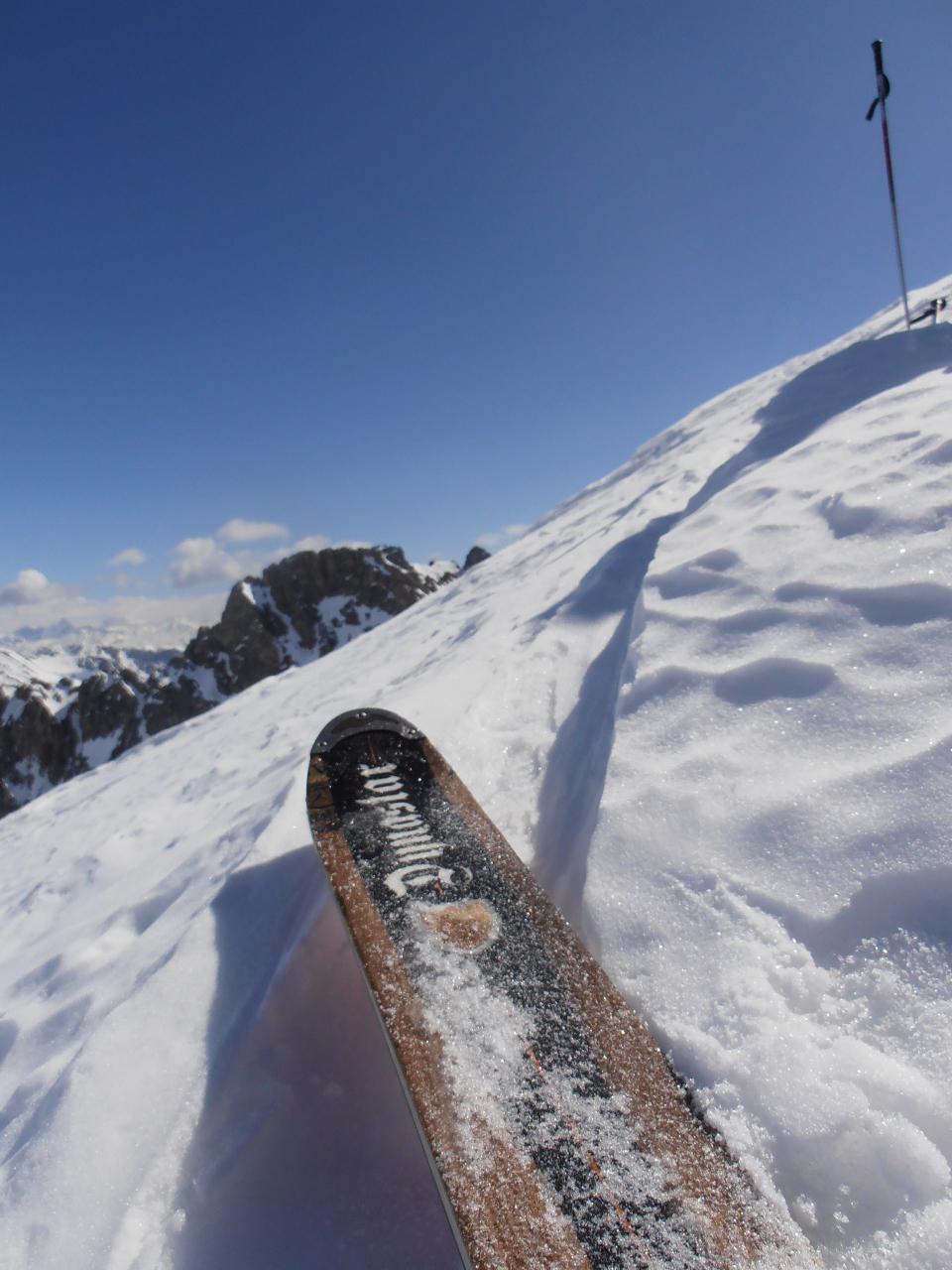 | tini | 01 - in cima | tini | 02 - traverso finale in direzione Pintas | tini | 03 - effettivamente questa vista della pale vale da sola la gita | tini | 05 - la neve primaverile permette anche curve agevoli sui 40gradi