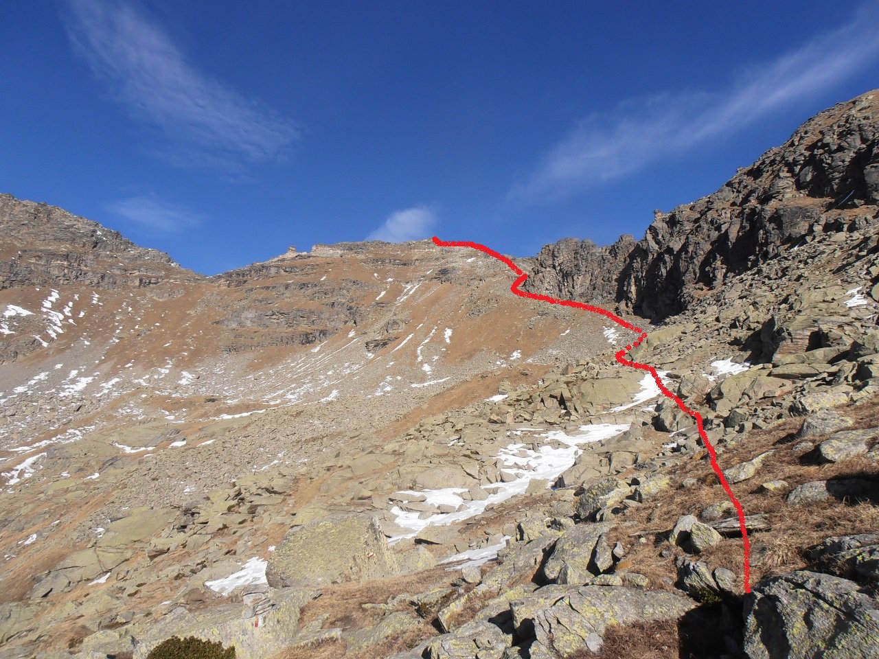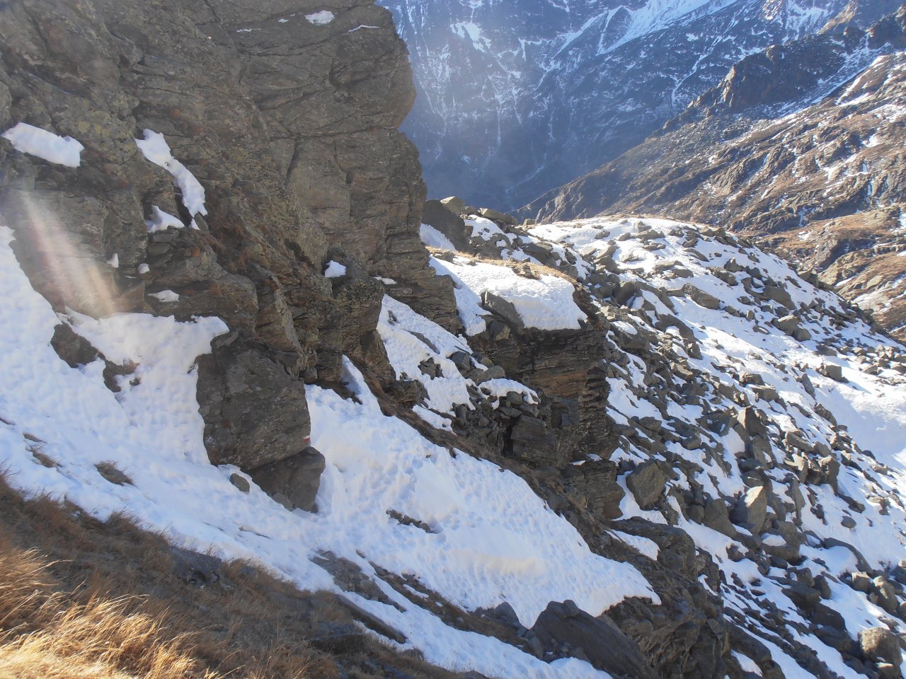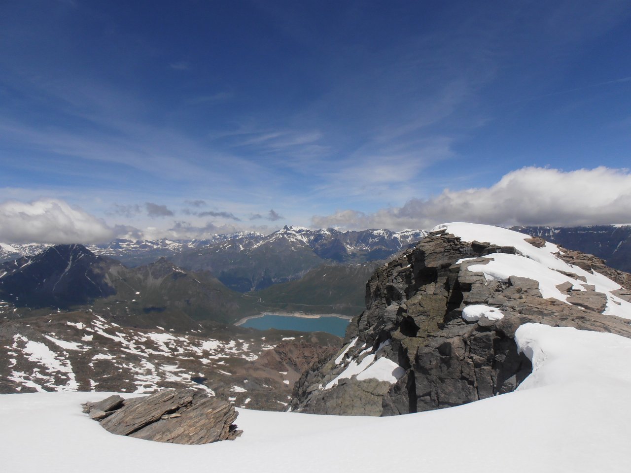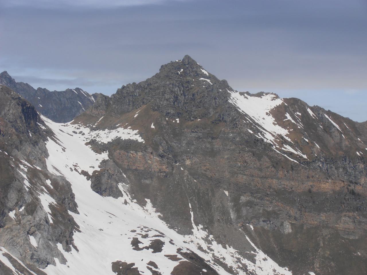| tini | 01 - in cima | tini | 02 - panorama sul fondovalle | tini | 03 - la breccia di passaggio sul versante di Ceresole, appena sotto la cima | tini | 04 - itinerario parte alta | tini | 05 - il sentiero normale passa su cengie esposte, disagevoli con neve | tini | 06 dettaglio cengia | tini | 08 - sotto il castelletto roccioso della vetta | tini | 09 - neve e rocce nel breve tratto sul versante di Ceresole | tini | 10 - tratto finale per la cima | tini | 11 - la cima