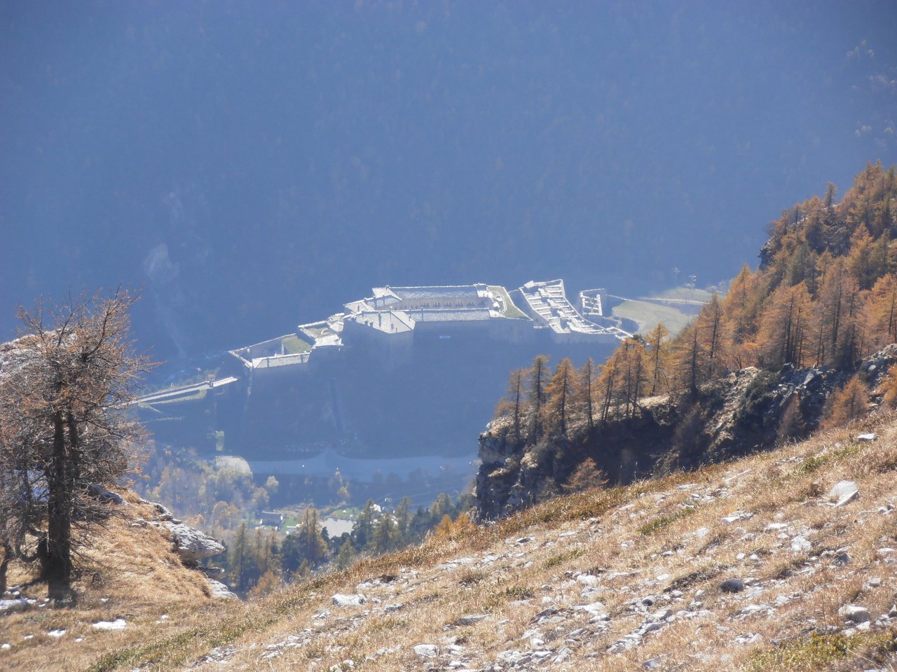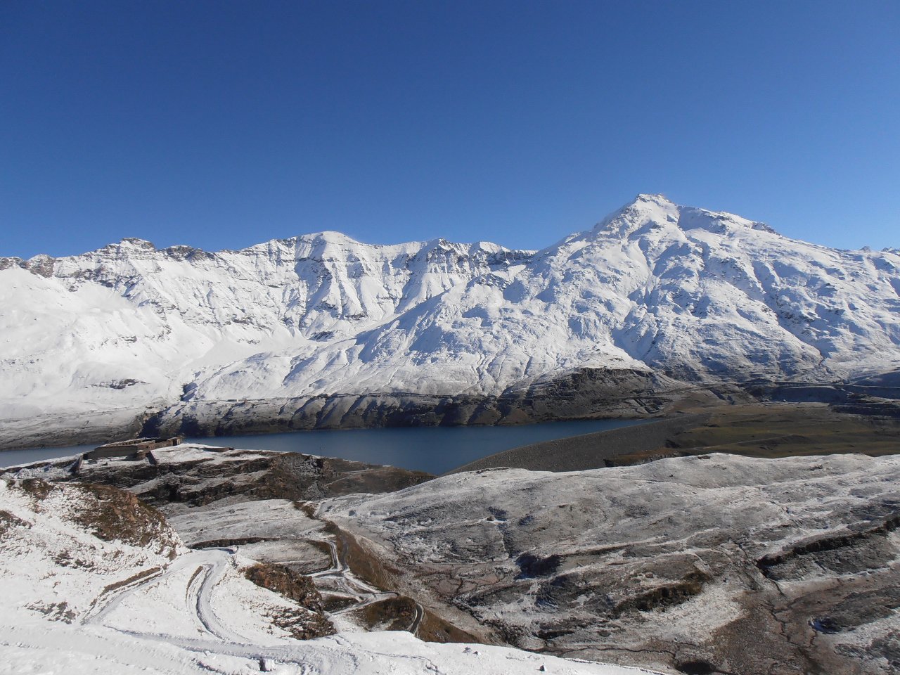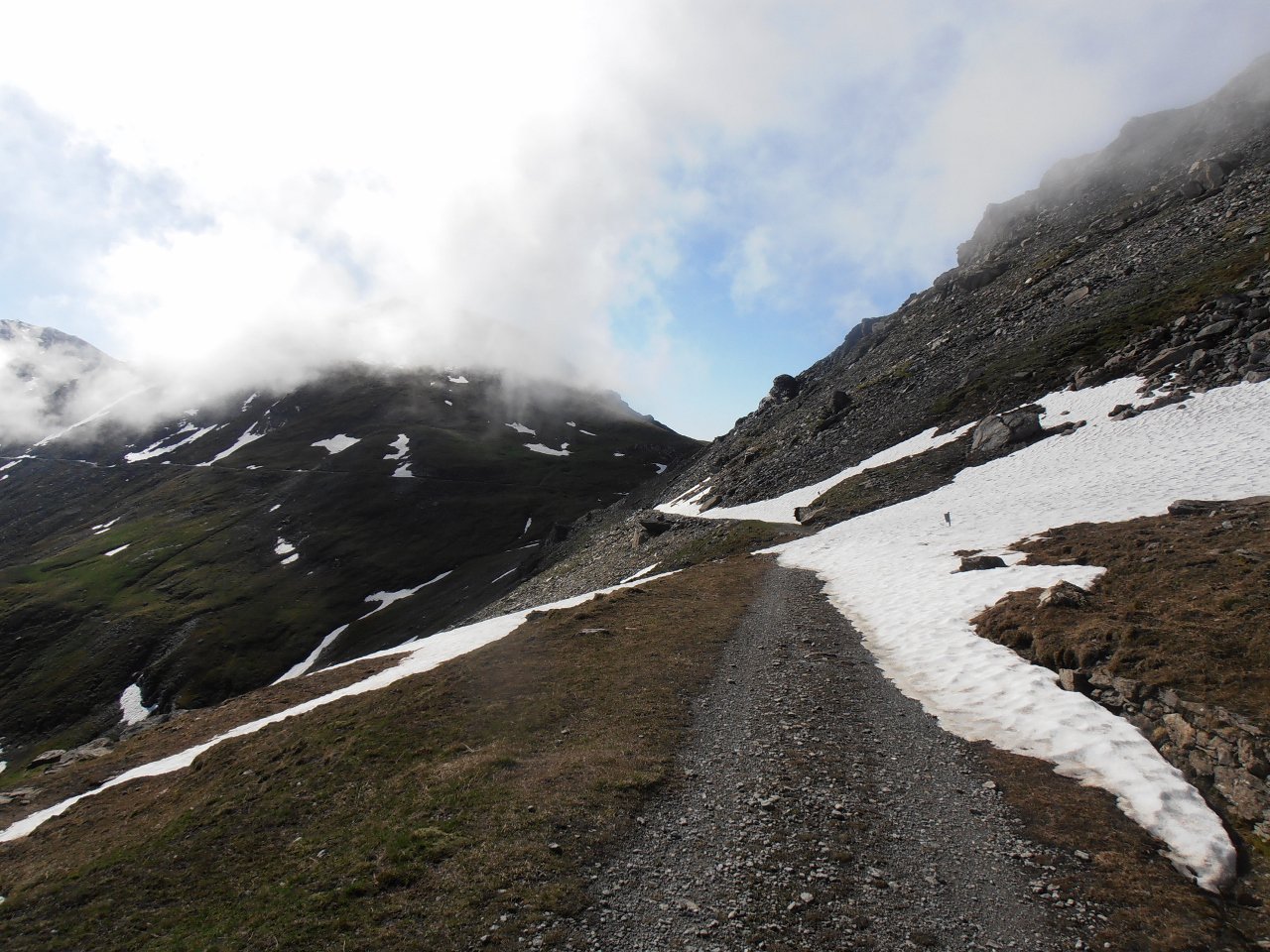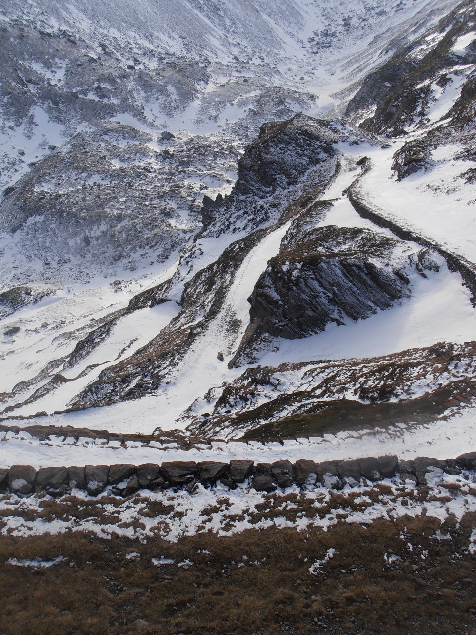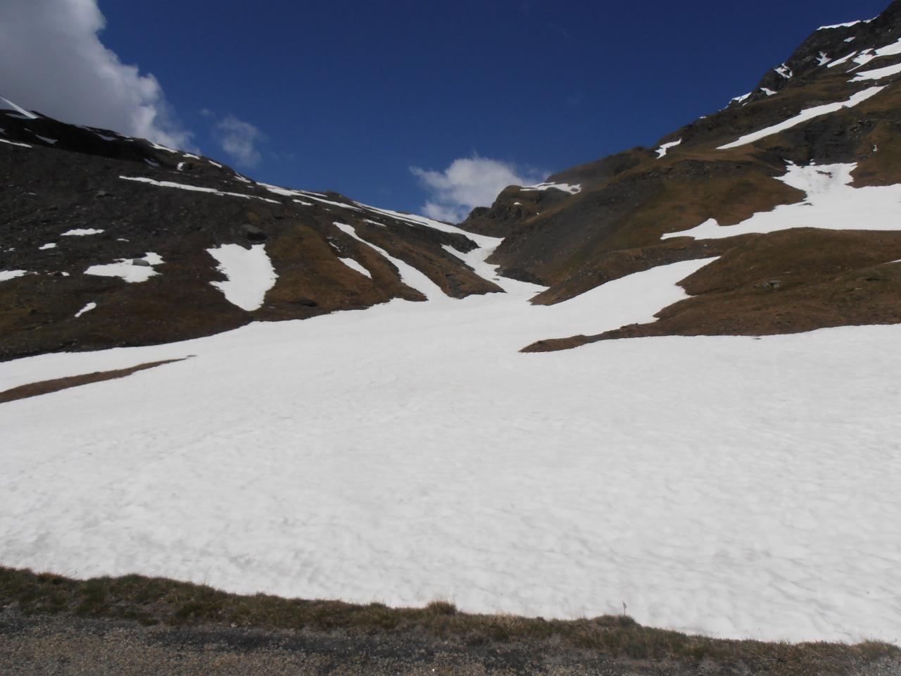 | tini | la valle che porta al Colle del Piccolo Moncenisio vista dall'alto | tini | la Combe Borgne è freddissima | tini | Vista sulla Cima di Bard | tini | la strada militare risale il ripido versante con stretti tornanti perfettamente conservati | tini | freddo | tini | Signal du Petit MontCenis e Cime du Laro