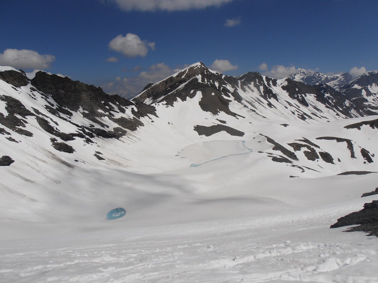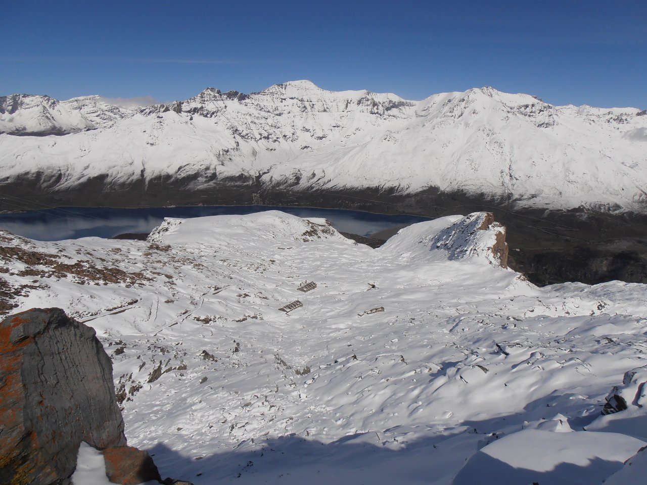 | tini | 01 - in cima con la Pointe de Mean Martin sullo sfondo | tini | 02 - dalla cima discesa verso il lago | tini | 03 - la Pointe de Bezin Nord, a centro foto, vista da Le Grand Fond | tini | 04 - grande cornice di neve in cima al Peleau Blanc