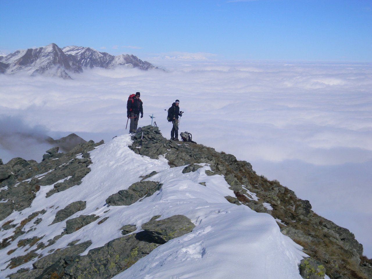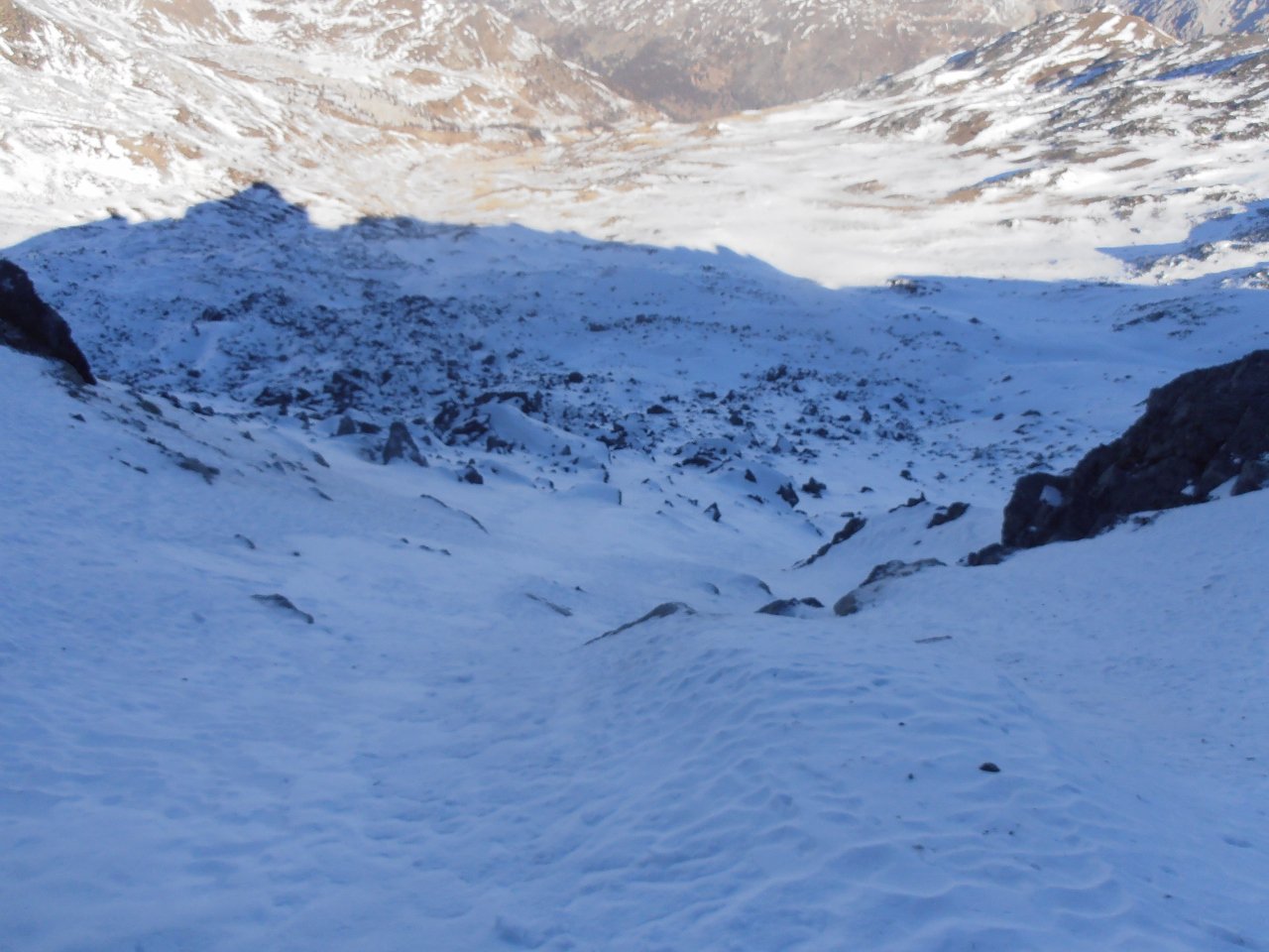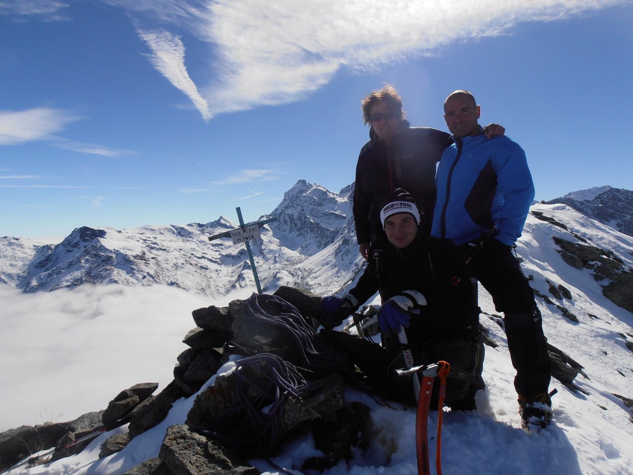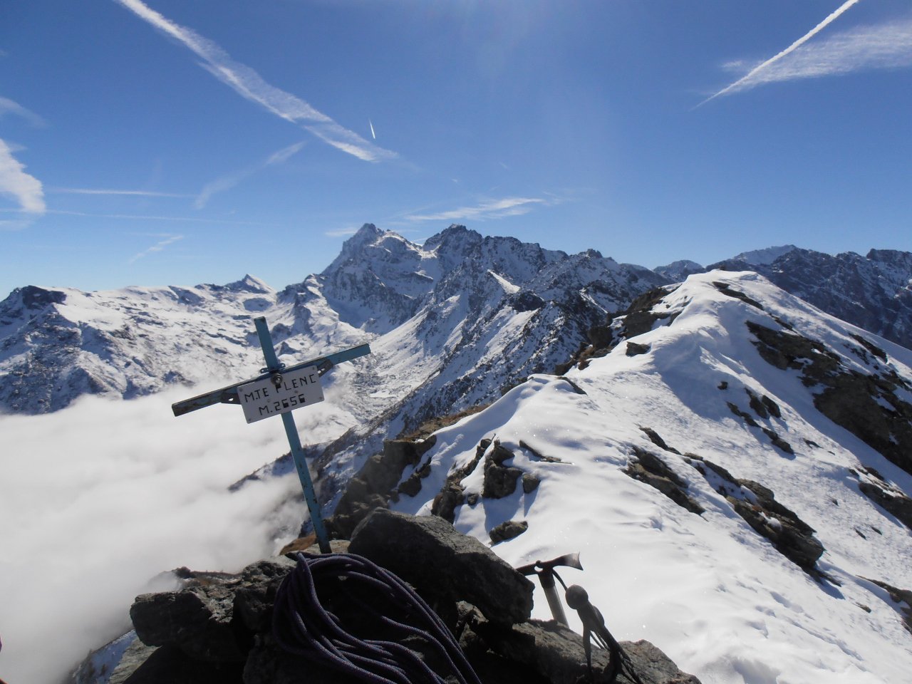 | tini | 02 - il canale visto dal pianoro sottostante | tini | 03 - il passaggio chiave dell'uscita in cresta | tini | 04 - il pianoro roccioso del Mait di Plenc è formato da grossi blocchi (meglio aggirarli) | tini | 05 - circa a metà canale | tini | 06 - pendenza nel canale | tini | 07 - il passaggio dell'uscita in cresta, 40 gradi e qualche balza rocciosa | tini | 08 - la cima con vista sul Monviso e Granero | tini | 09 - cima | tini | 10 - cima | tini | 11 - mare di nuvole | tini | 12 - la cresta in discesa | tini | 13 - lungo la cresta in discesa | tini | 14 - si rientra sotto le nuvole | tini | 01 - sulla cima nord con il Grand Roc alle spalle | tini | 02 - Teddy sulla cima sud