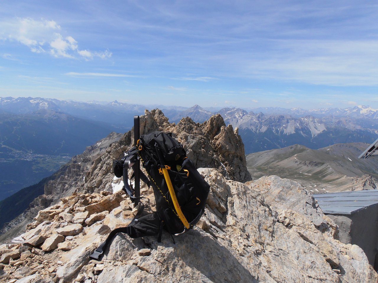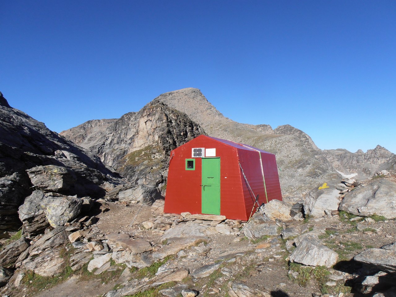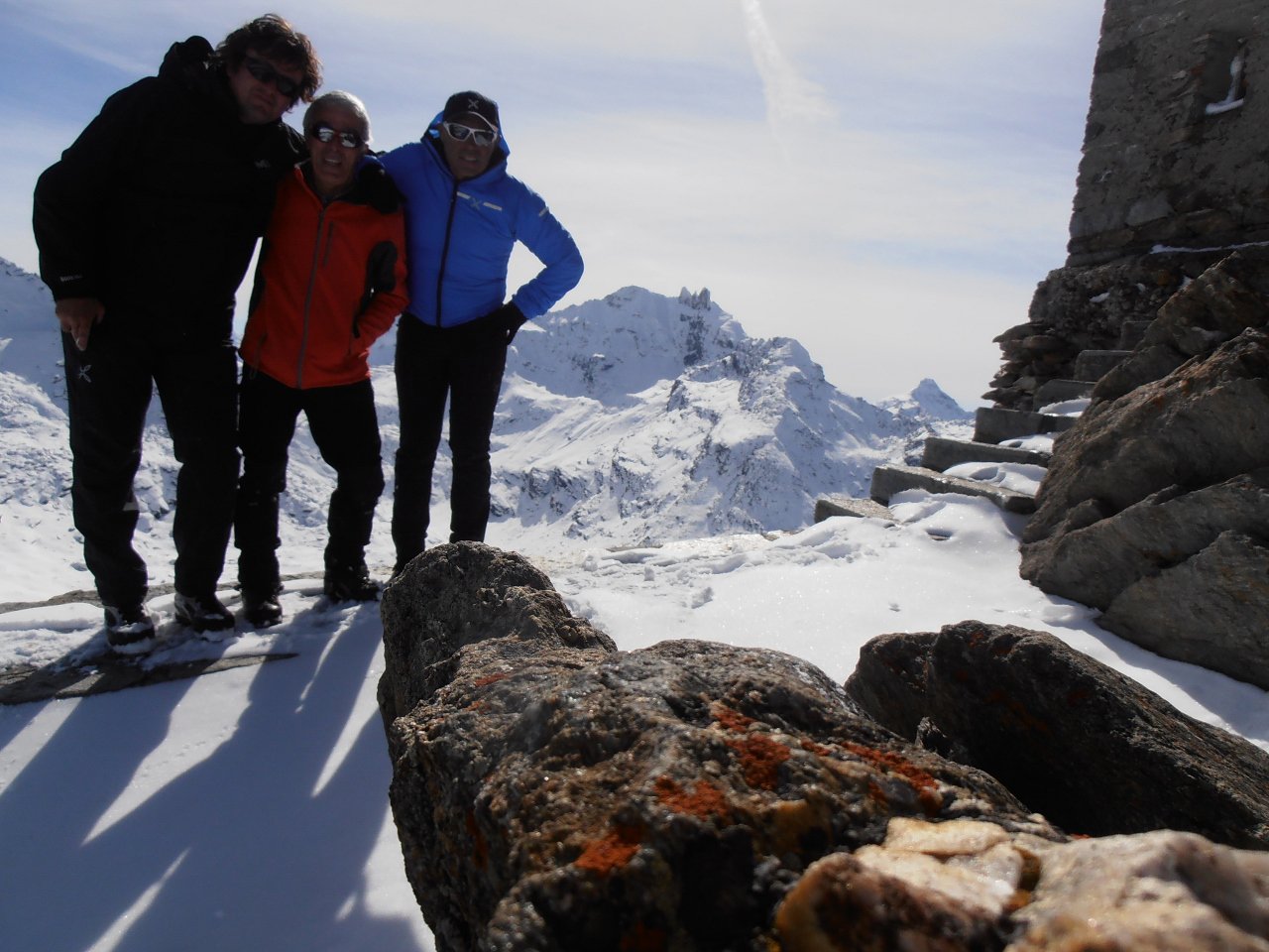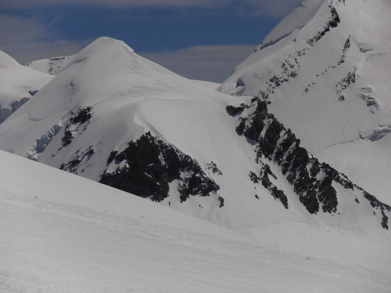 | tini | la cima con il bivacco | tini | parti scoperte, comunque non si tocca sotto, perchè la neve artificiale è ghiacciata | tini | Vista sul Monte Bianco dalla cima