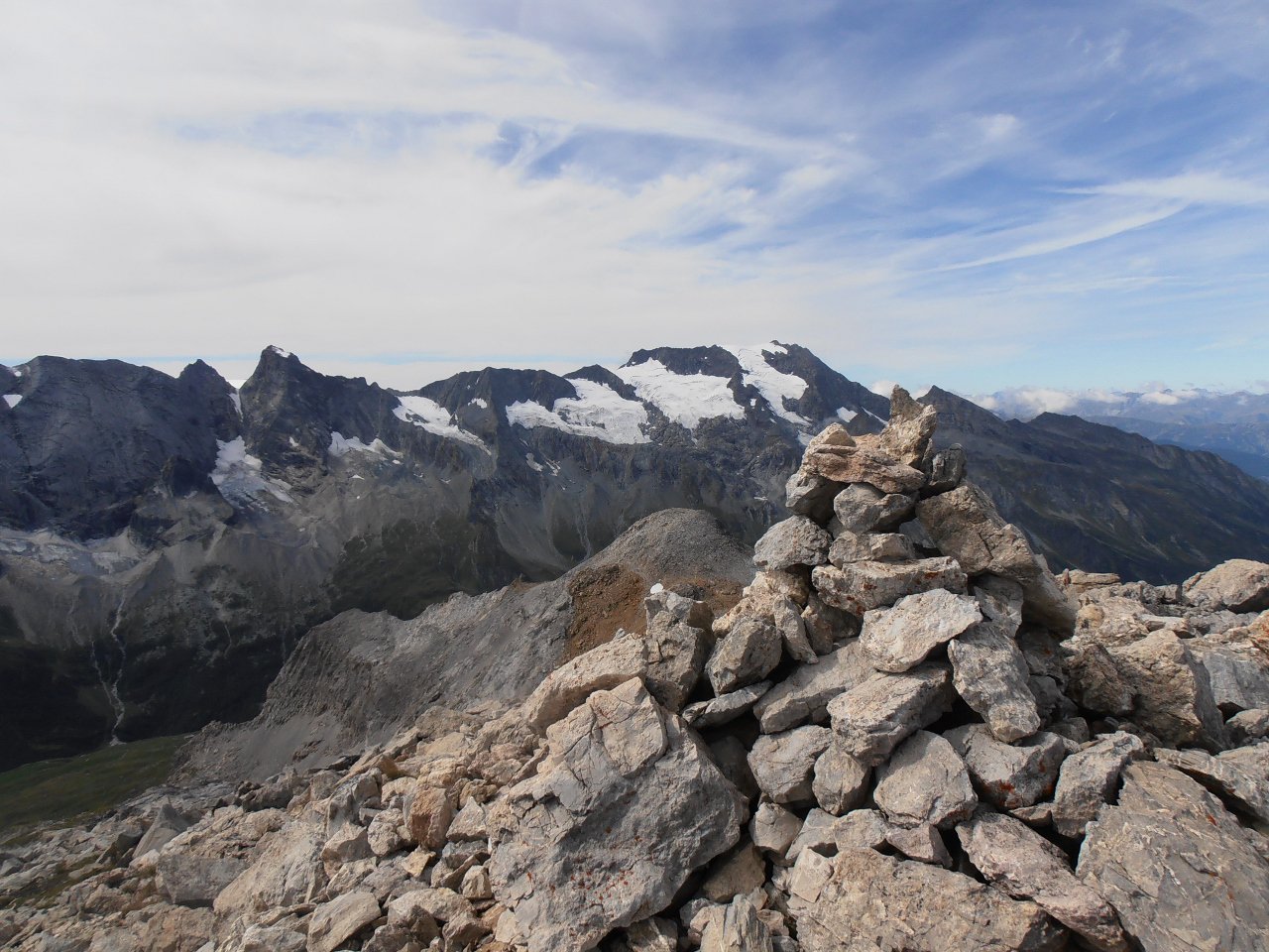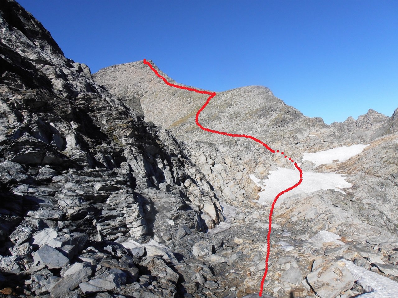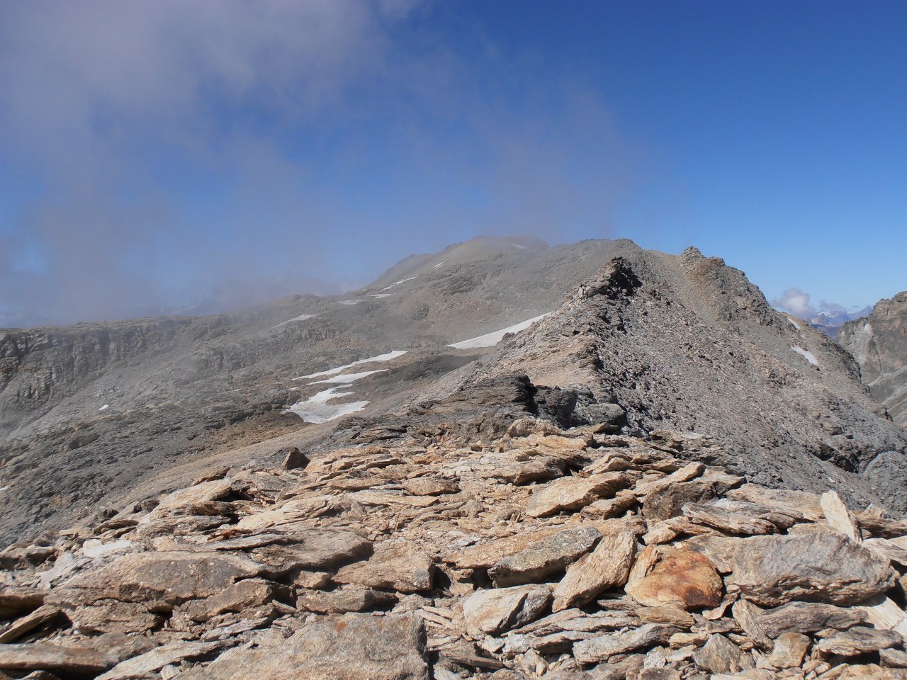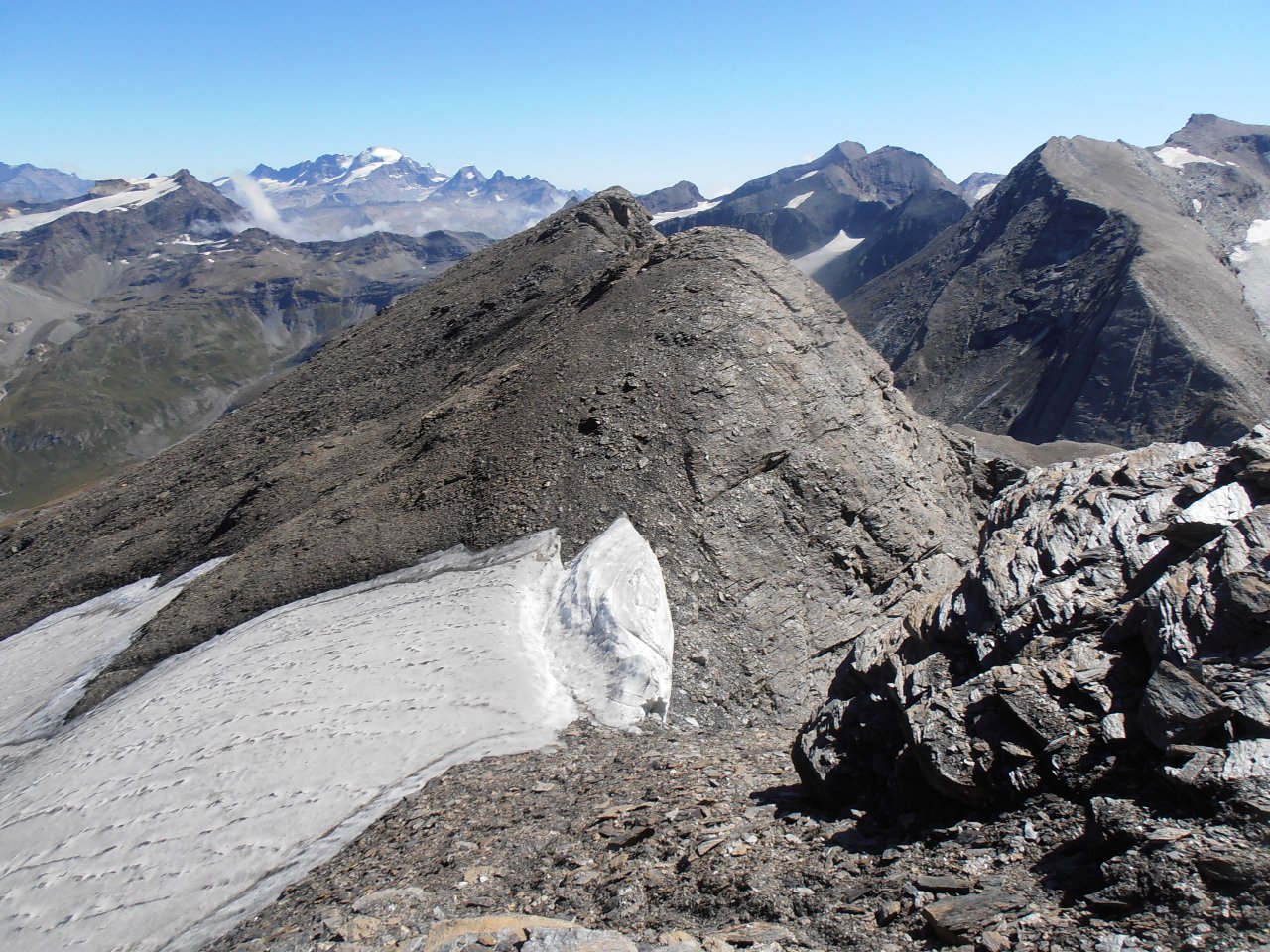 | tini | 03 - la parete sud è pressochè verticale | tini | 04 - la cresta dalla cima verso il Colle dell'Iseran | tini | 05 - lungo la cresta tra cima principale e cima est | tini | 06 - i resti del piccolo glacio nevaio sul versante nord del Signal de l'Iseran | tini | 01 - la cima | tini | 02 - parte finale della salita dal Col de Roche Noire | tini | 03 - parete N della Grande Casse dalla cima | tini | 04 - la Roche de Chevres dietro al Refuge de Plaisance | tini | 05 - direzione da seguire quando si abbandona il sentiero a 2350 | tini | 06 - entrati nel vallone superiore mirare alla sella sopra la Roche de Chevres | tini | 07 - terreni attraversati nel vallone | tini | 08 - dal pianoro quota 2745 seguire radi ometti tra le rocce montonate | tini | 09 - evidenza del pianoro quota 2745 e della spalla rocciosa che continua fino alla Roche de Chevres | tini | 10 - roccioni per arrivare al Col de Roche Noire | tini | 11 - canale-pendio finale che porta in vetta