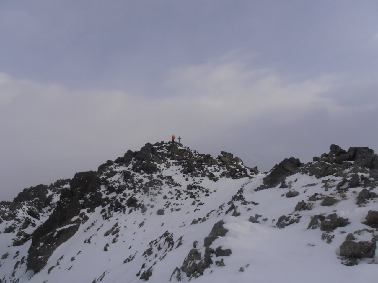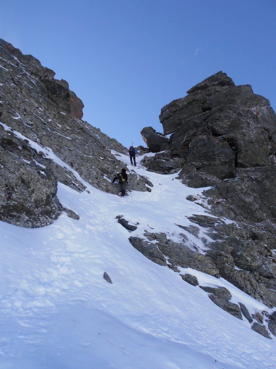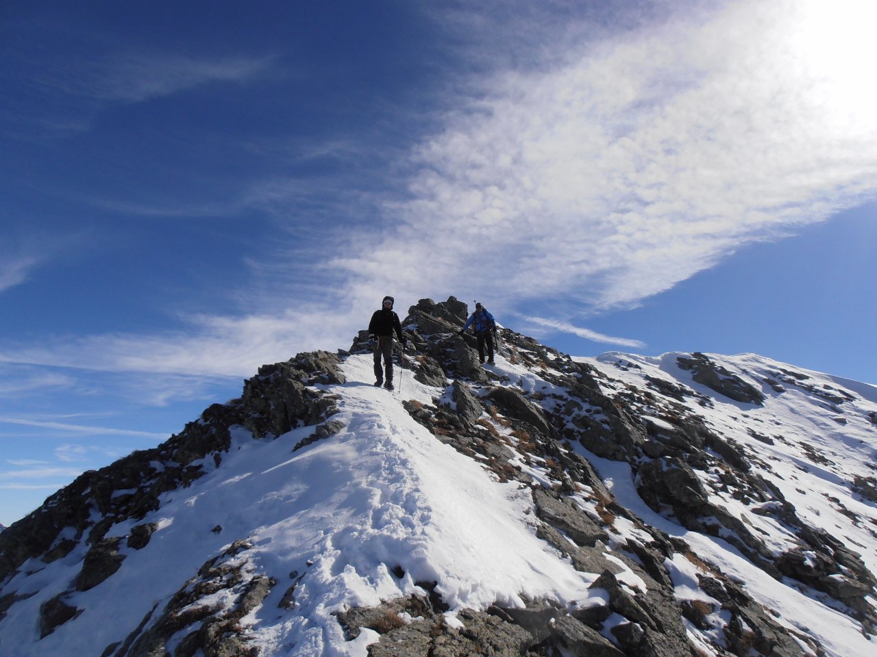 | tini | La cima | tini | Miesh sulla cresta finale... un anno fa si arrivava in cima sci ai piedi | tini | traccia | tini | stato innevamento canaletto prima della cresta... anche questo di solito si sale sci ai piedi | tini | Miesh e Papà in cima, visti scendendo | tini | cresta