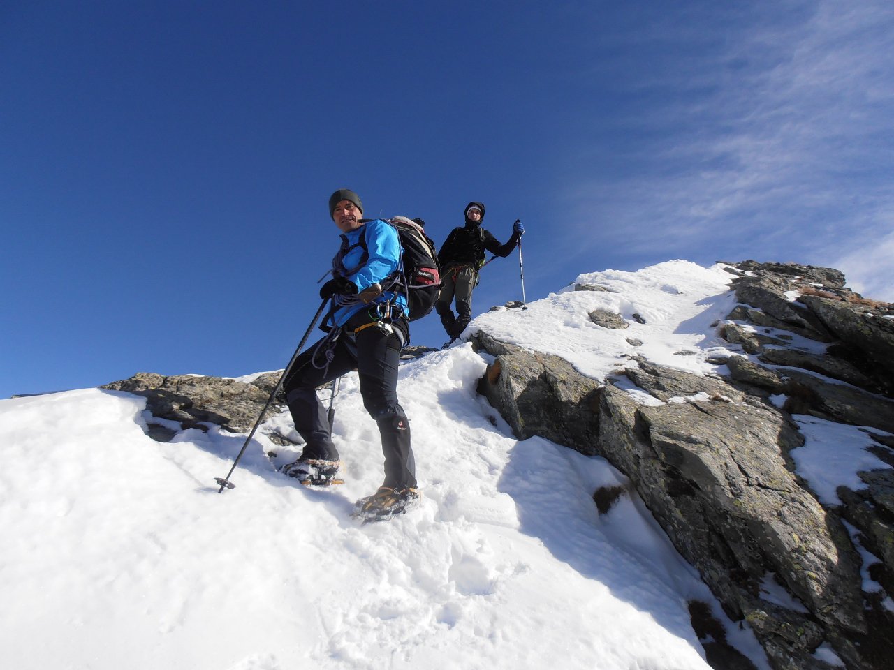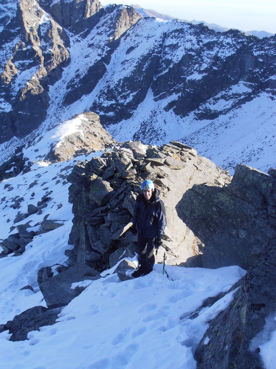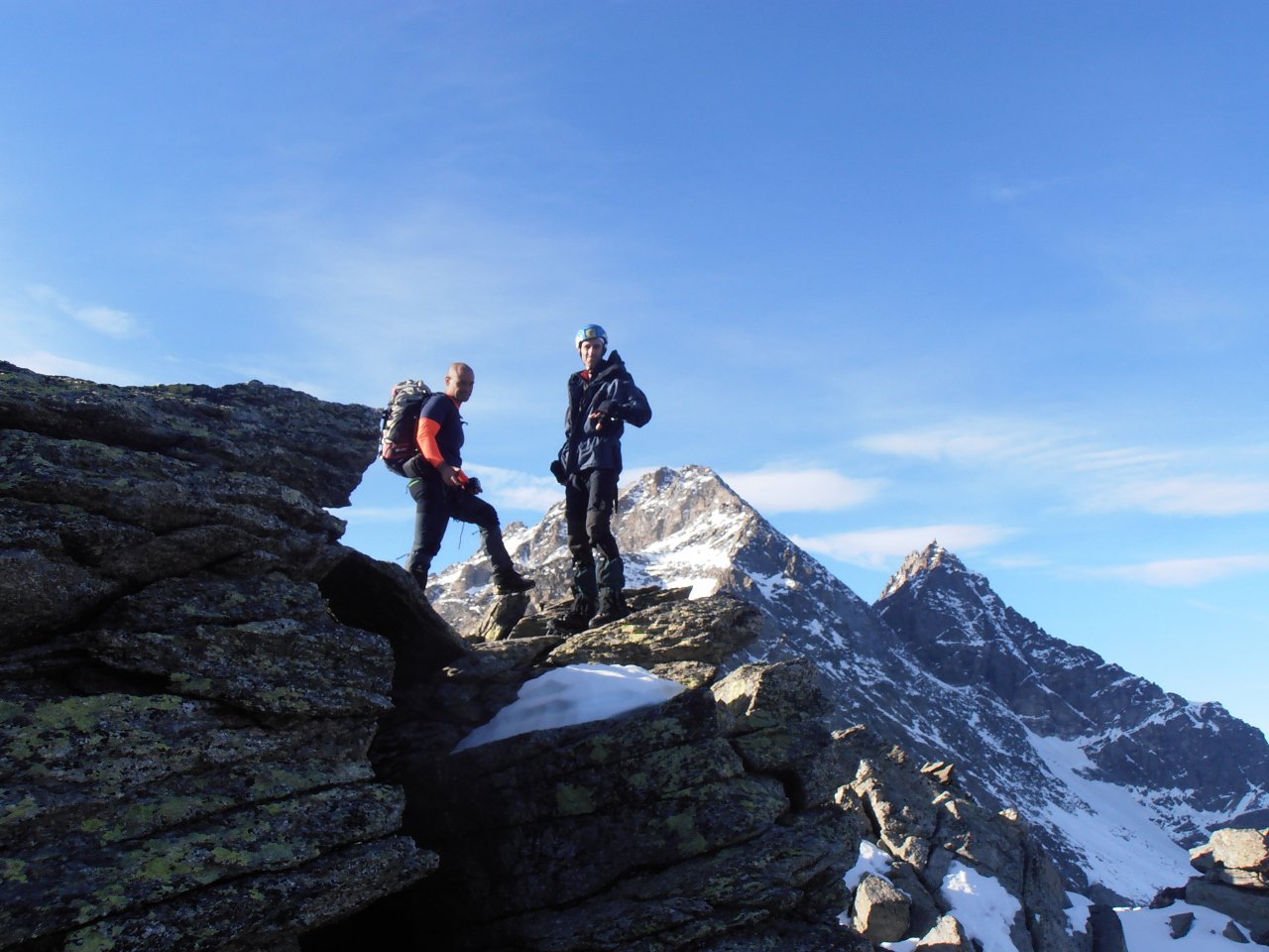 | tini | La cima | tini | Miesh sulla cresta finale... un anno fa si arrivava in cima sci ai piedi | tini | traccia | tini | stato innevamento canaletto prima della cresta... anche questo di solito si sale sci ai piedi | tini | Miesh e Papà in cima, visti scendendo | tini | cresta
