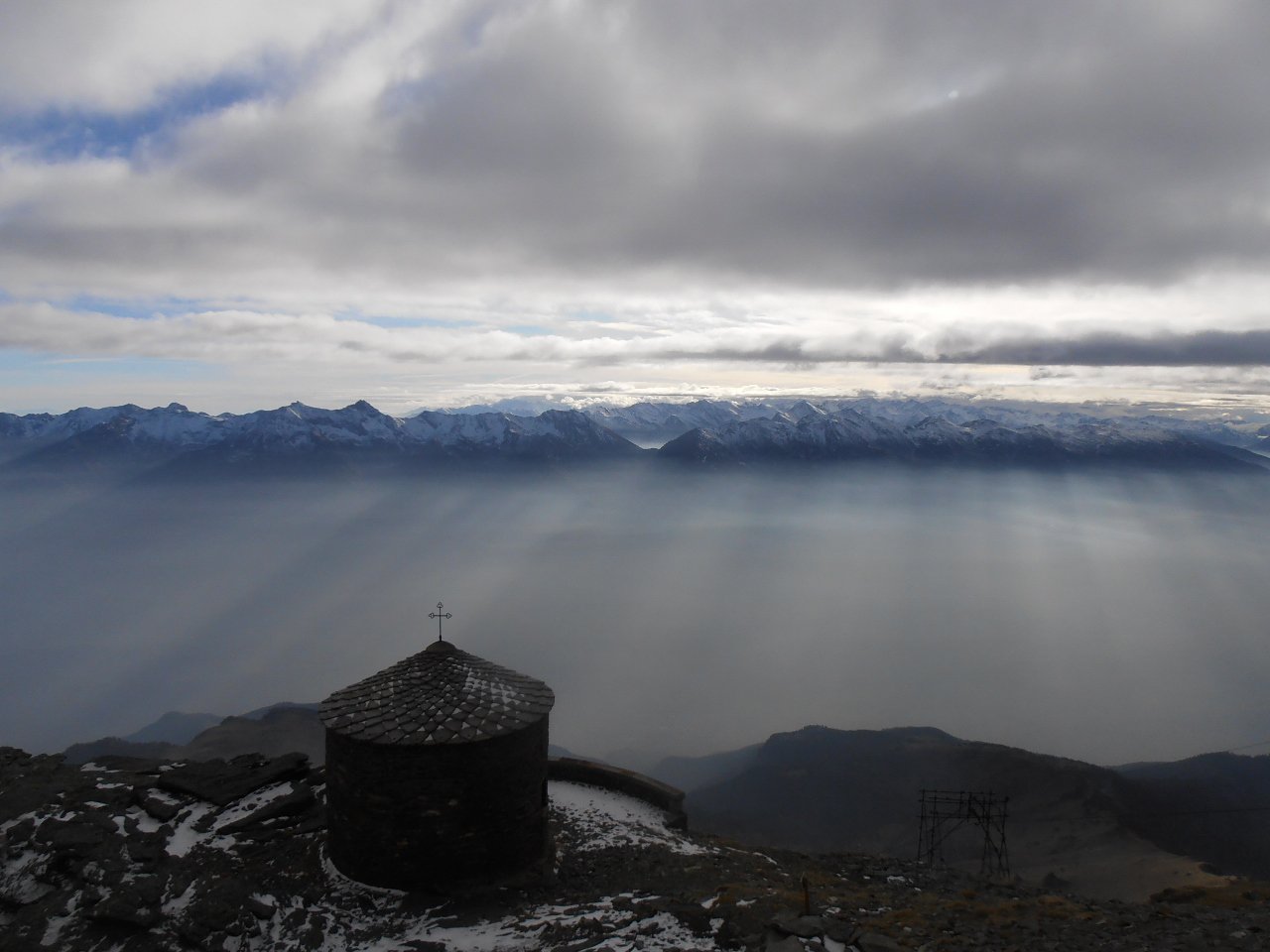 | tini | 01 - in cima Ciantiplagna sullo sfondo | tini | 02 - lago Piccolo e Frais in basso | tini | 03 - strada sotto il Gran Pelà, e Cima delle Vallette tra le nuvole | tini | 04 - dalla cima sud verso la croce di vetta a nord, pianoro in cima | tini | 05 - tratto di strada innevato sotto il lago Grande | tini | 06 - dalla cima verso la pianura | tini | 07 - dalla cima verso l'alta Val Chisone