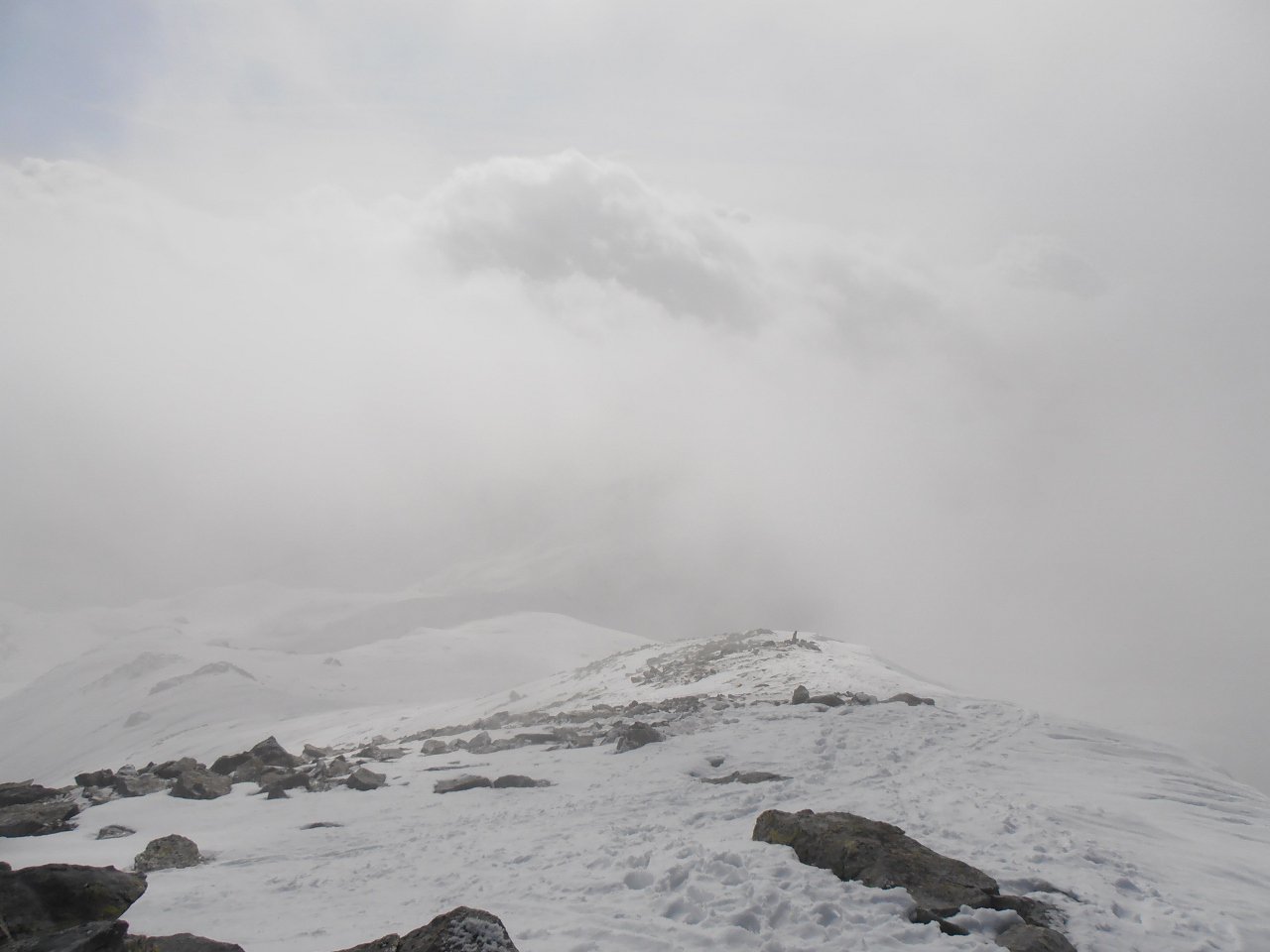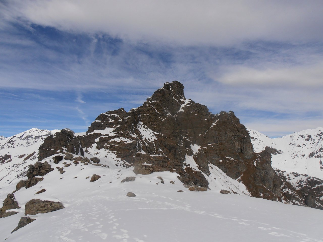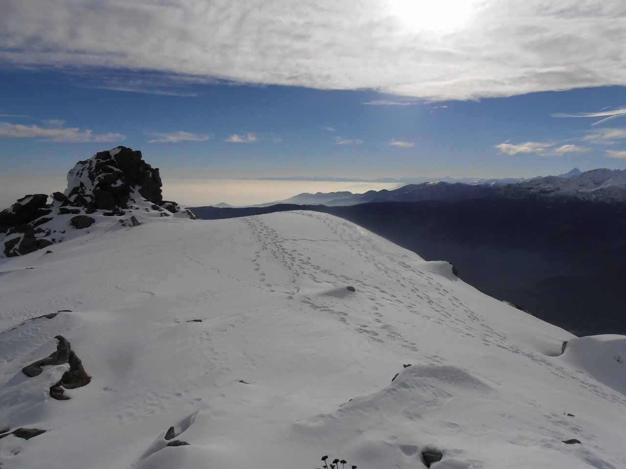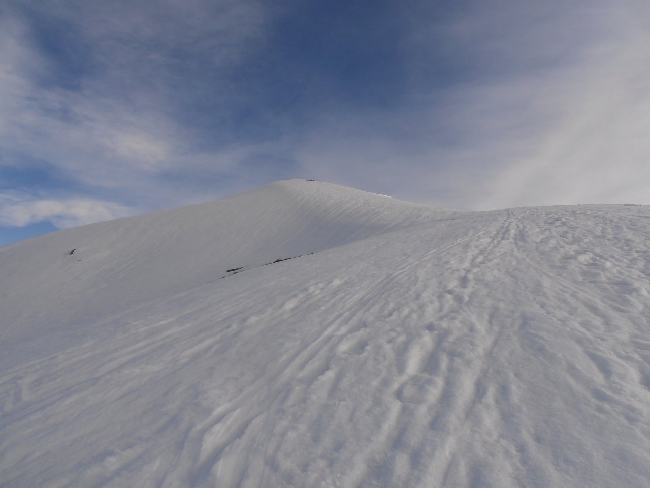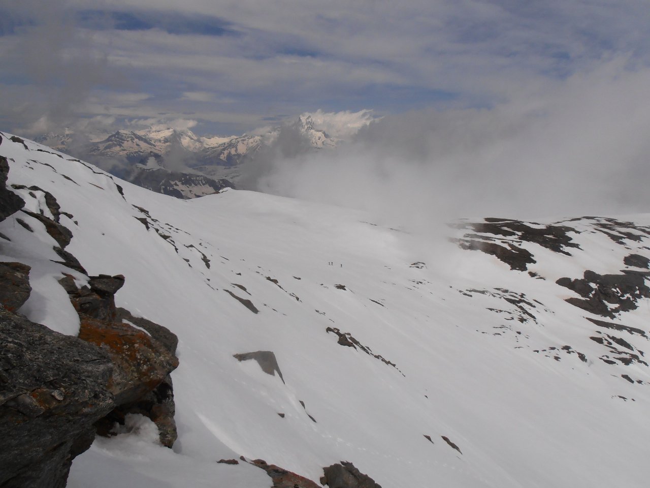 | tini | In cima, bucate le nuvole | tini | i primi 50 mt dalla cima sono consigliabili a piedi, molte rocce affioranti | tini | ci sono dei bei pendii in alto | tini | lì in mezzo si scende sci ai piedi soltanto se fortemente motivati