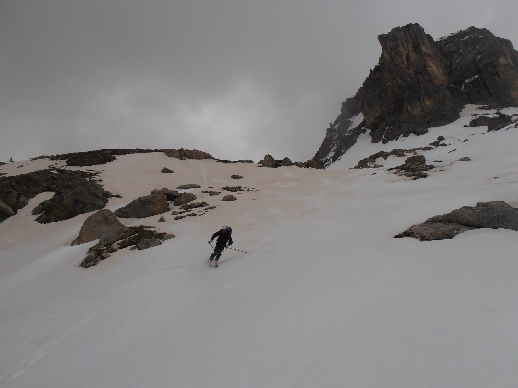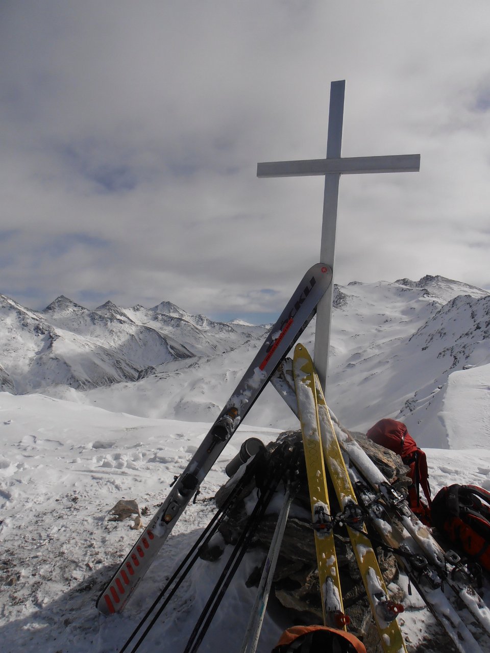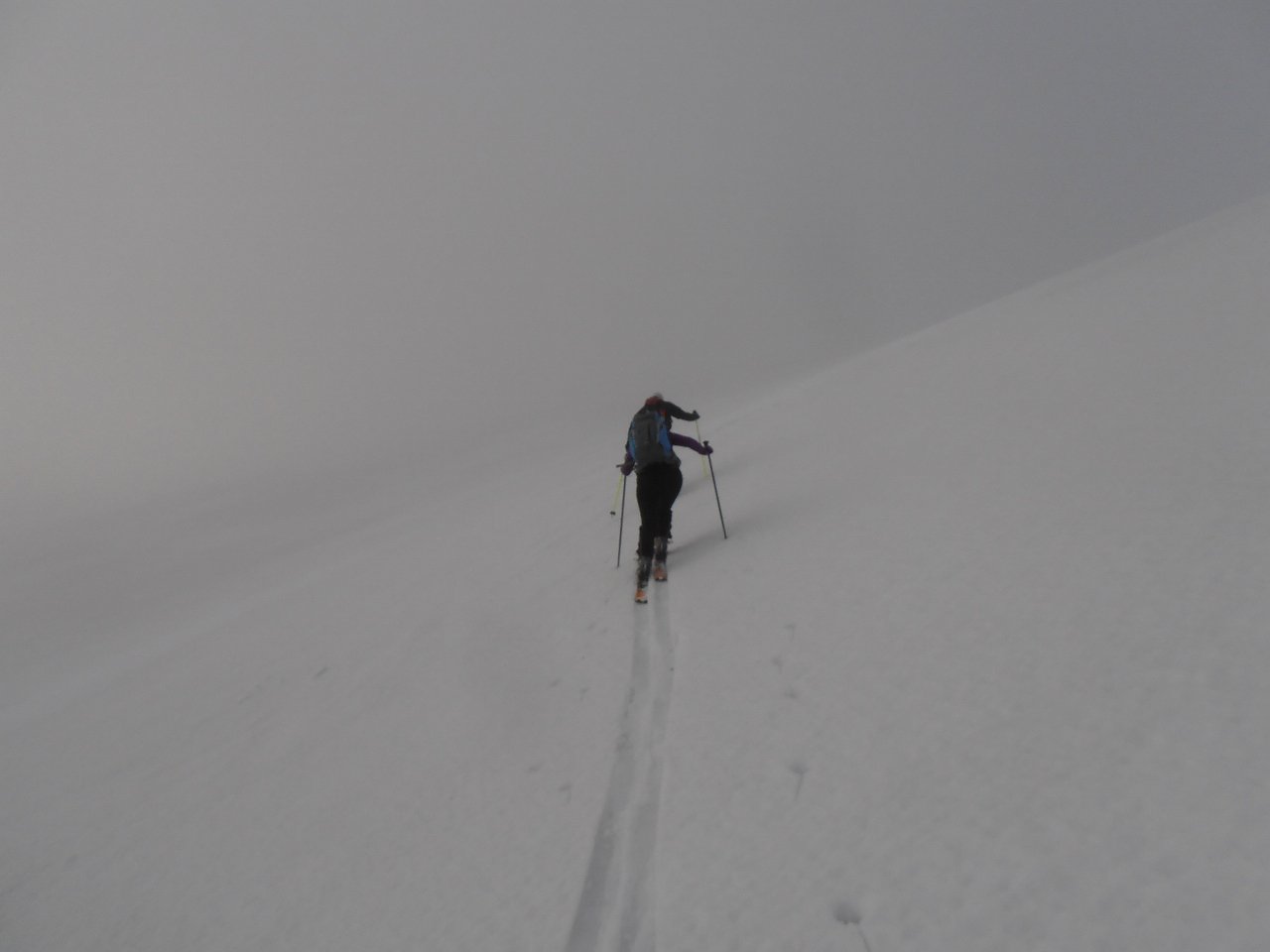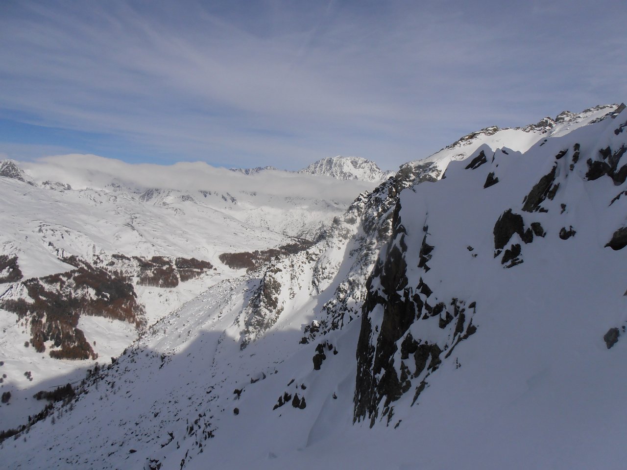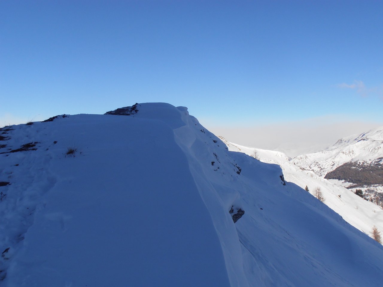 | tini | In cima, bucate le nuvole | tini | i primi 50 mt dalla cima sono consigliabili a piedi, molte rocce affioranti | tini | ci sono dei bei pendii in alto | tini | lì in mezzo si scende sci ai piedi soltanto se fortemente motivati