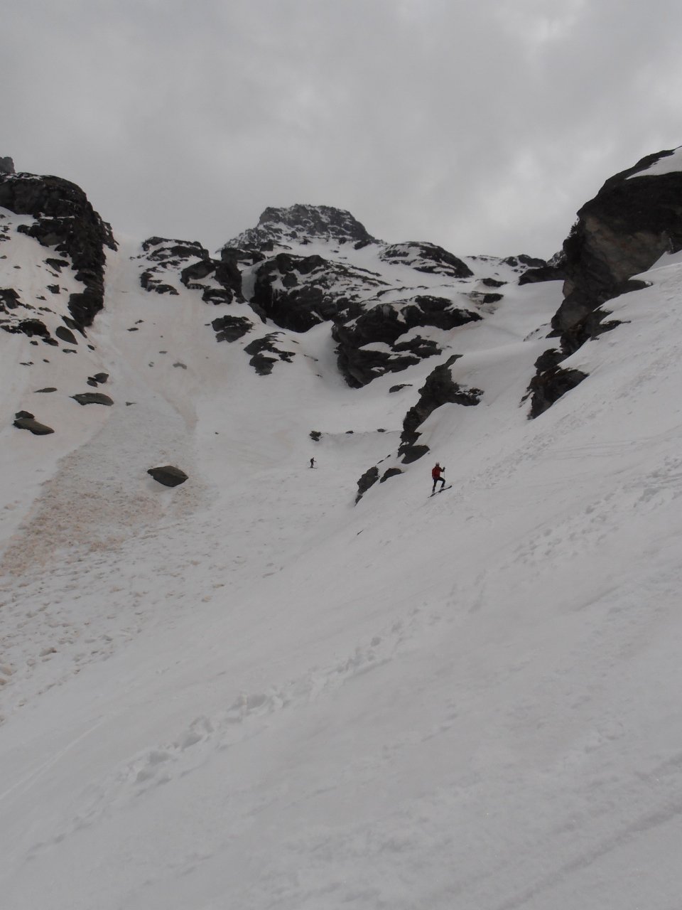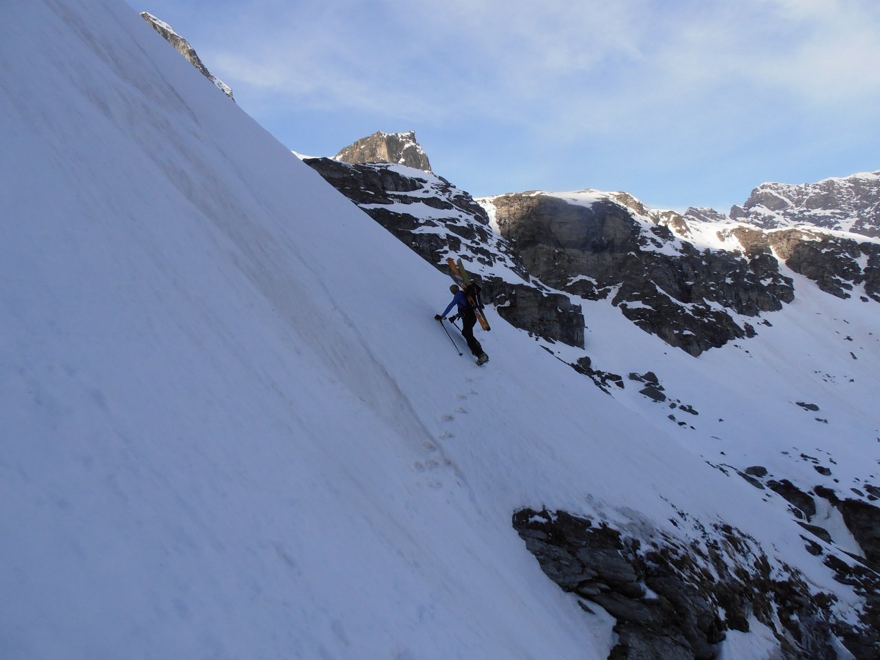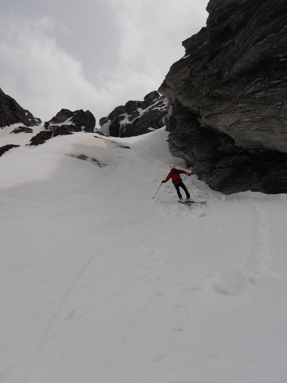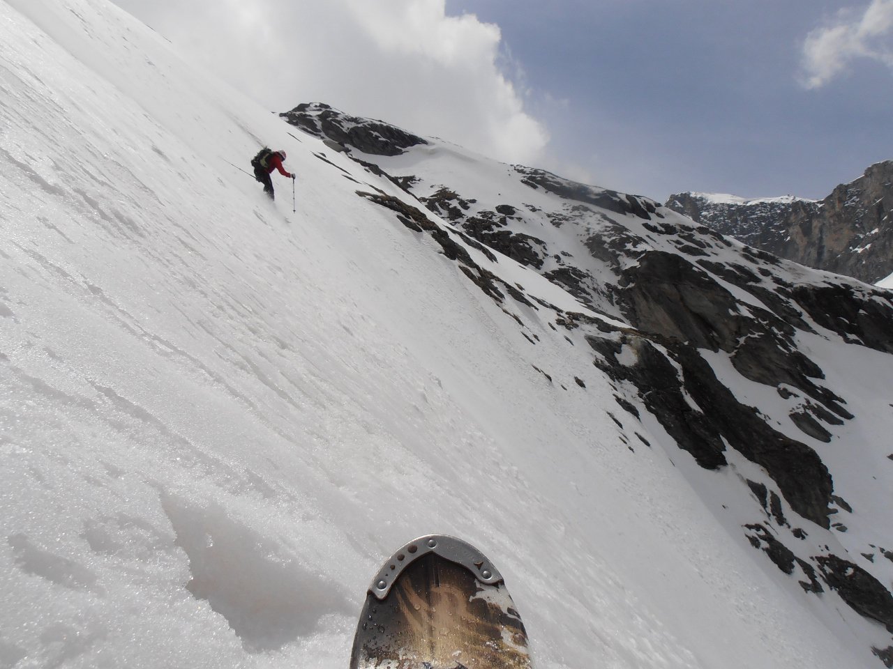 | tini | 01 - Enrico su un passaggio alpinistico esposto nella parte bassa | tini | 02 - pendio di discesa sui 40 gradi abbondanti | tini | 03 - inizio gita, luci del mattino sul fondovalle | tini | 04 - Pasquale sulla rampa finale per la cima | tini | 05 - canalino, picca e ramponi | tini | 06 - Enrico apre la via nel canalino | tini | 07 - Enrico arriva in cima | tini | 09 - Daniele e Teddy a metà ed inizio del pendio ripido | tini | 10 - neve primaverile | tini | 11 - passaggio con gli sci del traverso esposto | tini | 12 - non ci siamo fatti mancare nemmeno il canalino | tini | 13 - fine parte tecnica, abbiamo sciato lì in mezzo
