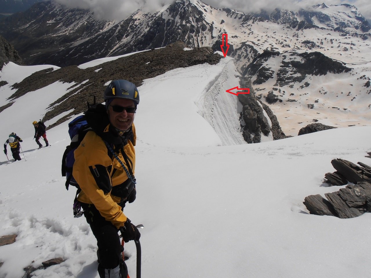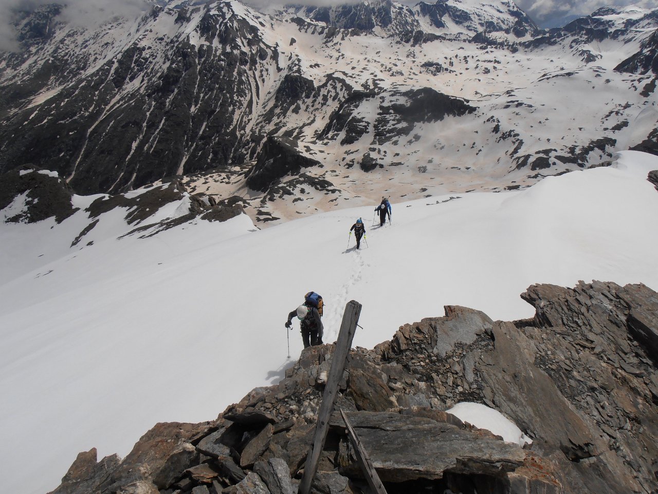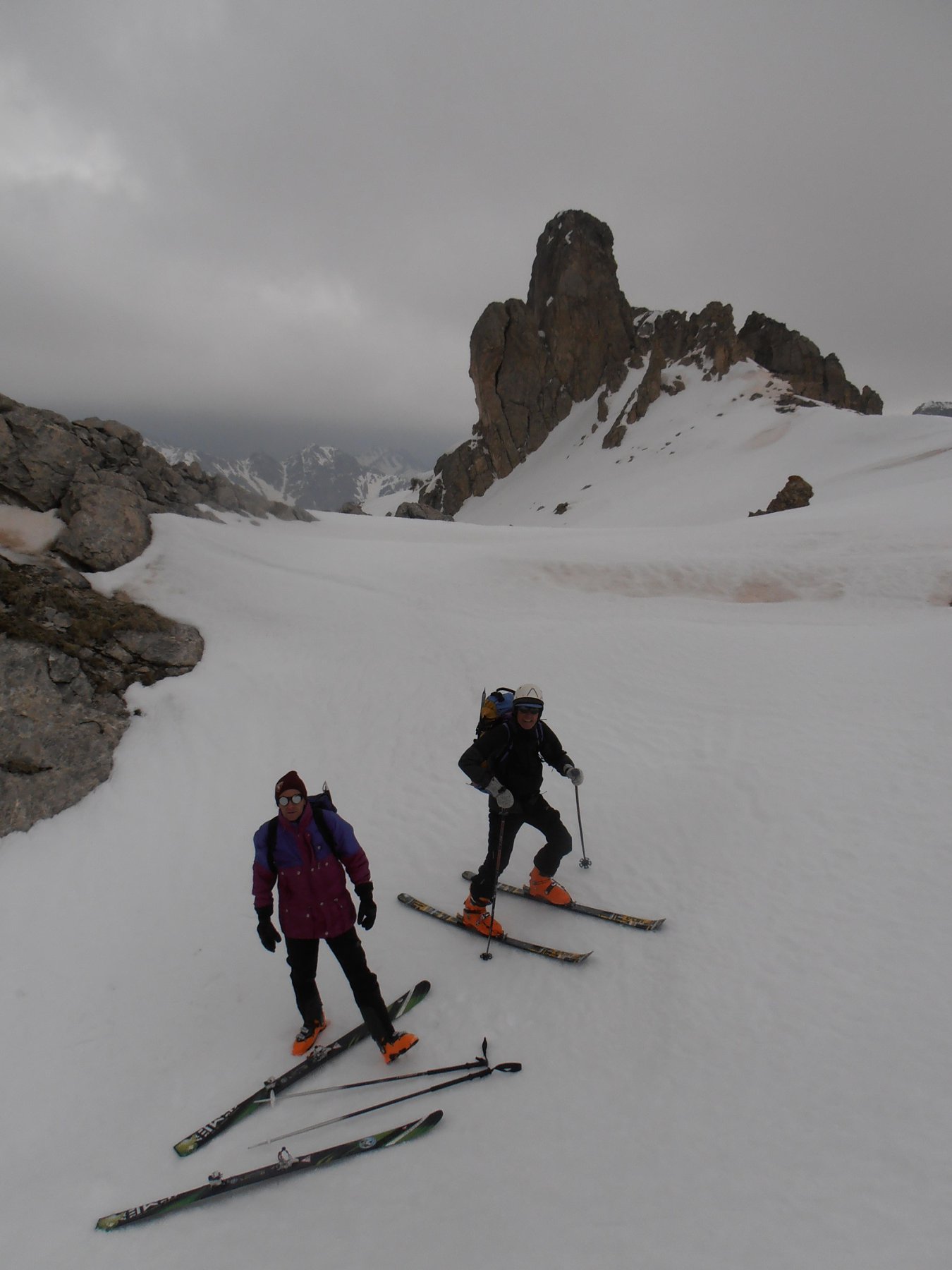 | tini | 01 - quasi arrivati | tini | 02 - il muro iniziale della discesa a Nord | tini | 03 - visione d'insieme della salita sul grande cengia in mezzo alla parete sud | tini | 04 - arrivo sulla spalla scialpinistica | tini | 05 - parte iniziale discesa sul versante Nord | tini | 06 - strettoie tecniche nella parte bassa della discesa a Nord | tini | 07 - in discesa, esperienza | tini | 08 - in discesa, eleganza
