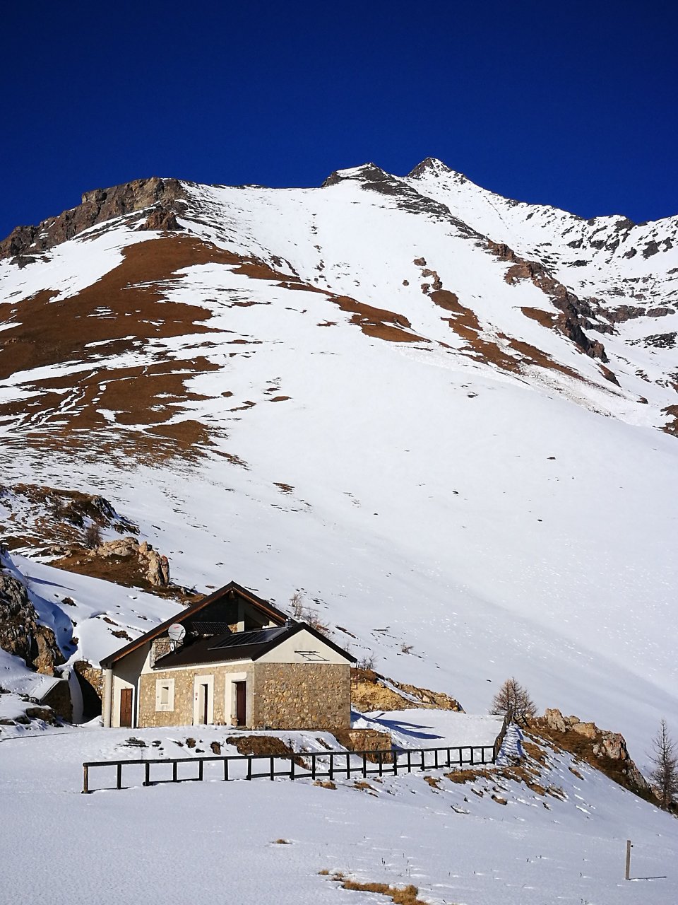 | tini | Il Refuge Napoleon visto dalla zona del Col de l'Izoard | tini | L'Arpelin apparso un attimo tra le nuvole, buona parte dei pendii e spoglia dalla neve | tini | In discesa i tagli dei tornanti sono belli, ma ce ne sono un paio che costringono a peripezie per tornare sulla strada...