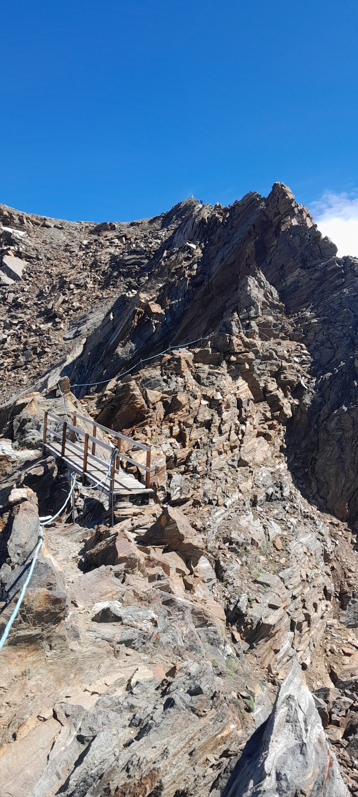 Percorso privo di neve, le rocce lungo la cresta attrezzata oggi erano completamente asciutte, come il resto del percorso, quindi non presentavano nessun problema
