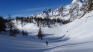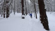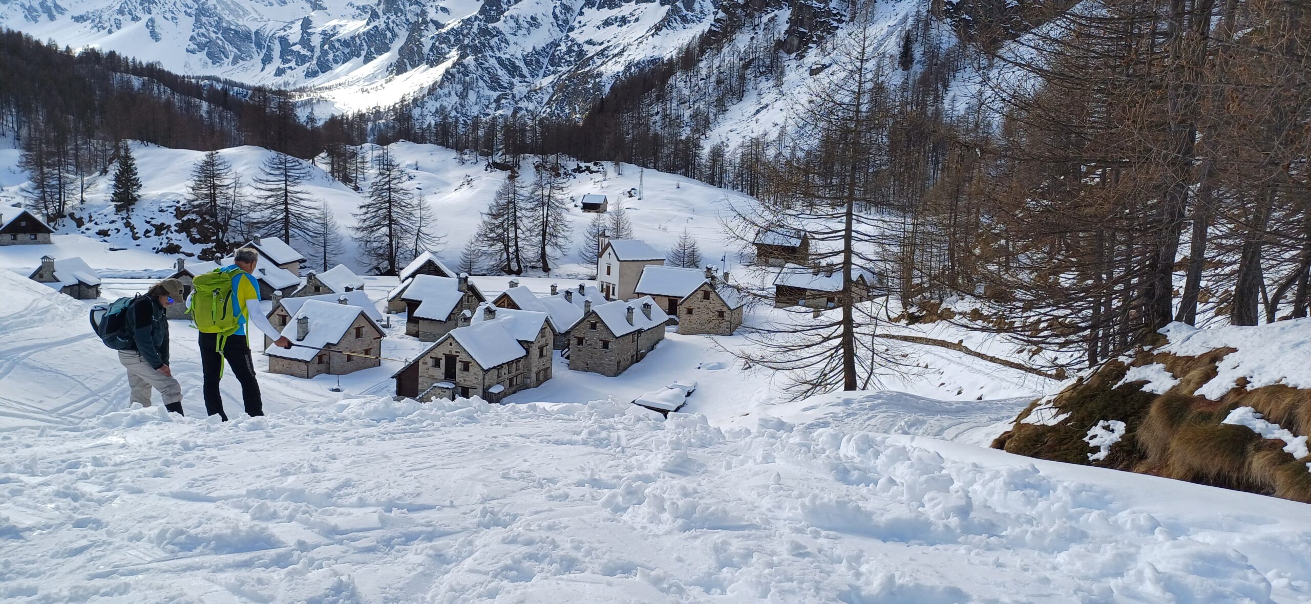 Si arriva in auto a quota 1400, 10-15 minuti di portage e si mettono gli sci. Malgrado le temperature alte, la neve è sempre portante…