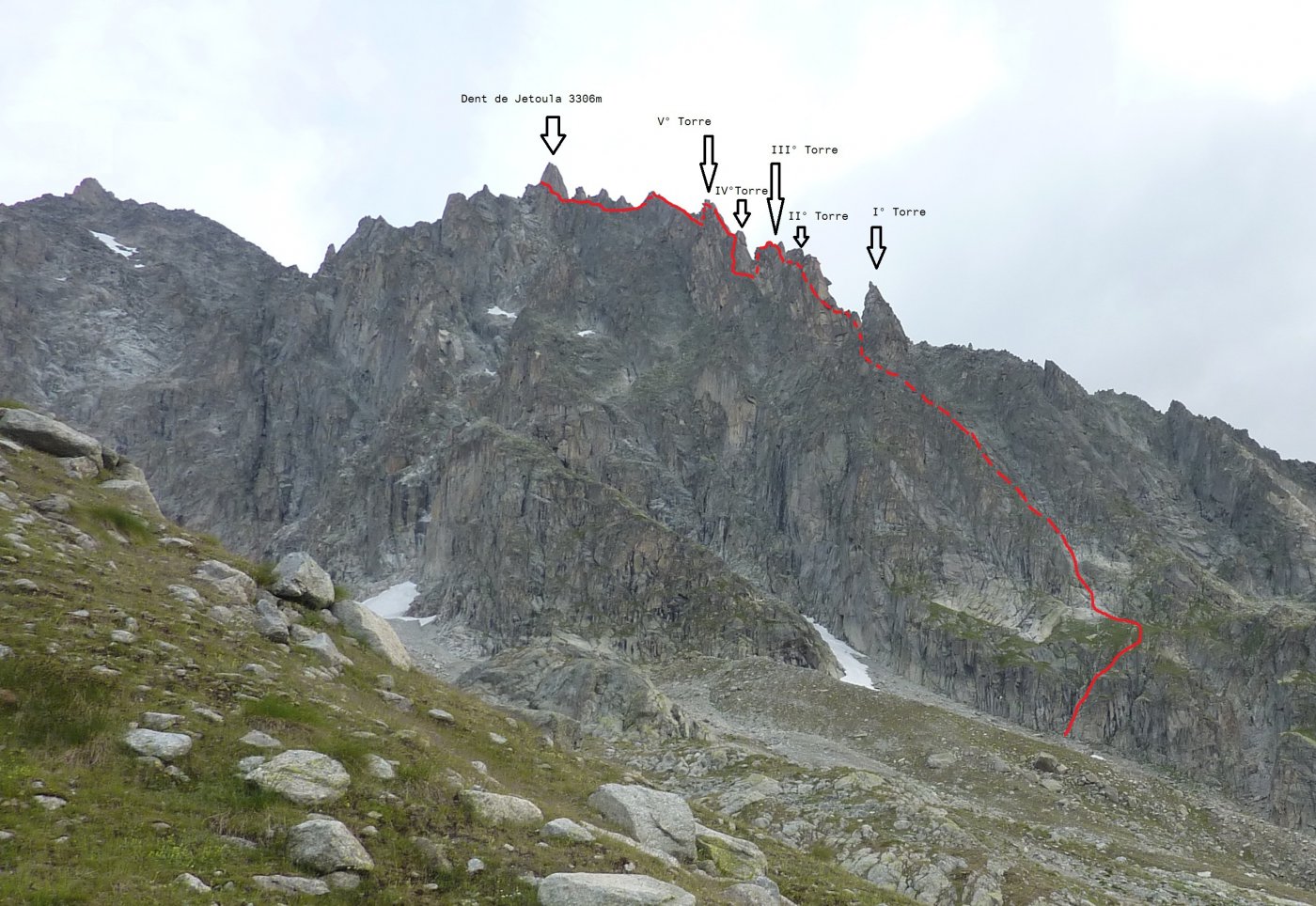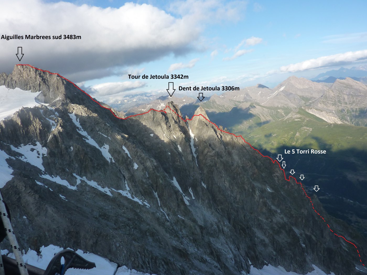 | tommyf | Gran parte del tracciato | tommyf | dettaglio itinerario | tommyf | tutto il tracciato | tommyf | Il tiro della terza torre | tommyf | parte del tracciato visto dalla quinta torre | tommyf | L'aggiramento del Dente | tommyf | La Tour de Jetoula e la cresta appena percorsa, vista dall'attacco dell'ultimo pendio che sale alle Marbrees