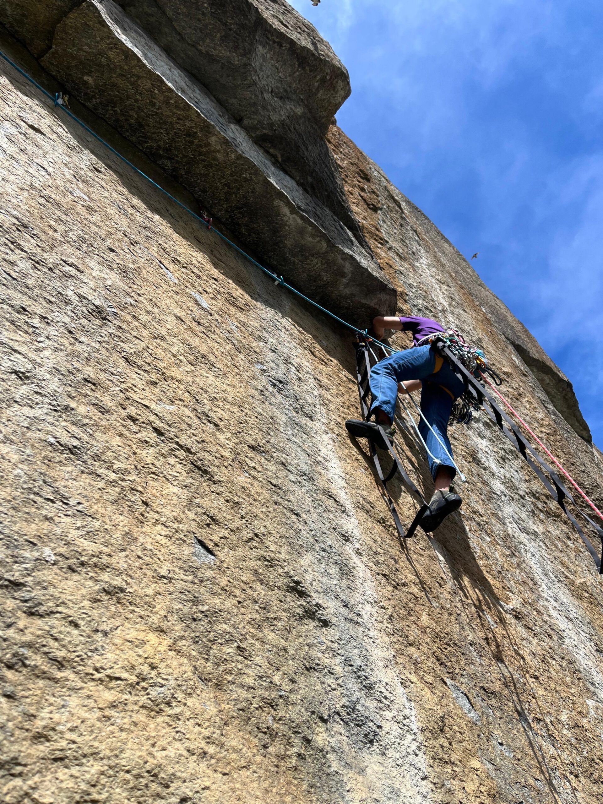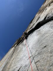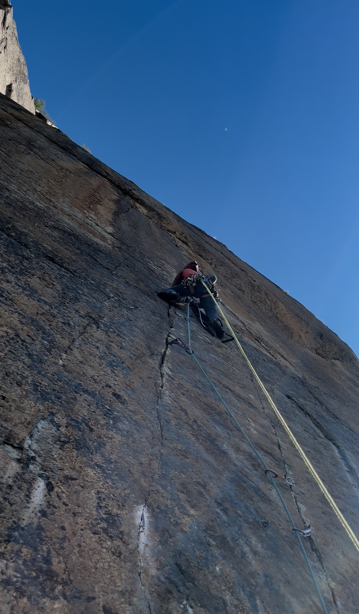 Siamo saliti in serata pernottando nella cengia mediana. Il giorno successivo abbiamo salito gli specchi in artif. Per L4 prevedere diverse misure piccole: tripli 0.1…