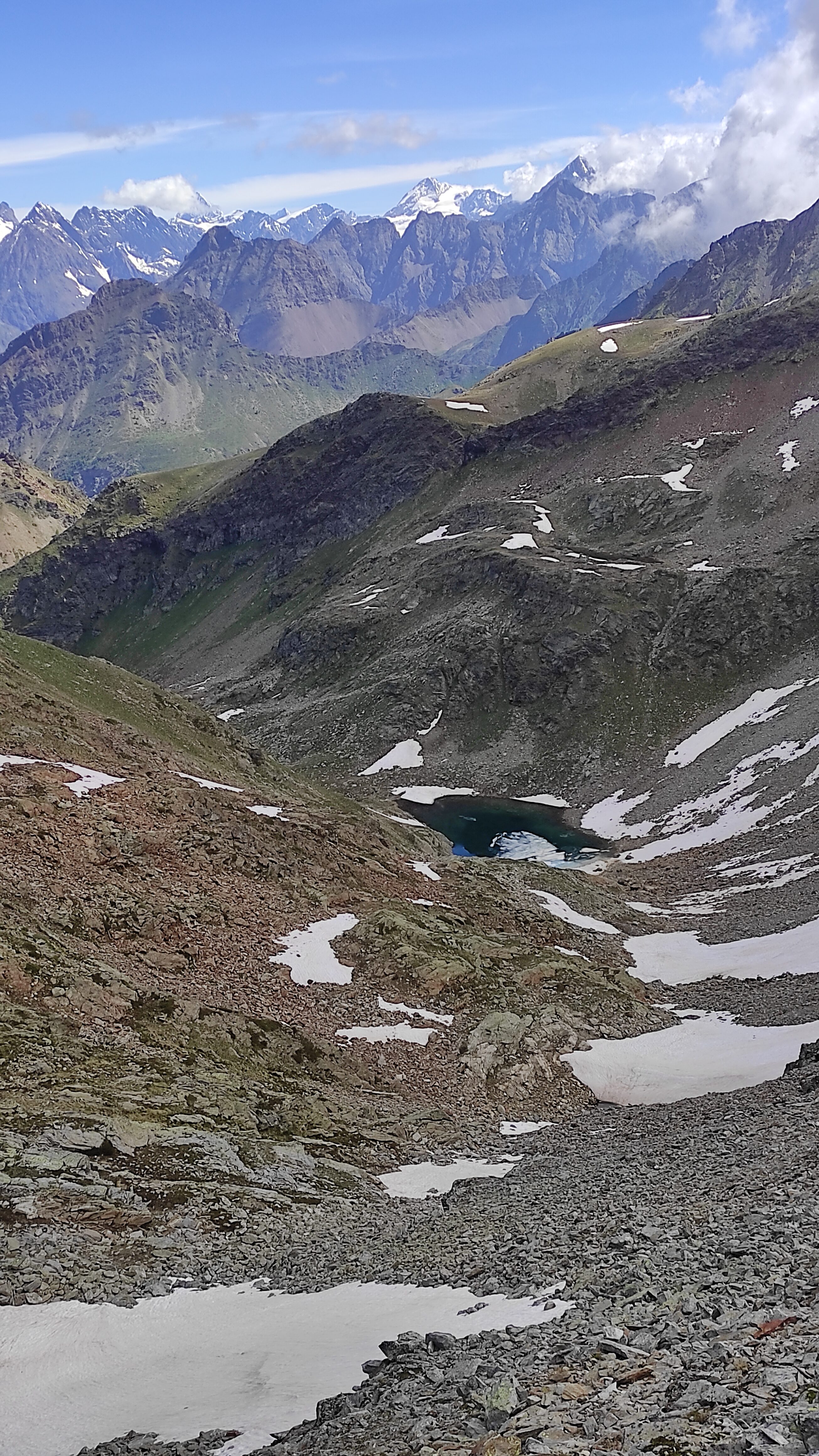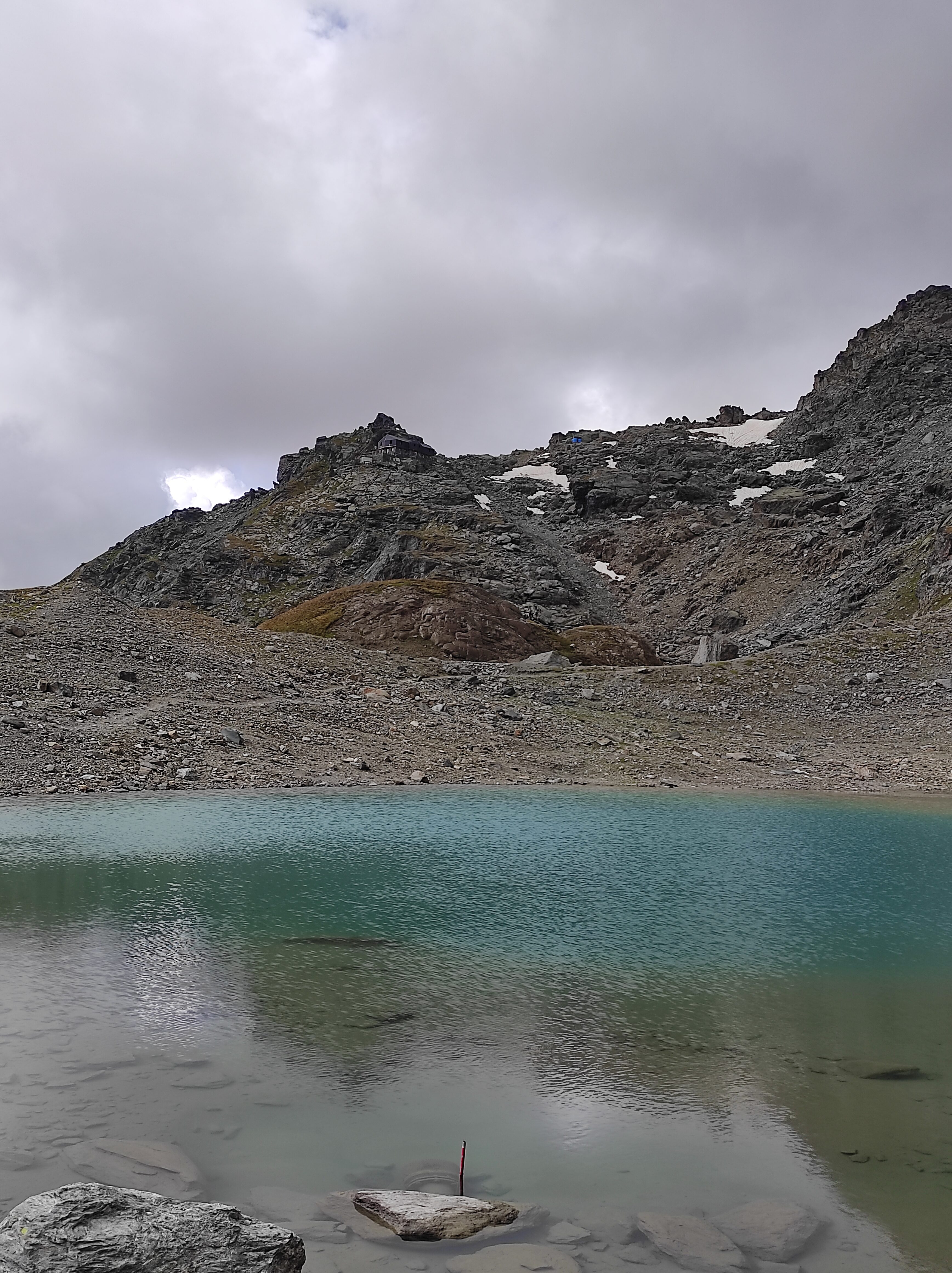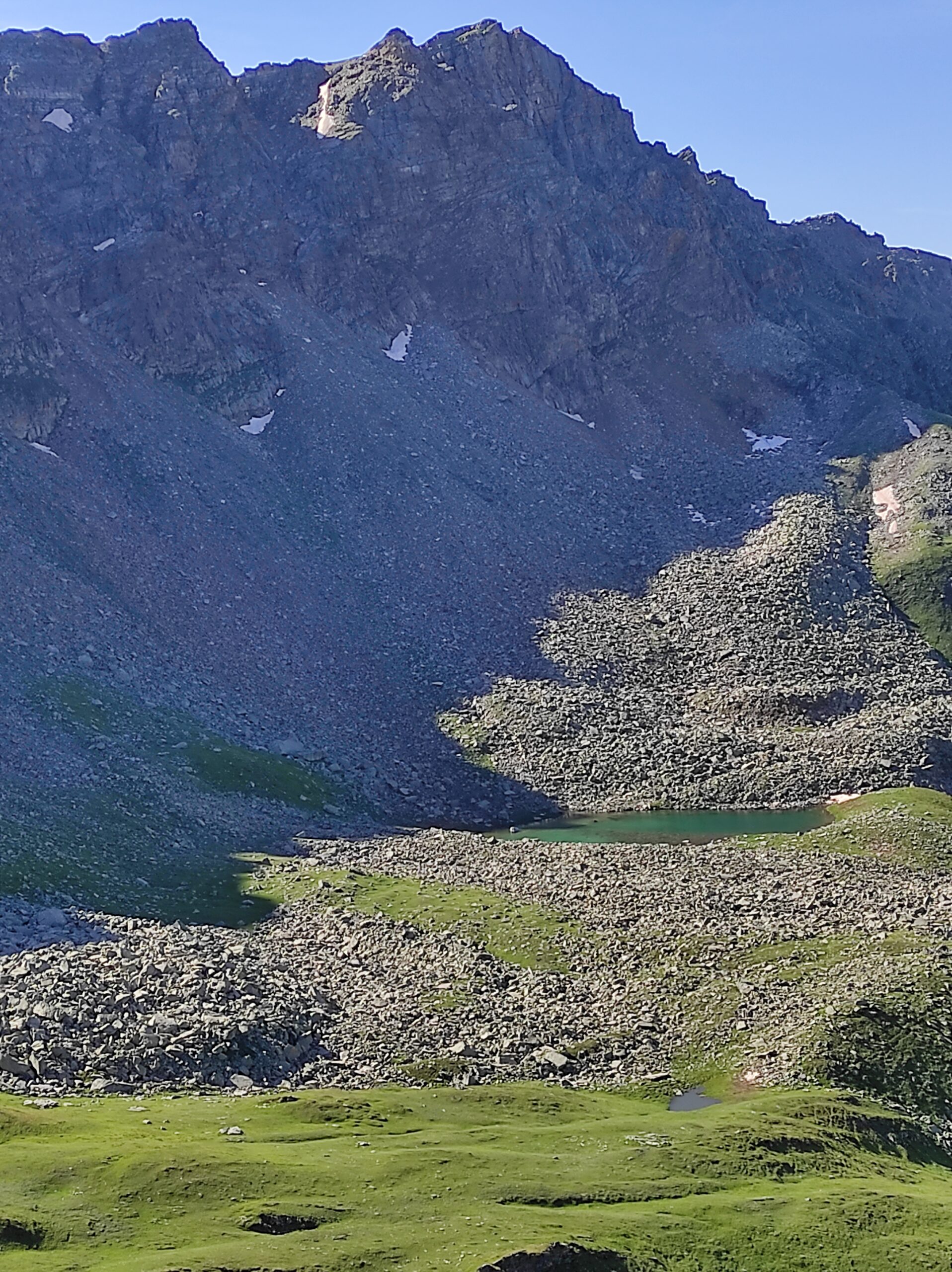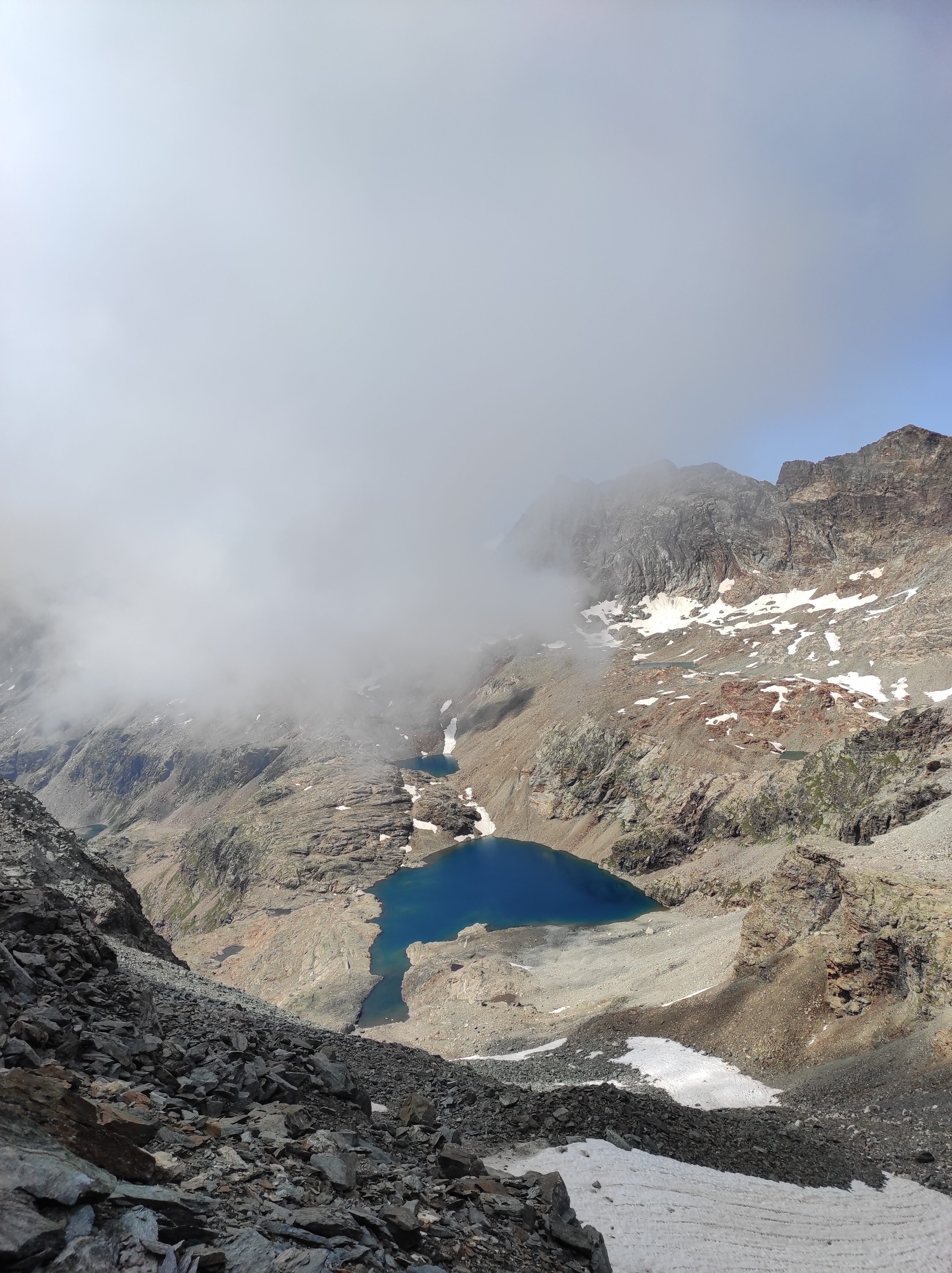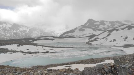 Fatto il giro inverso rispetto alla descrizione......trovato un nevaio prima del colletto.....e nella prima parte di discesa.......salito sulla morena fino al Lago.......
