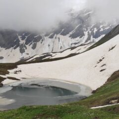 Percorso fino all'Oilletta un nevaio aggirabile......per la Punta Leysser ancora presente alcuni nevai che non danno alcun fastidio.....non fatto giro ad anello........Lago Leysser ancora…